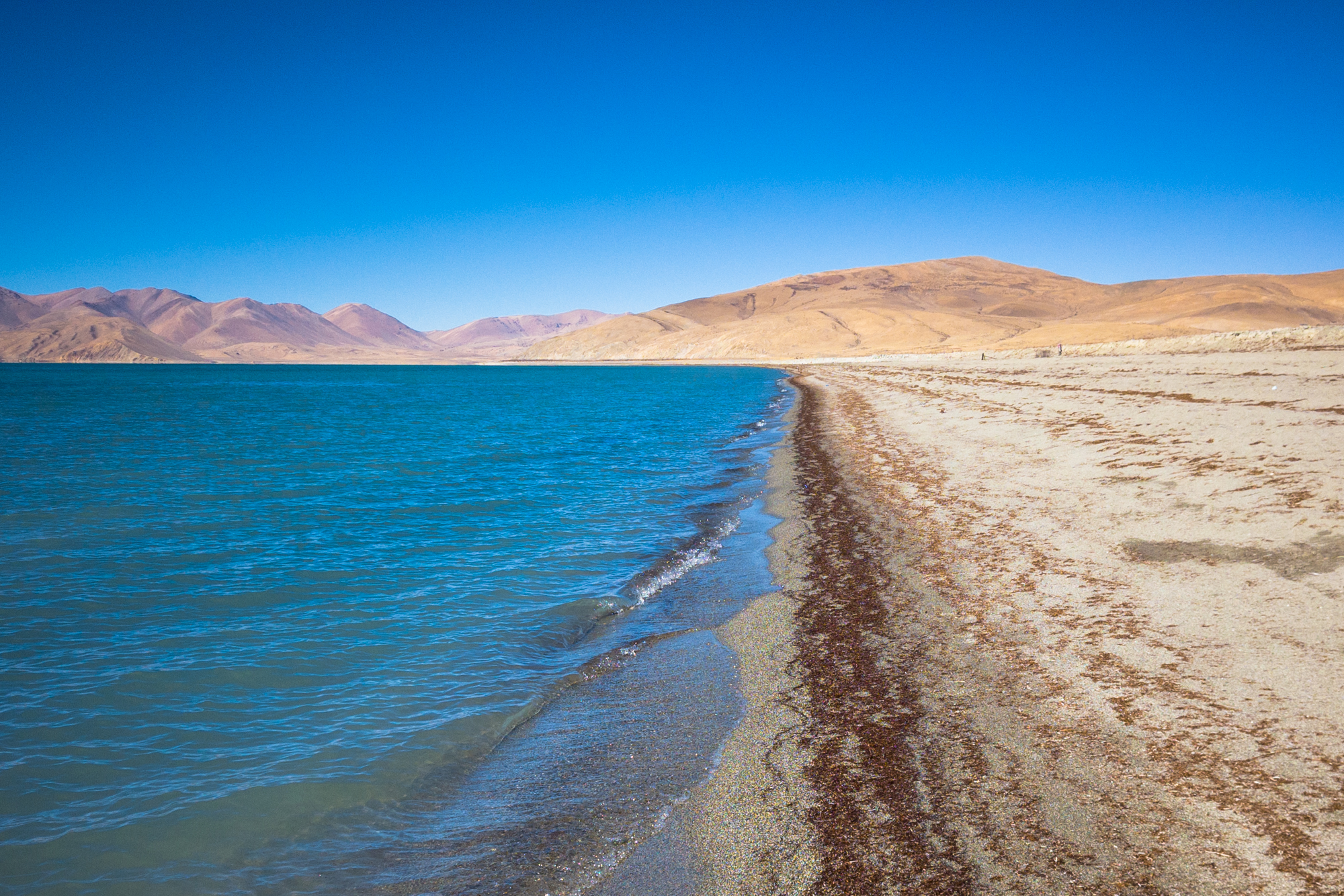 普姆雍措的颜色是一种纯粹的蓝,不含任何杂质,所以很多人执着于冬季的普姆雍措,那个时候湖水结冰,形成其特有的“蓝冰”,映着远处库拉岗日雪山的耀眼洁白,仿佛置身一片蓝色幻梦中。