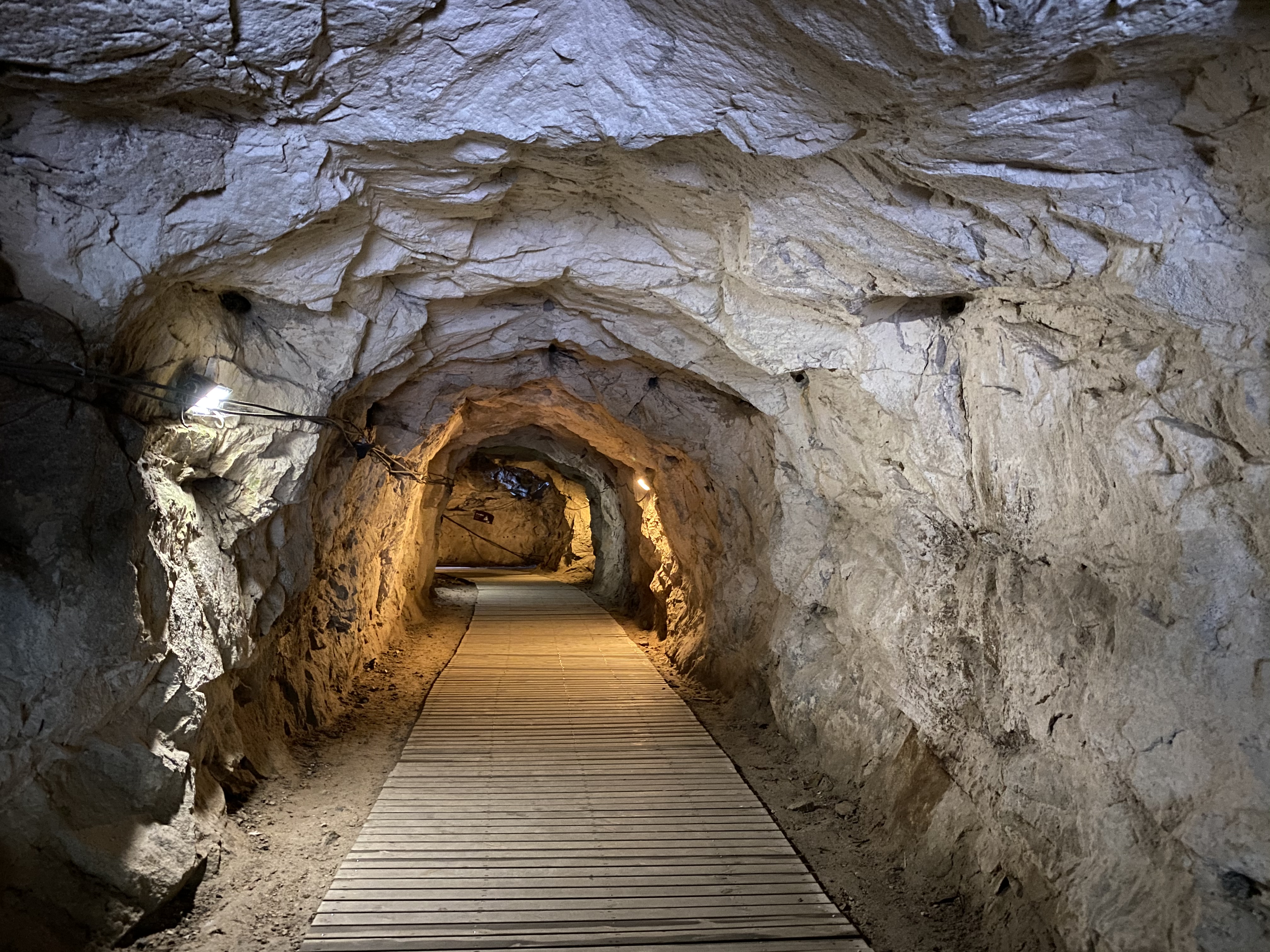 悬空栈道很长,像是缠在半山腰的一条冗长的腰带,绕着一座座山脉,也把它们串起来。说冗长,是因为初秋的山谷中间只有绿色,走几步就视觉疲劳了。显然景区的开发人员早就想到我们前面,每走一段路就会出现一段矿洞路,是曾经采矿的遗址。矿洞里跟外面温差明显,矿洞壁冰冷潮湿,手一摸就是一层水珠。