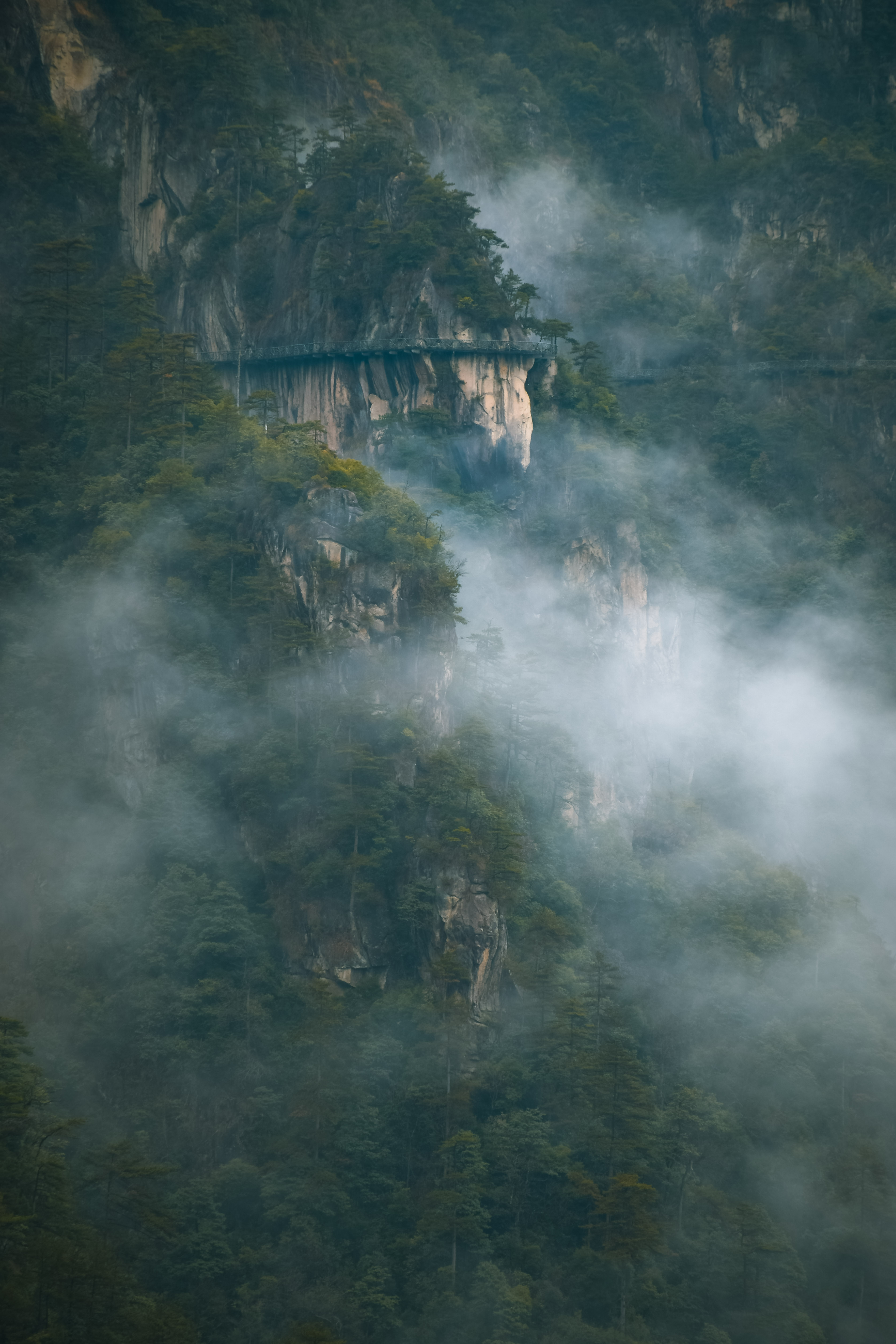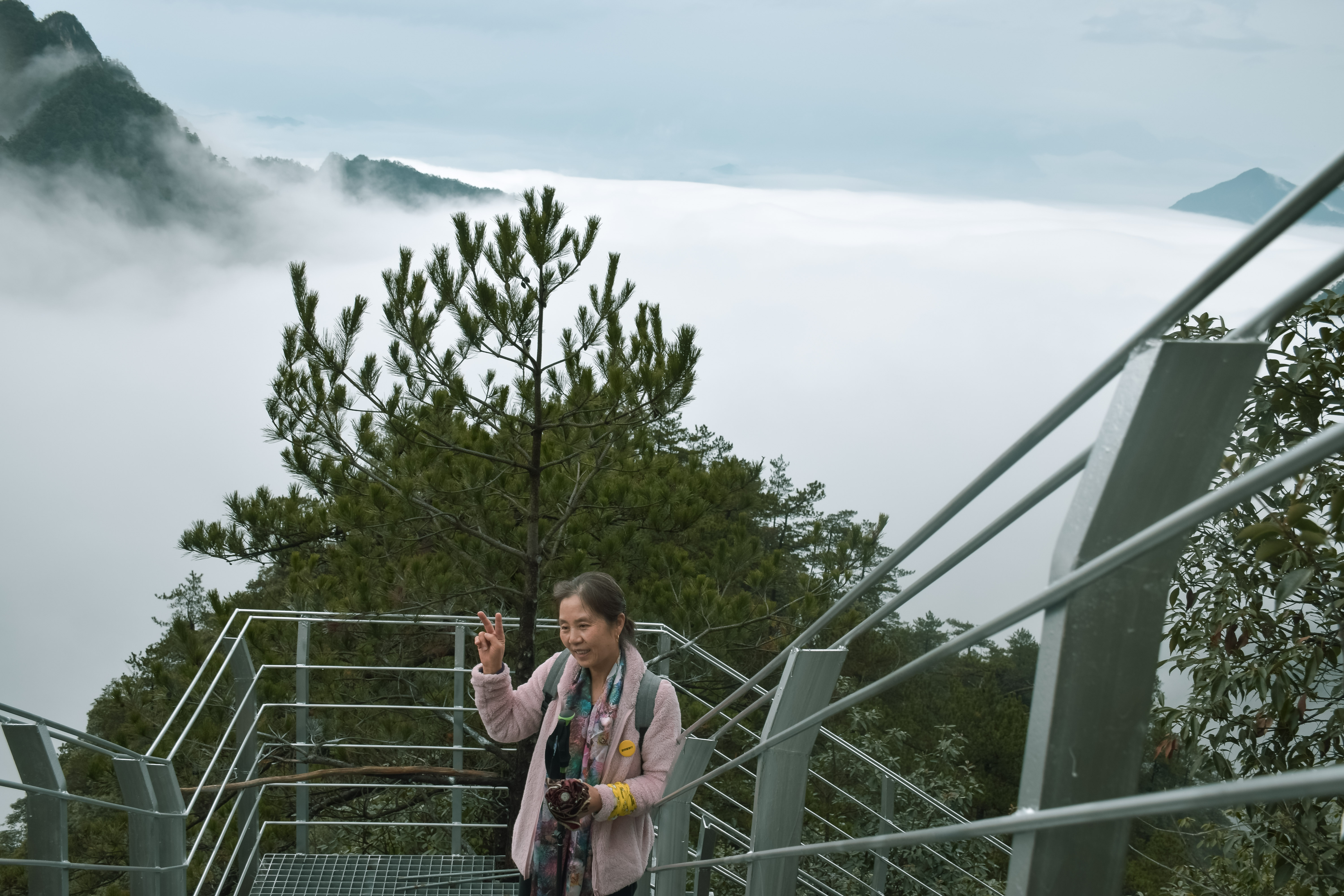 刚开始爬的时候我还健步如飞,抱着相机左窜右窜拍拍停停,甚至一步两个台阶还小跑(我反省),本菜鸡不愧是菜鸡!雨雾中的山景朦朦胧胧,湿度很大,但温度刚好,还挺舒服的。