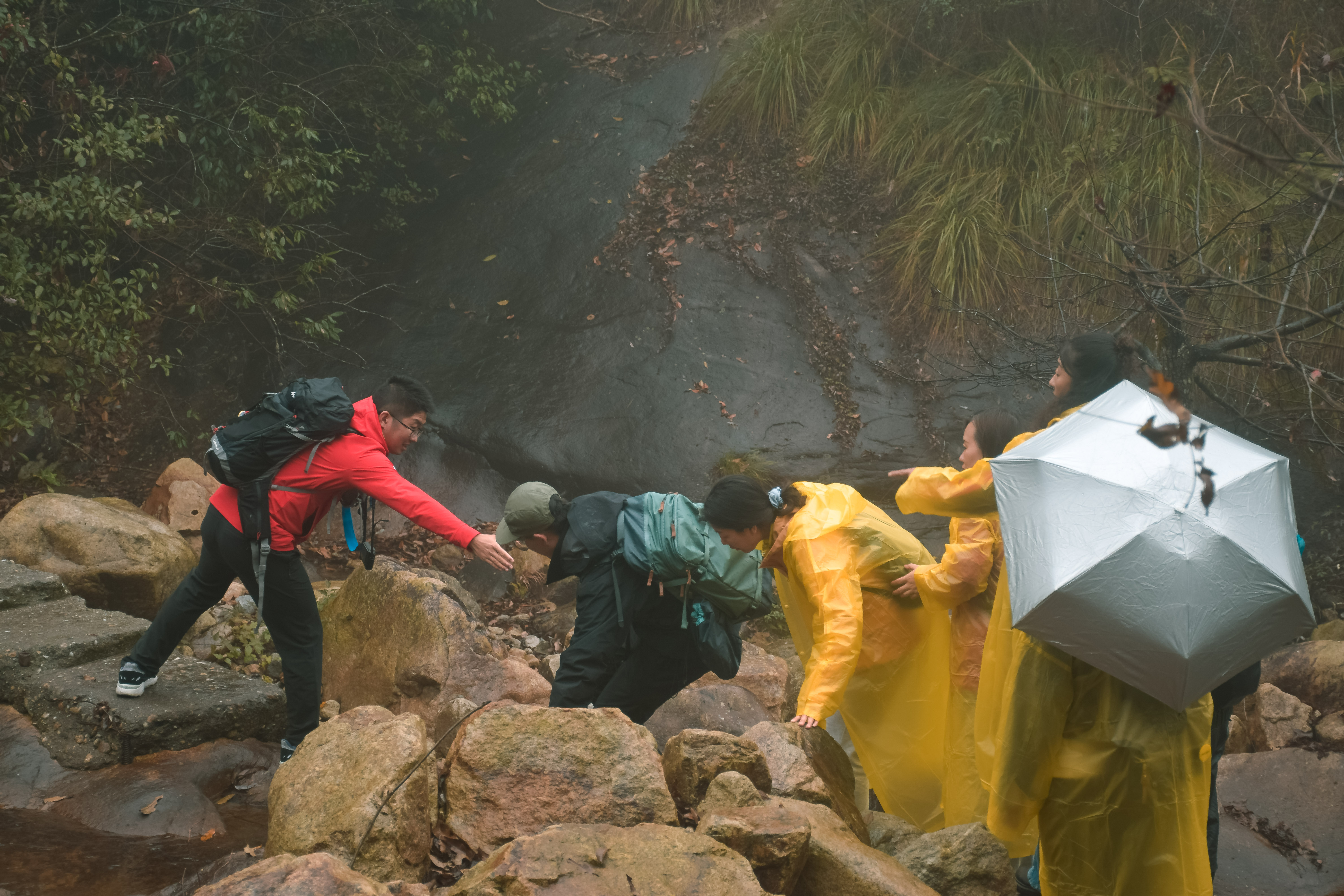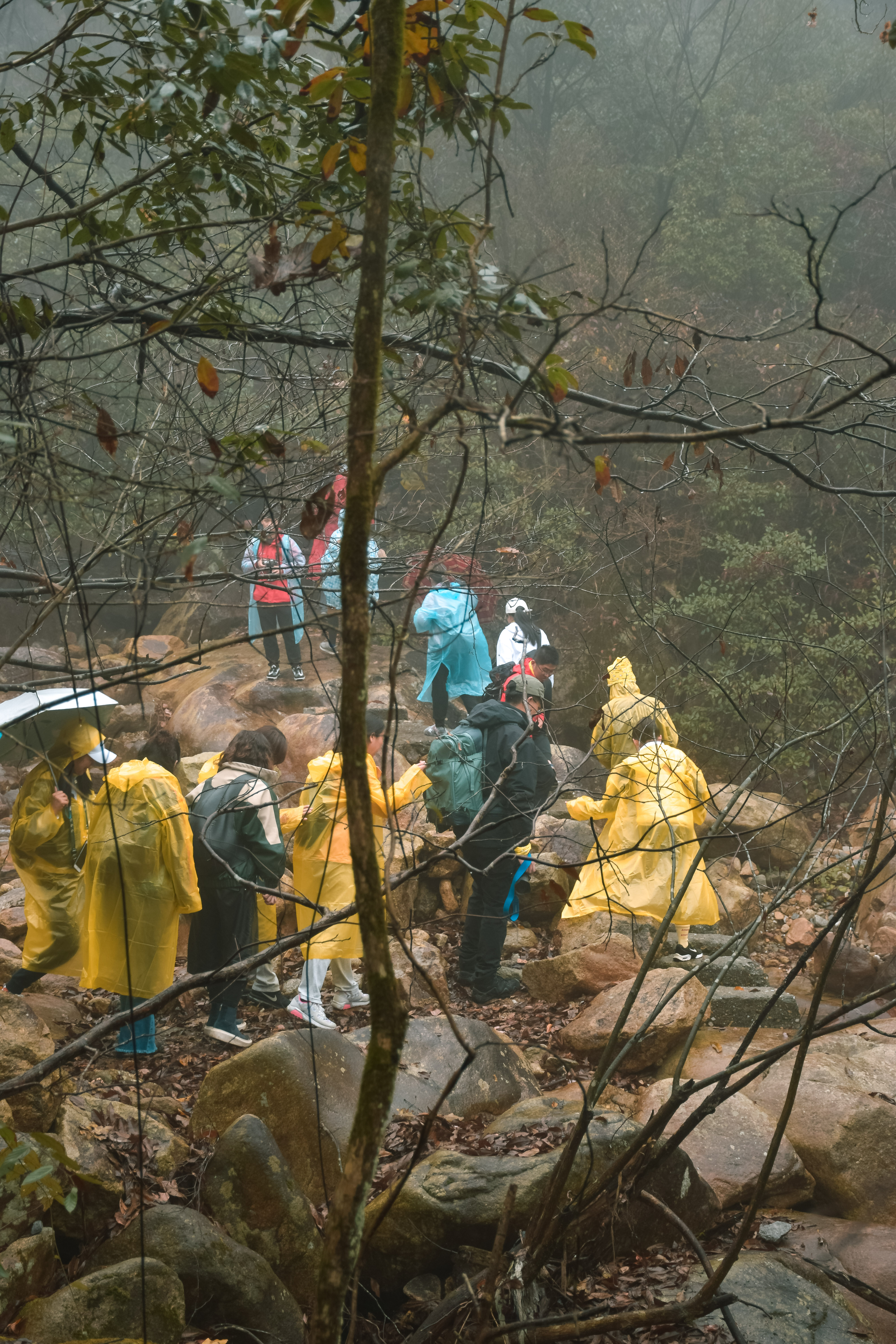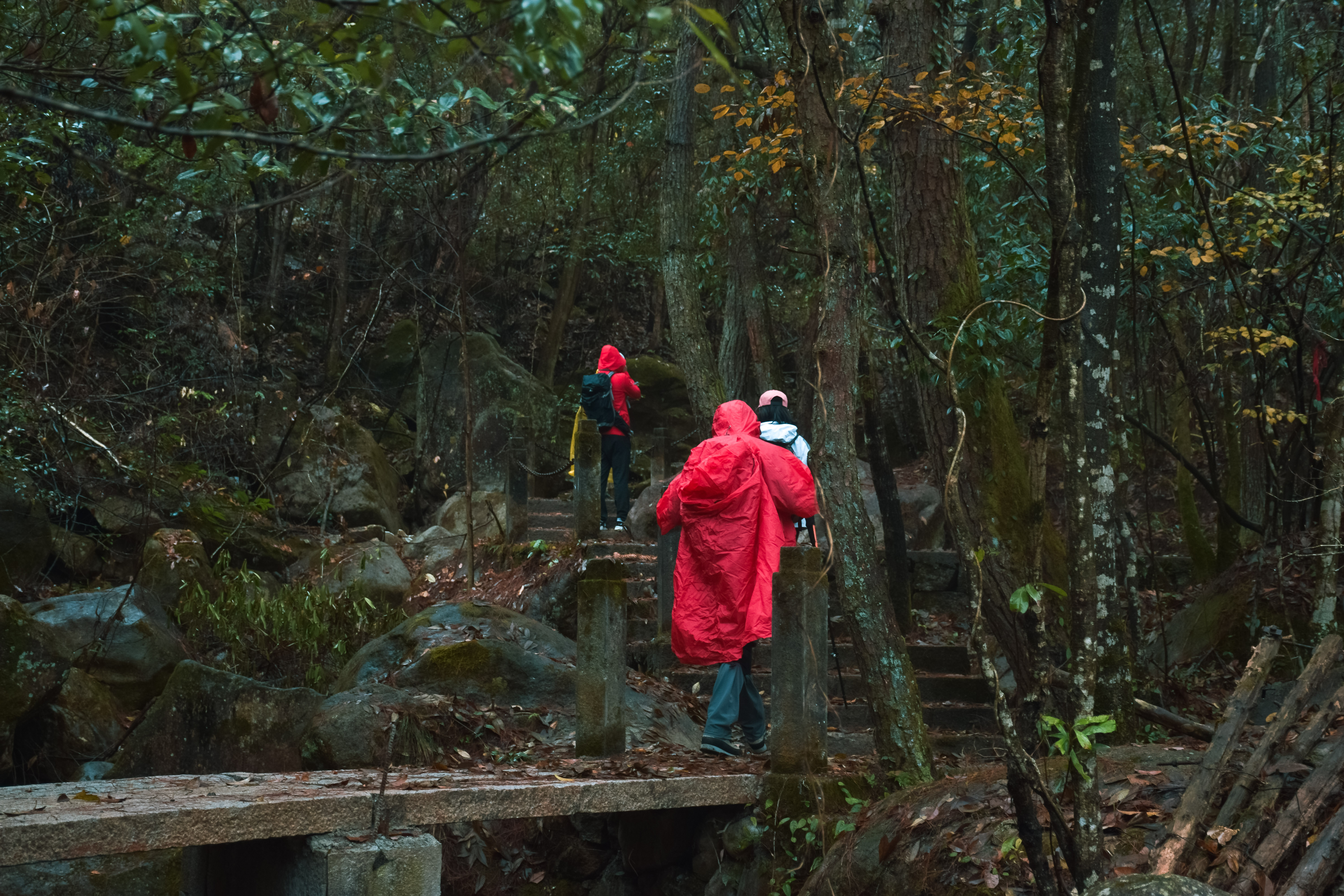 刚开始的一段石头台阶上都是潮湿的密密青苔,木制的线路牌上落满了雨打的枯叶,大家穿着雨衣在朦胧小雨中走走停停各自享受,是和晴天完全不一样的山。