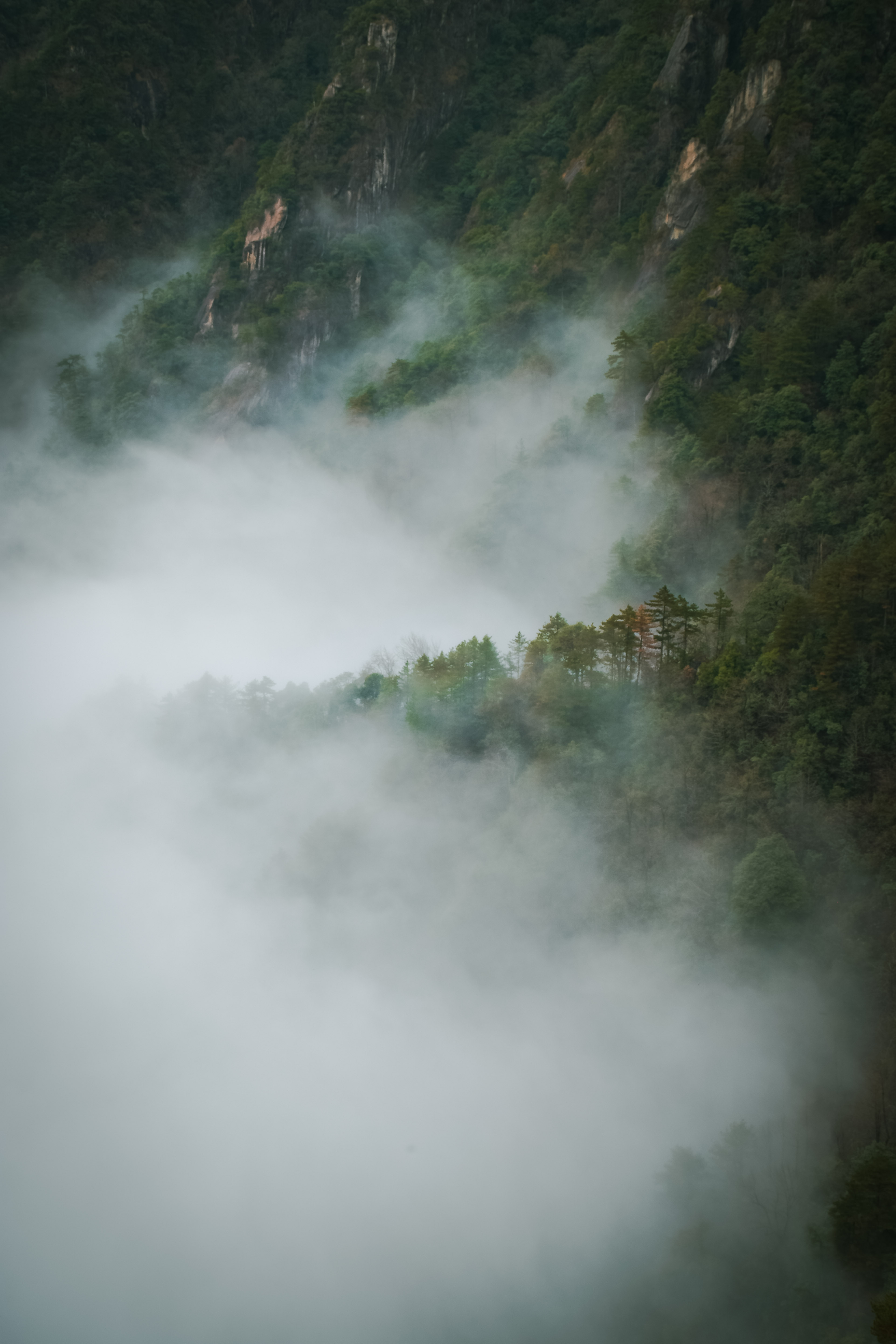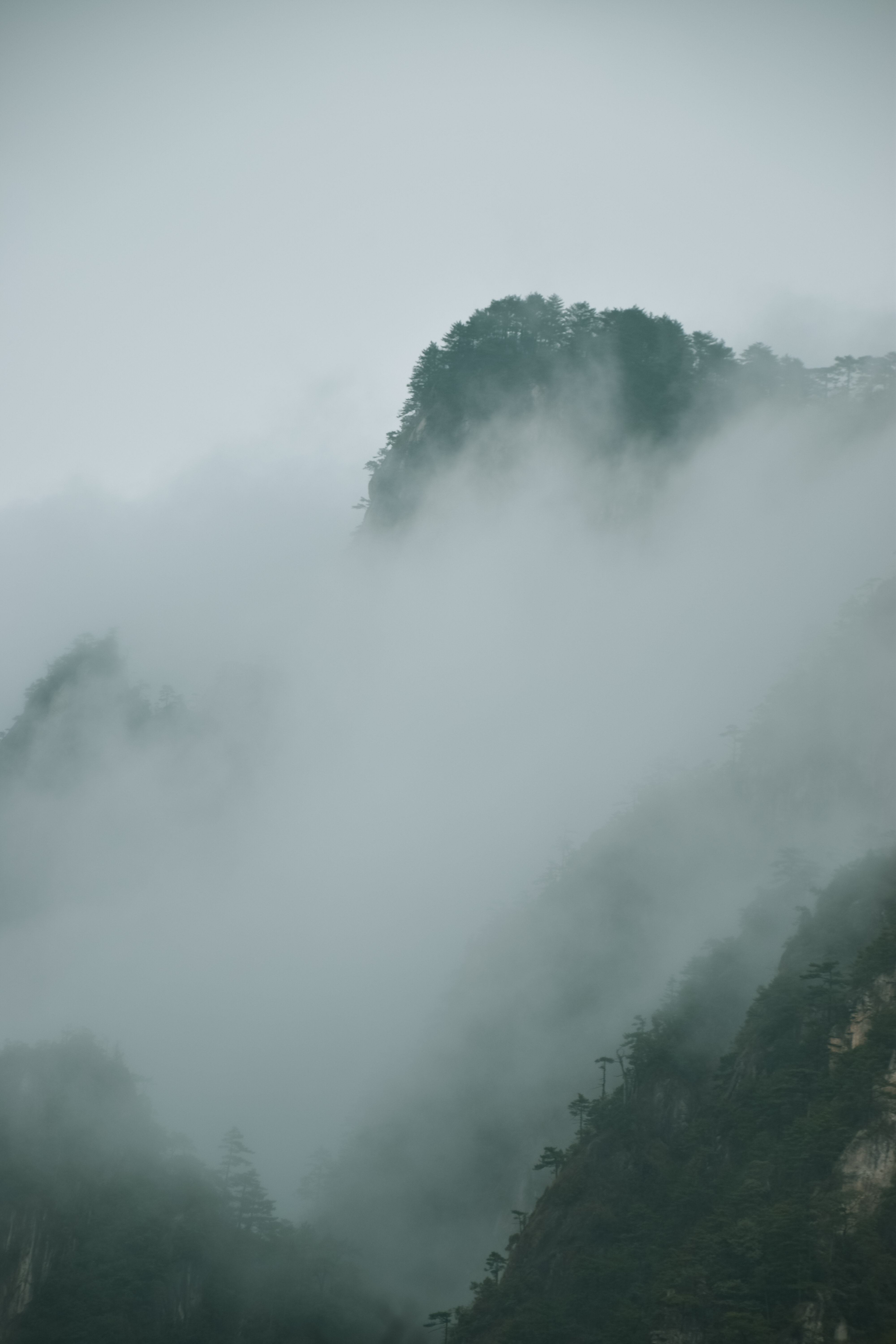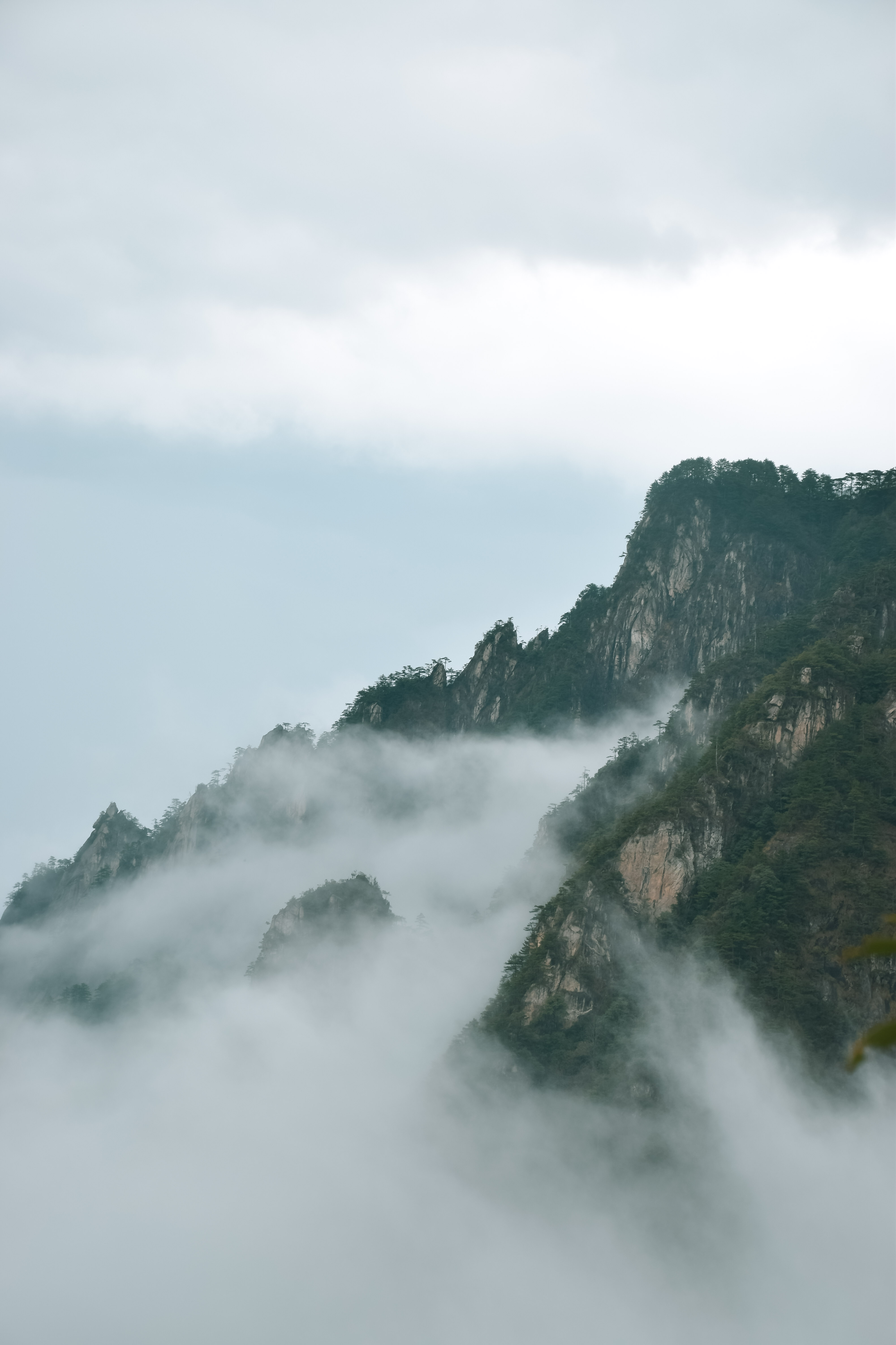 山体在云雾中时隐时现,雾气被风带着来回,缓慢又猝不及防地变换,每一刻都是不同的景色。