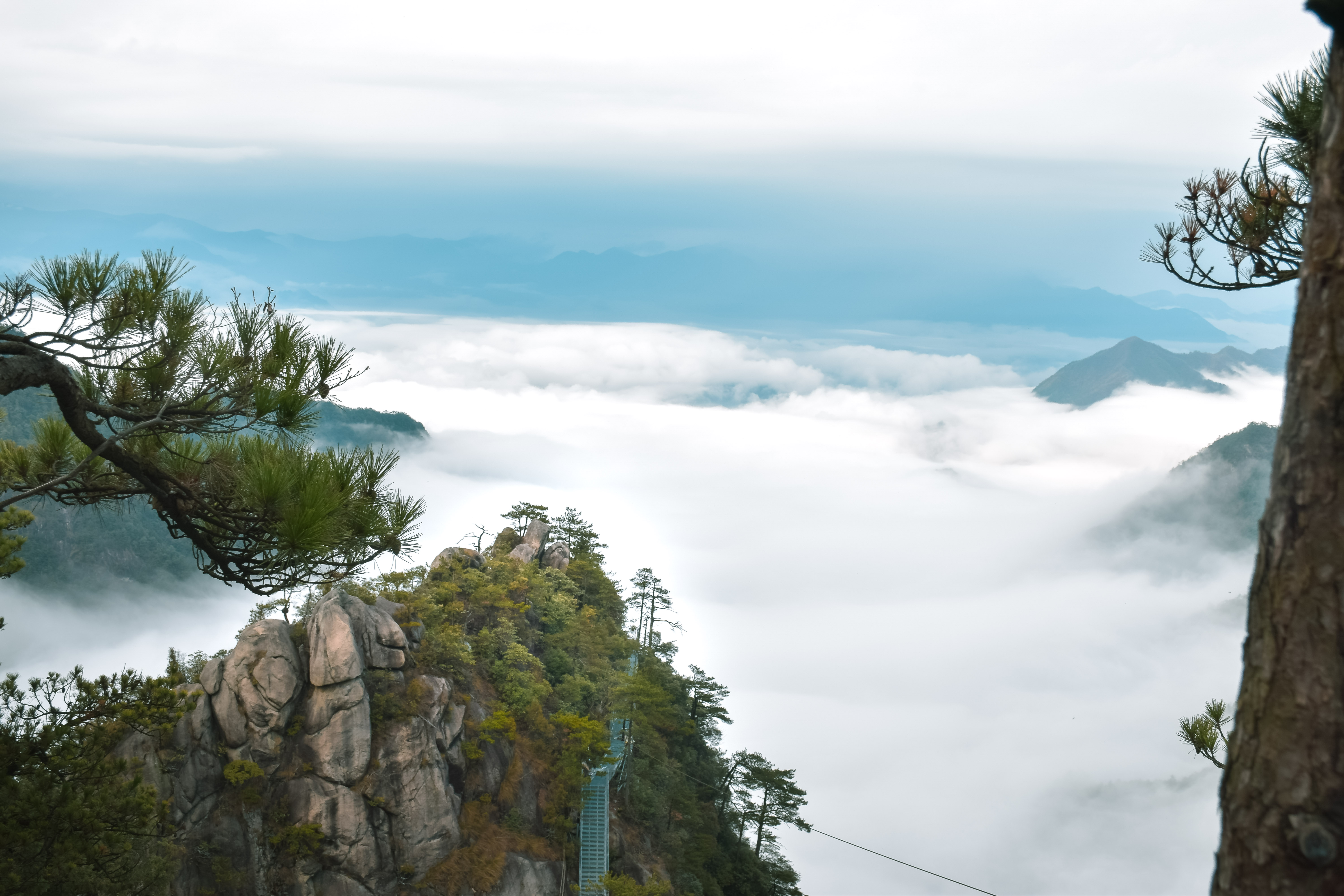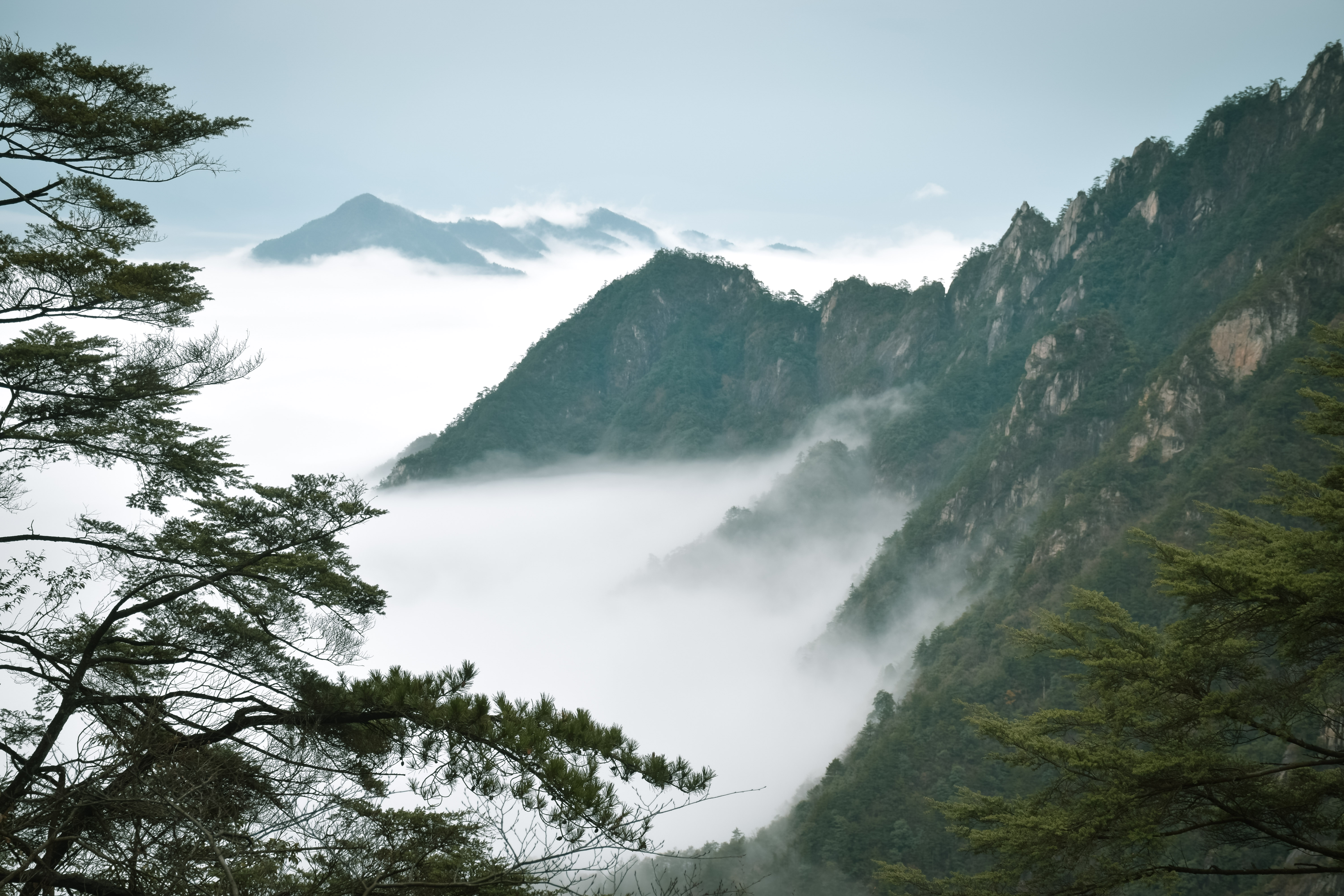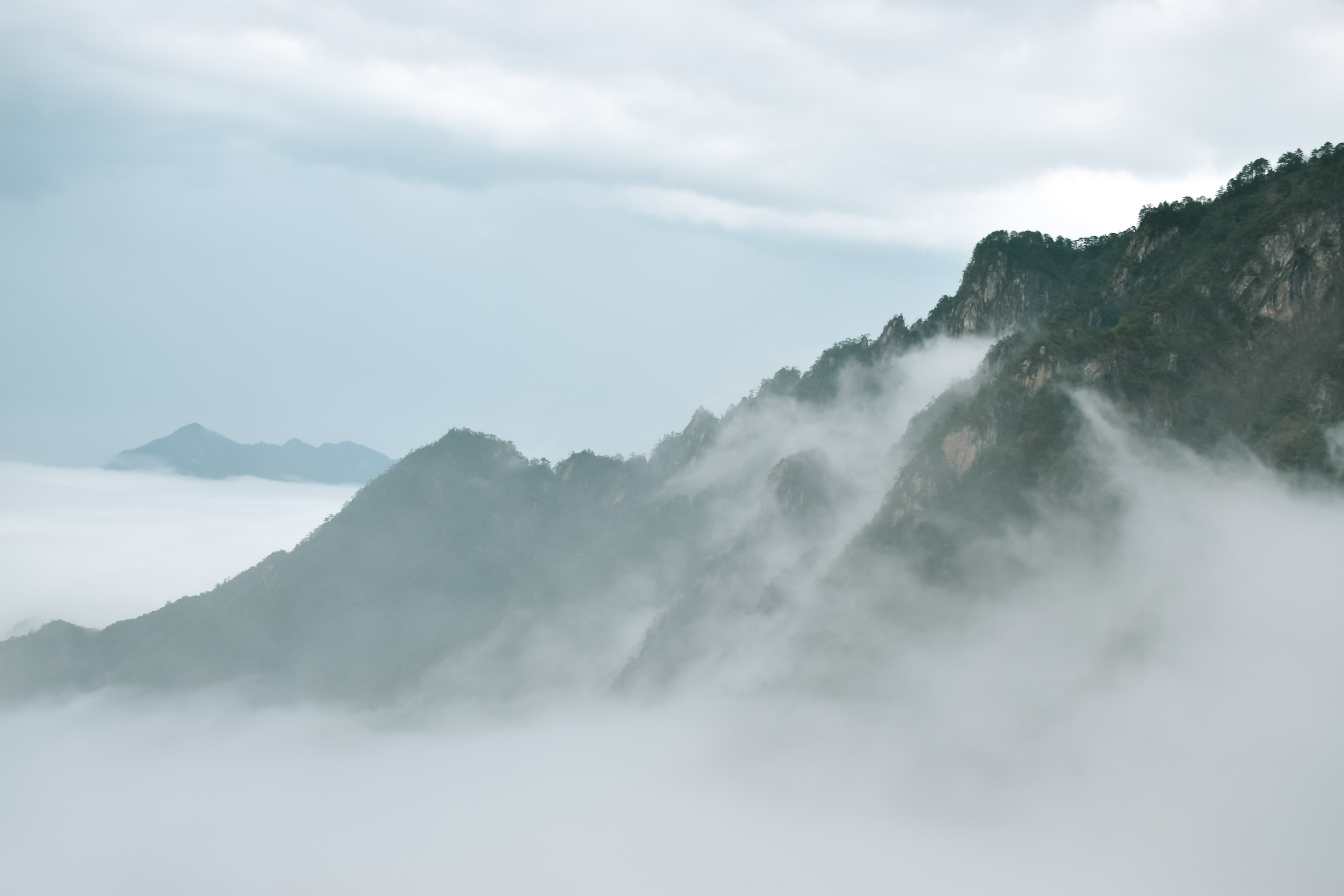 山体在云雾中时隐时现,雾气被风带着来回,缓慢又猝不及防地变换,每一刻都是不同的景色。