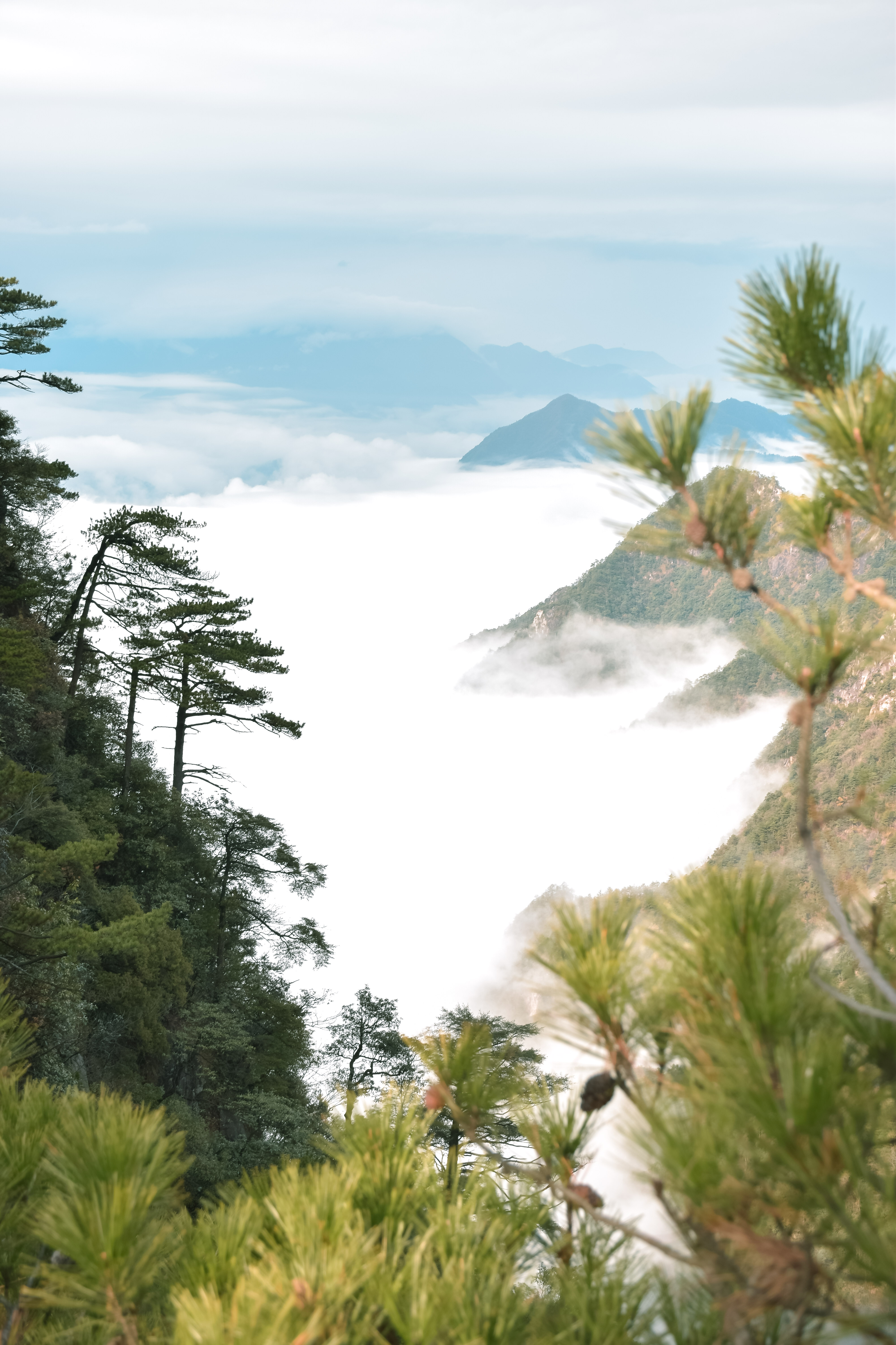 云海像轻柔的棉絮一样一层层叠上来,有的地方看起来特别厚重想上去蹦一蹦,有的又轻轻柔柔地飘荡在山脊。