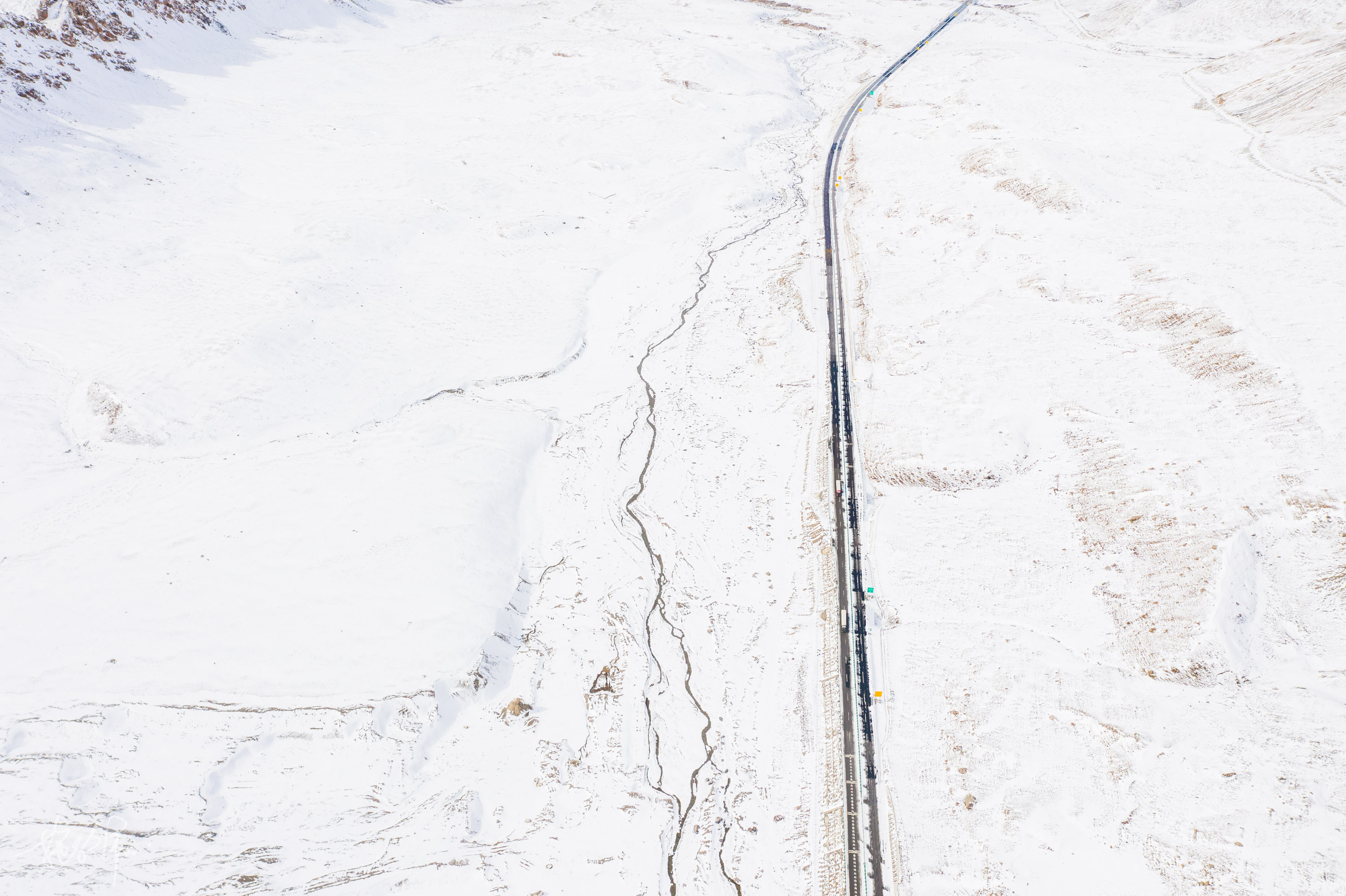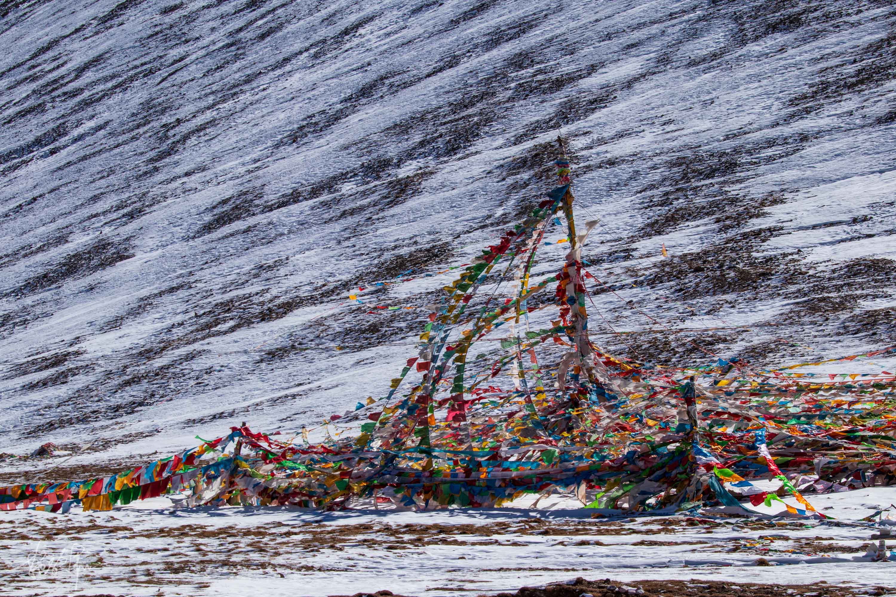沿途有好多美丽的点,但因为就在笔直的公路边上,没办法停车只能错过,我们最终在一个满是海鸥的经幡处停了下来。 随着海拔高度的不同,我们一会儿在秋天一会儿在冬天,这不,这一片就是白雪皑皑。
