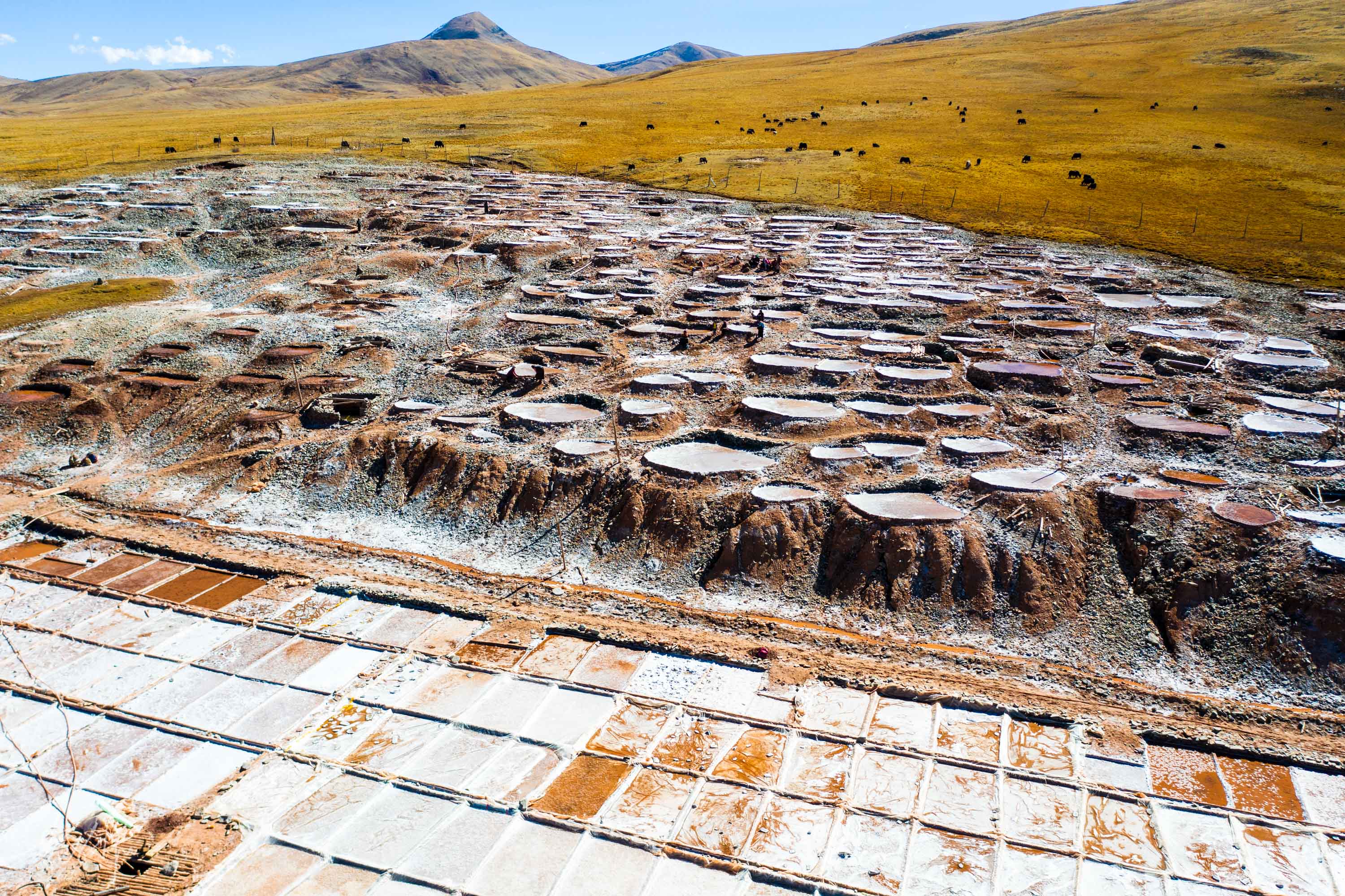 来到囊谦,去尕尔寺大峡谷的沿途必然会路过的白扎盐场。这就像是这条路上附赠的景点,却也是非常好看的,白扎盐场像极了大地色系的眼影盘。这是澜沧江特有的江盐,是由盐泉抽出来的卤水,经过风吹日晒自然结晶而成的。