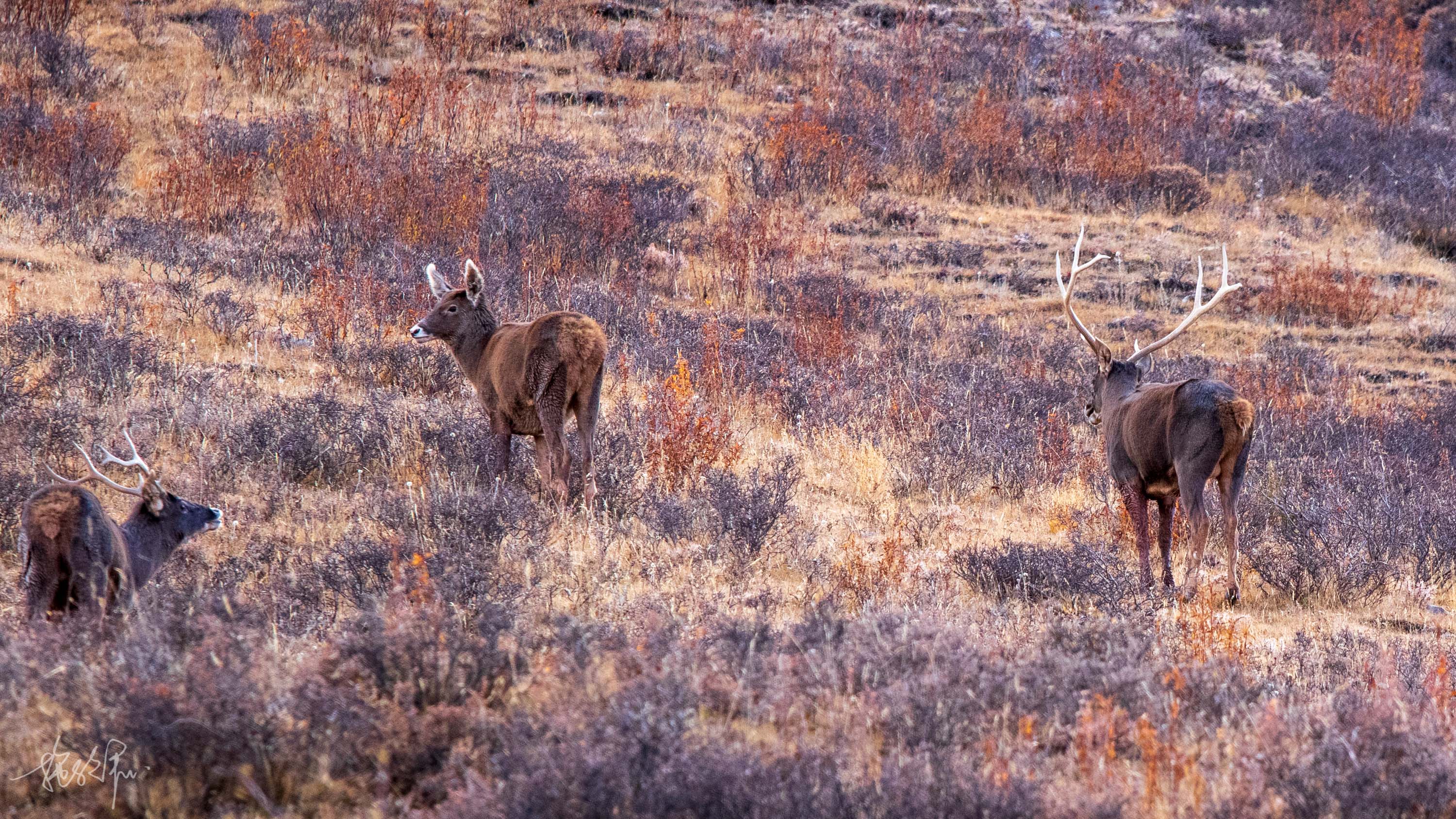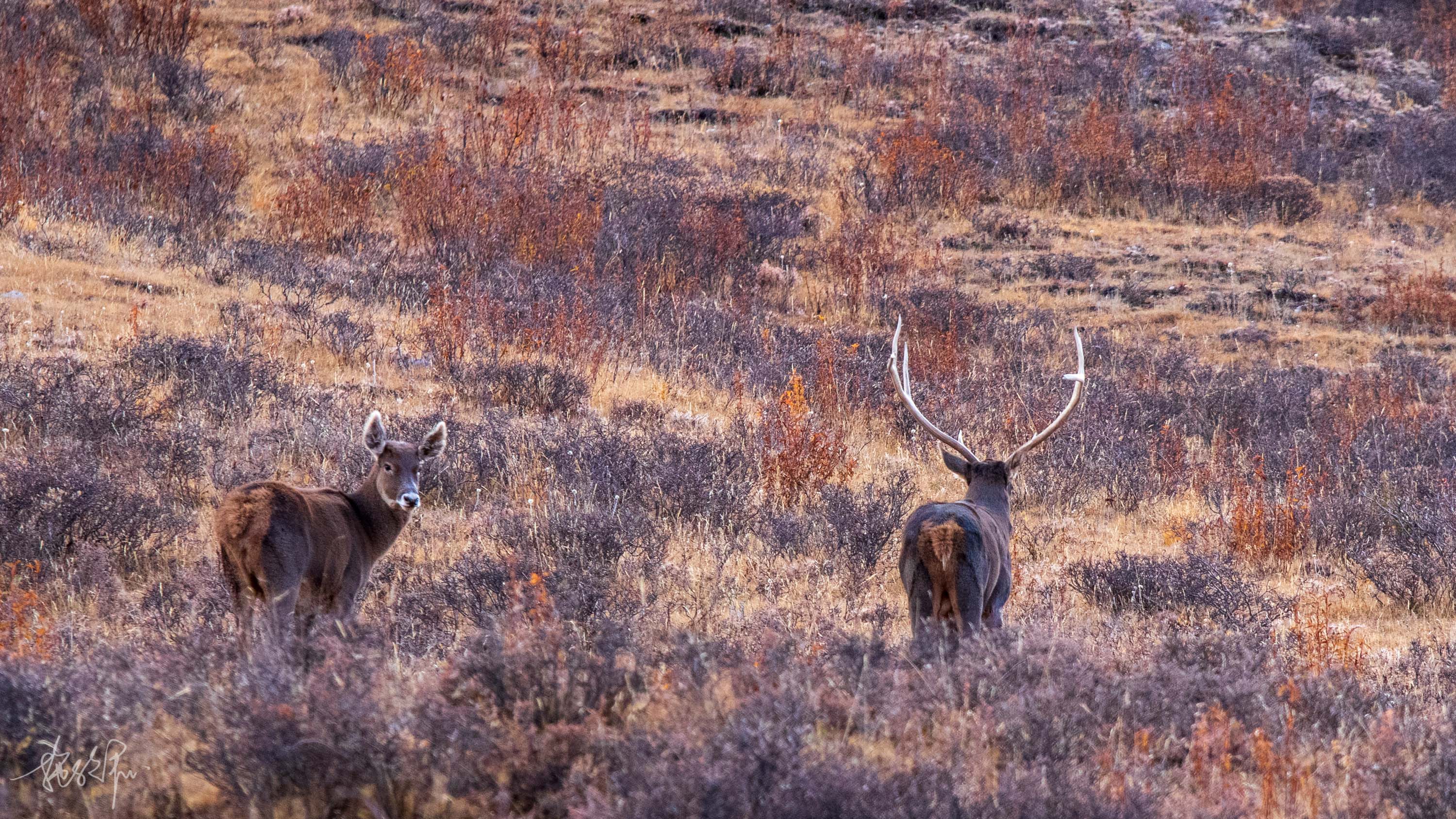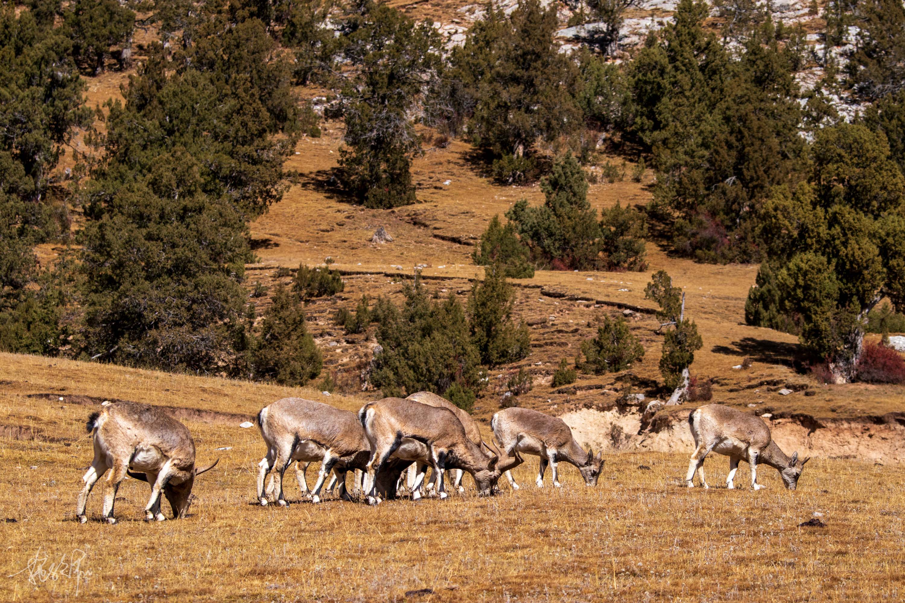 也许是因为这里比较偏僻,探访到尕尔寺的人也是比较少的,在这儿很容易遇到野生动物,也不怎么怕人。这不,一转眼就是几头岩羊在山坡上,我们只不过还开在路上,看到有一辆大卡车直接停在了路边,才发现竟有一群白唇鹿。