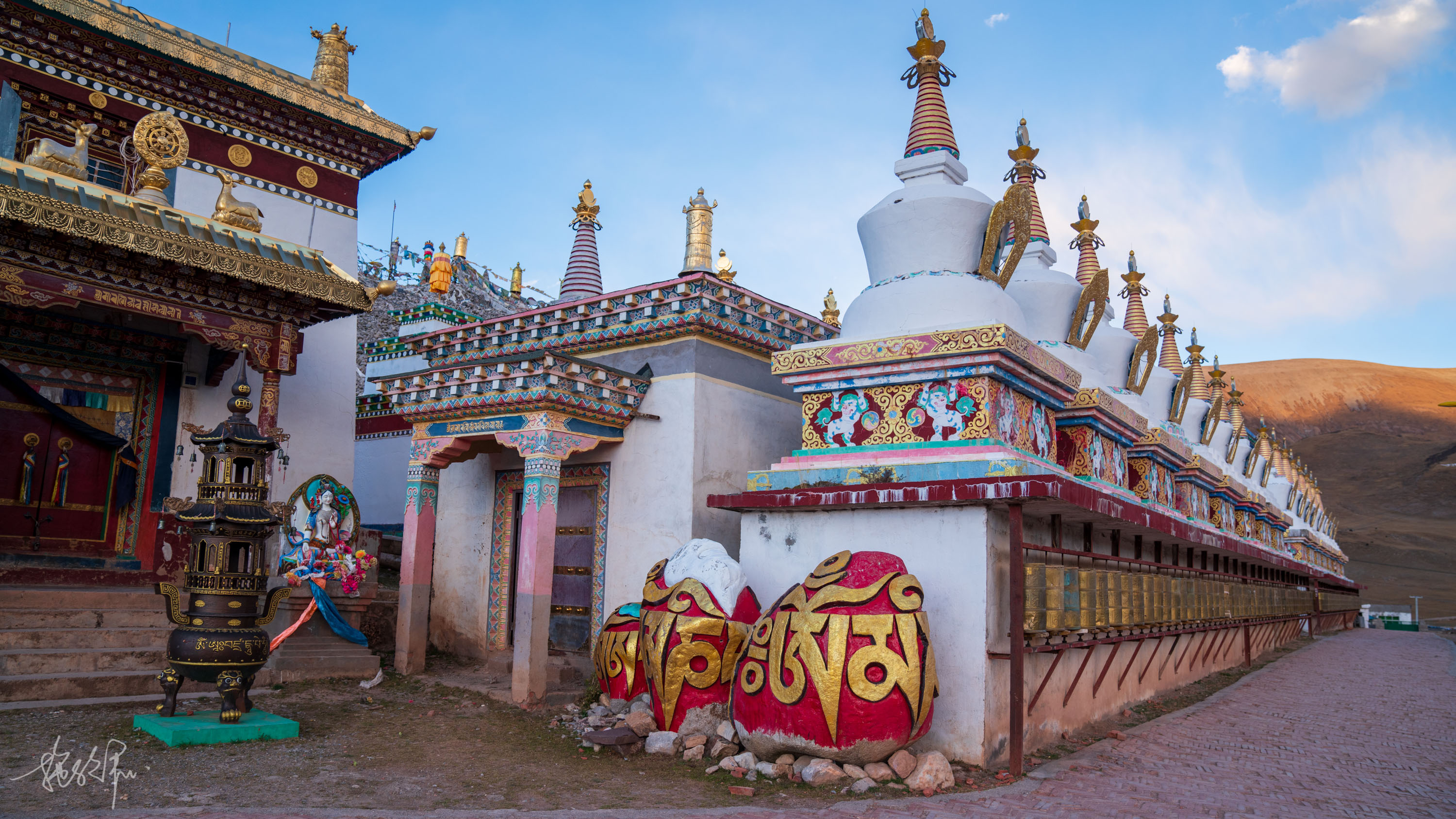 我很喜欢新寨嘉那玛尼城的佛塔,在蓝天白云的照射下真是太漂亮了,忍不住多拍了几张图。