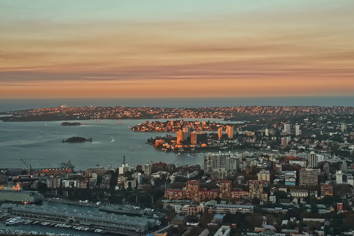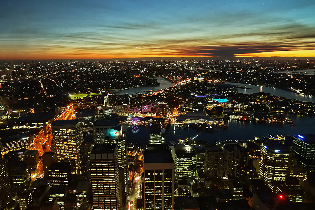 悉尼 塔观光台,有咖啡厅、购买纪念品的小店,还有面向不同角度的望远镜。当天天气晴好,我们登塔,看见了满天晚霞的景致。殷红的落日在云层半遮半掩中渐渐隐去,一条长长的余晖释放着最后的光辉,就像火柴燃烧的火苗,瞬间都市的夜被点亮。风景棒极啦!