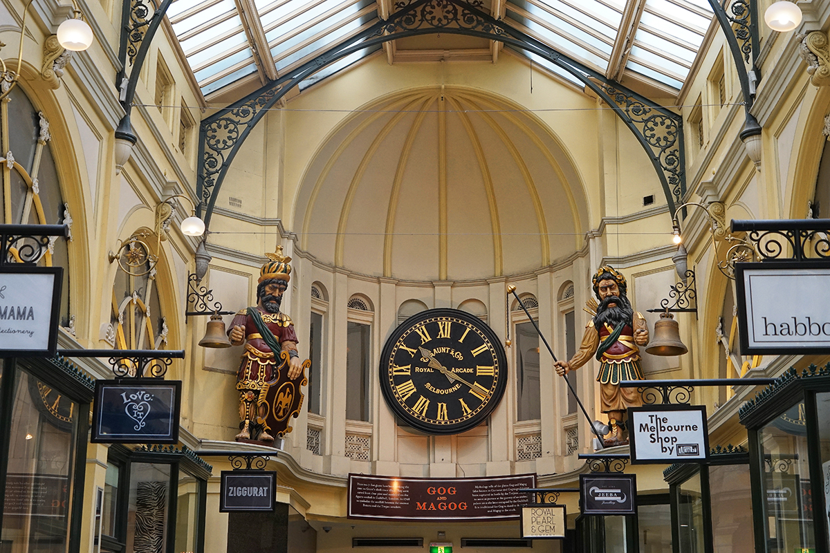 维多利亚 时代真的是一个辉煌的历史, 澳大利亚 很多购物场所都是带顶棚的拱廊,有着浓浓的 维多利亚风,华丽又稳重。 在拱廊的南端,设有神话人物Gog和Magog(在 英格兰 传说中,他们是守卫 伦敦 的巨人)的雕像,还有一个每小时报时的时钟。