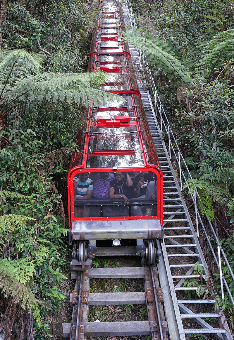 蓝山空中索道缆车号称世界第一倾斜角,达52度,就这么俯冲下去,还真是有点吓人。我们就是乘坐号称南半球最险峻的缆车-空中索道(Cableway)去下到蓝山山谷中。