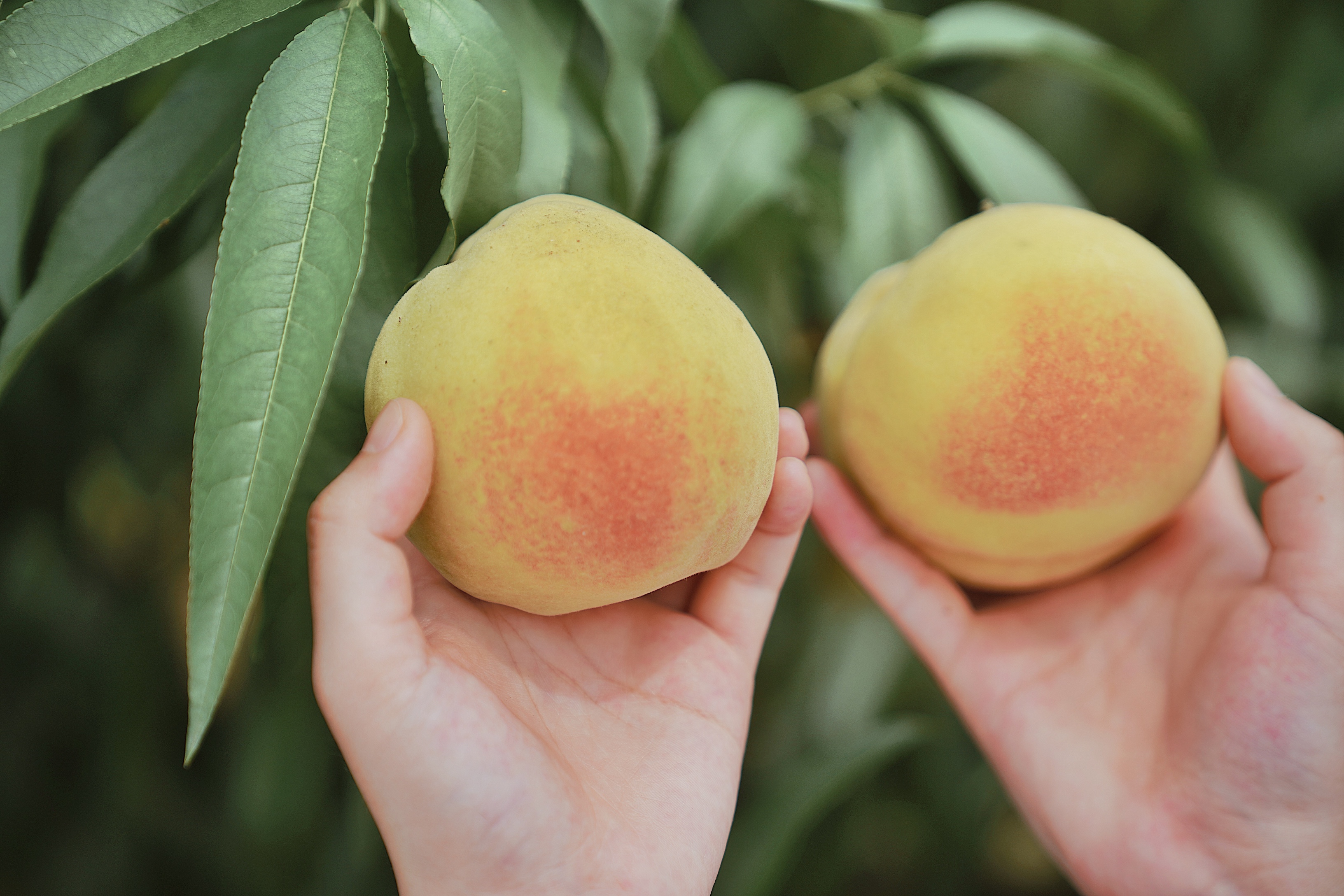 大片的桃林上长满了黄桃,本身低矮的桃树更加压低了桃枝,采摘起来像极了寻宝 。