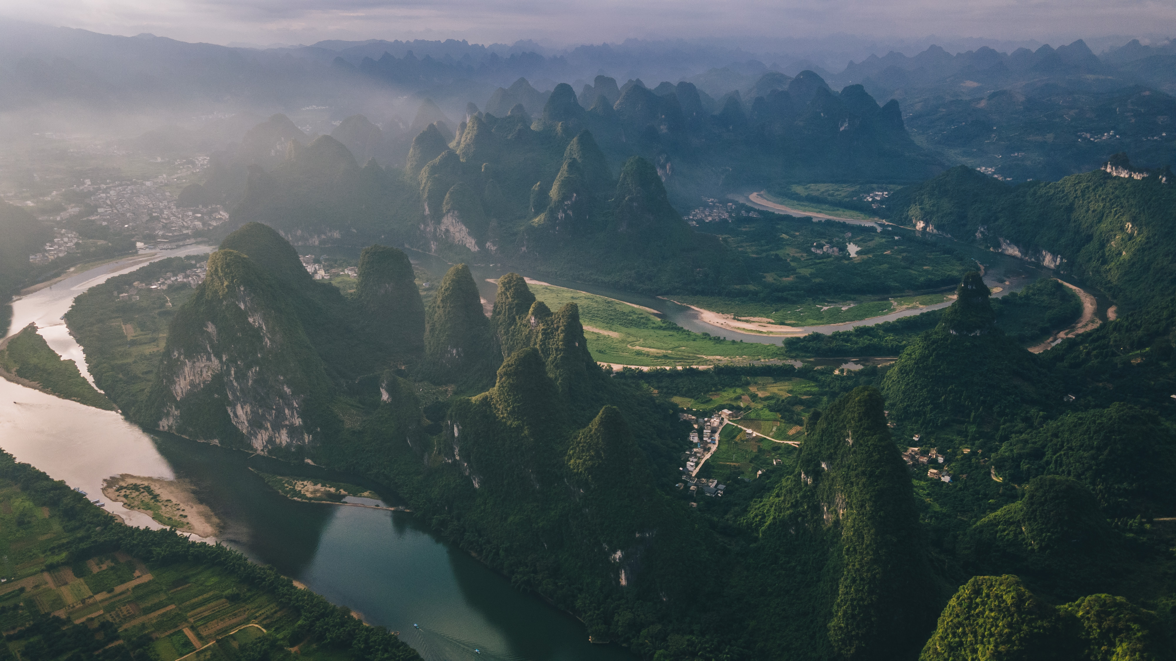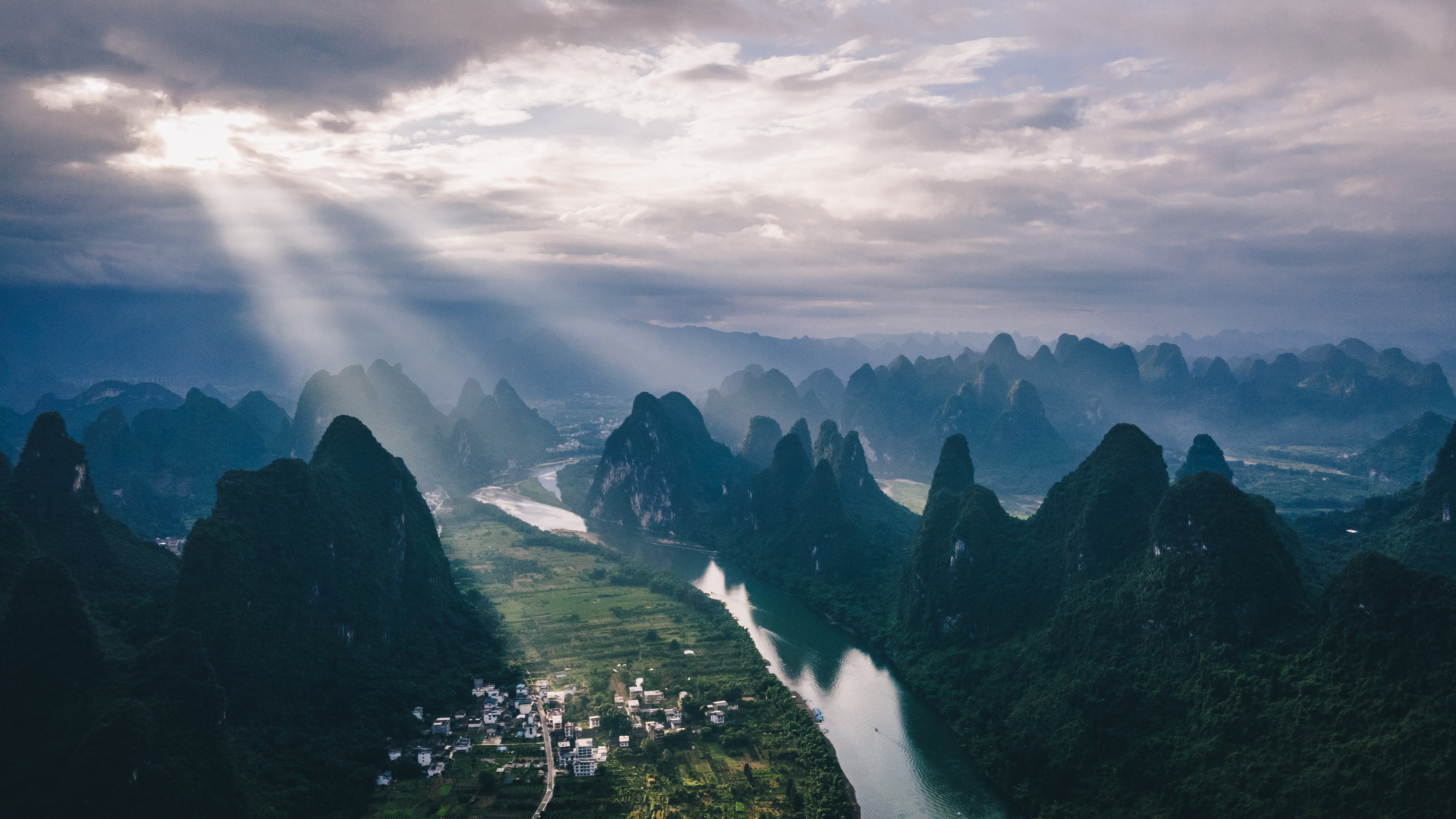 桂林 的天气非常多变,今天下了两场阵雨,傍晚老天还是给了一个完美的日落。黄绿相间的稻田,云雾笼罩的喀斯特山林,云层下射出来的夕阳光,照亮了整个大地。