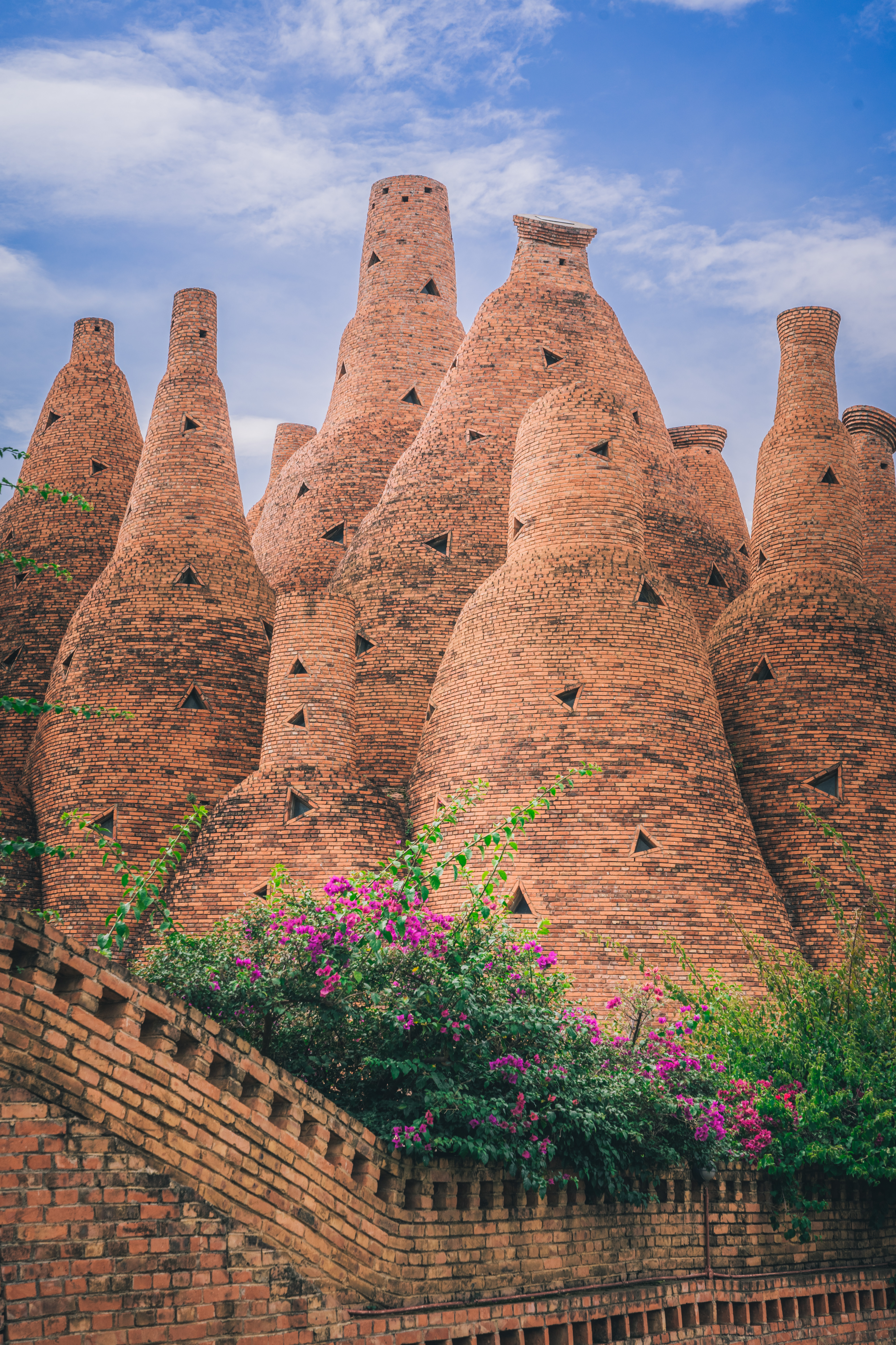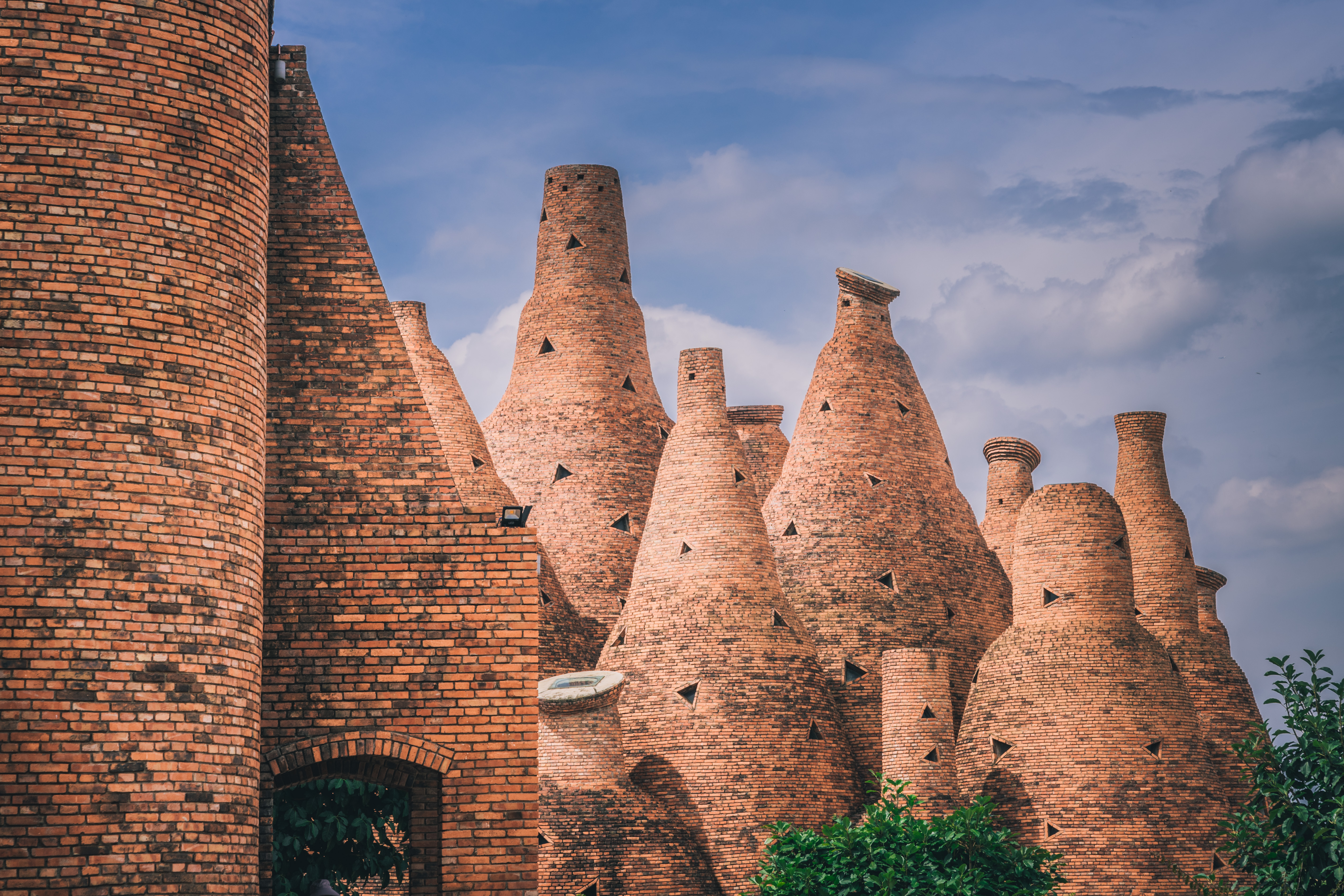 东风韵,是设计鬼才罗旭,通过最普通的红砖,堆砌出一座造型奇特的城堡。建筑风格融合红酒文化、彝族支系阿细人的火文化,酒瓶、火苗状的城堡,被誉为“魔幻未来主义的魔幻城堡”