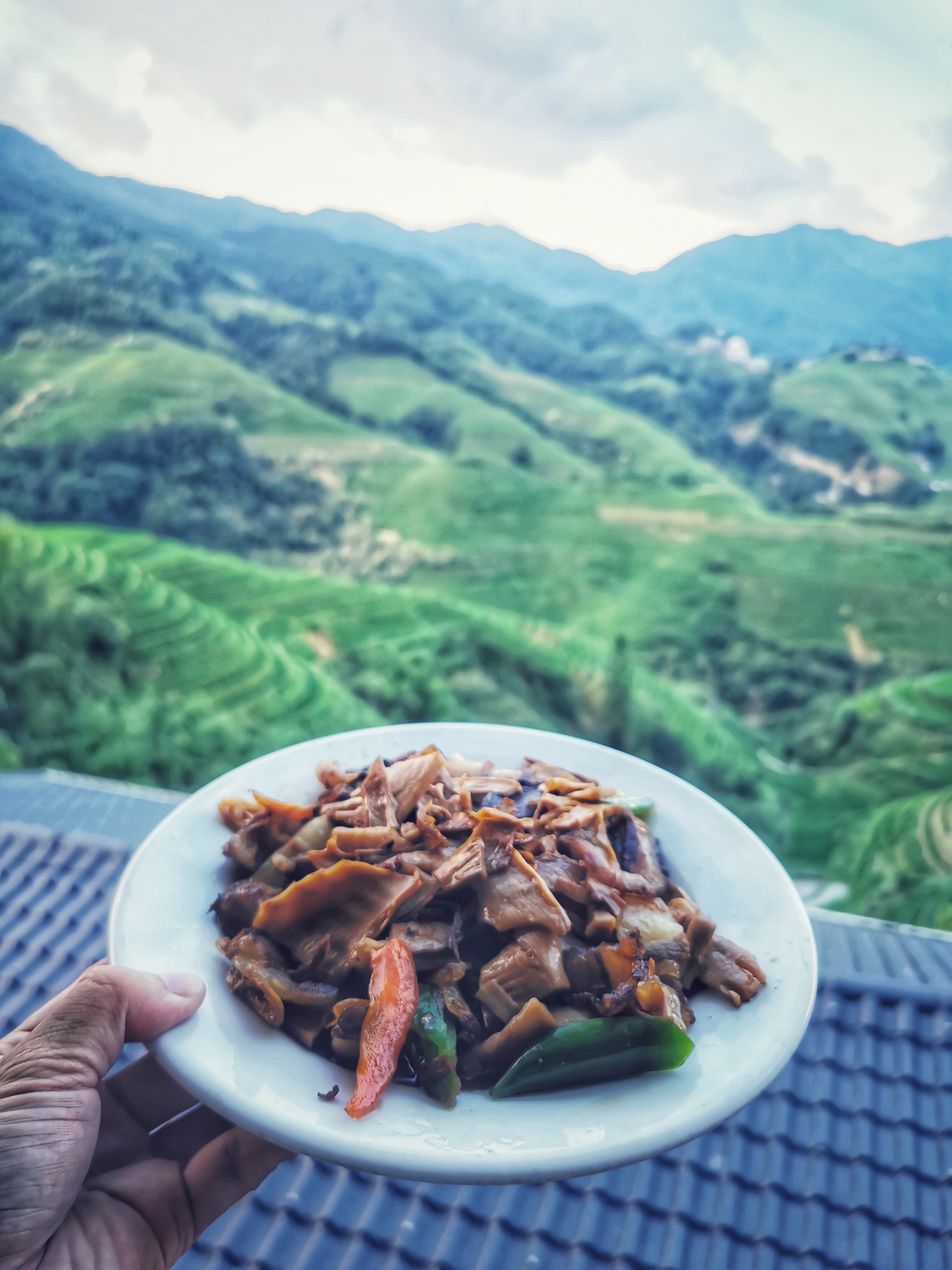 没多久太阳就被云挡住了,肚子也有点饿了。回酒店打算尝下客栈阿姨炒的苗家菜,几年前在 湖南 凤凰尝到了苗族的烟熏腊肉,之后一直念念不忘。想着他们也是苗族应该也有,果然在菜单上找到了:笋干炒腊肉(下图),烟熏的木香味,能在口腔里久久回荡,推荐大家一定要尝一尝。(老板也建议我不能经常吃,烟熏碳烤吃多了不健康,良心)