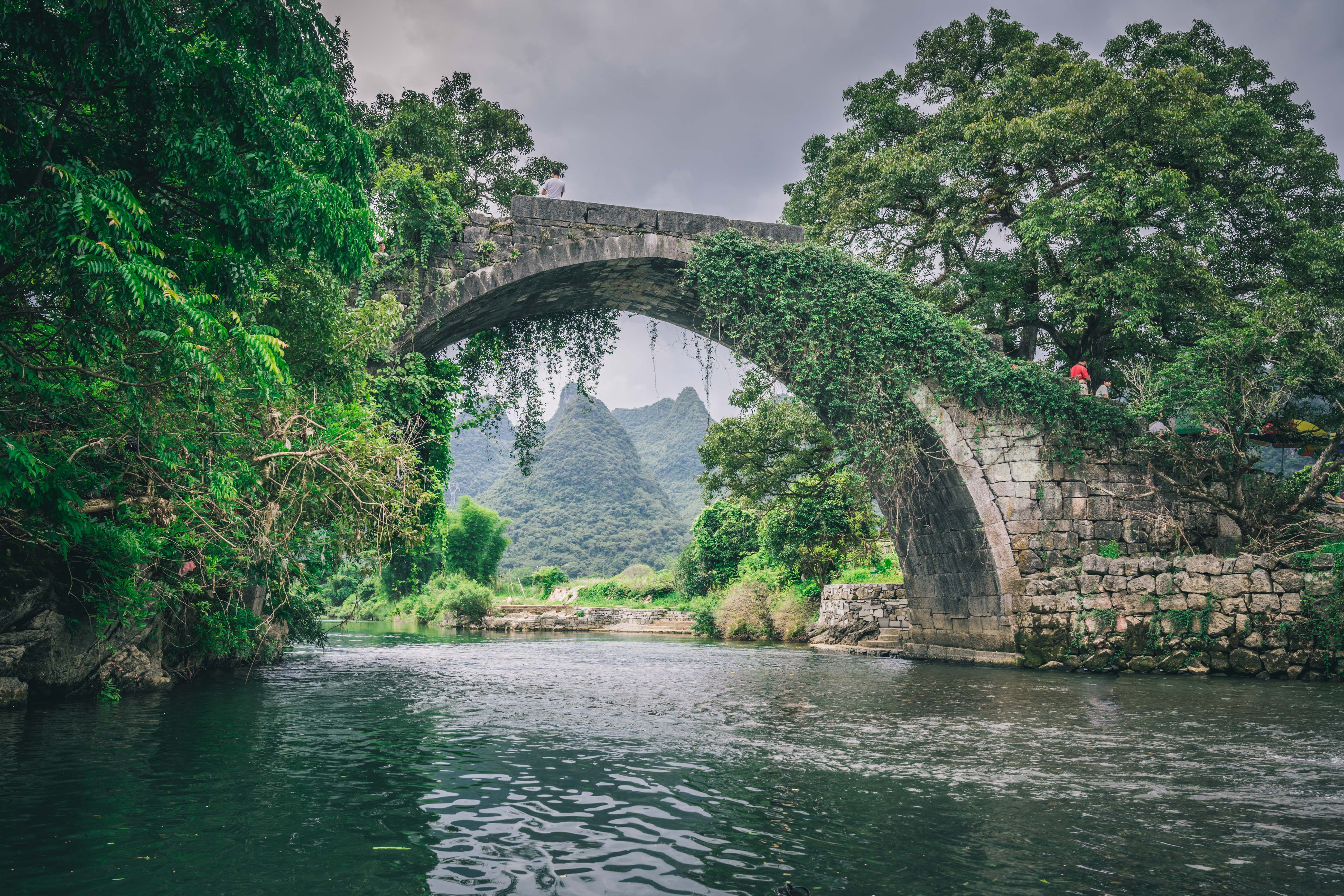 遇龙河是 阳朔 地区的主要观光游览点,大多数人都会在这里坐个竹筏漂流,欣赏两岸的喀斯特风光,不过网上大家对漂流拍照收费评价褒贬不一,我倒也没多 大兴 趣,倒是看中了这里的两座古桥。