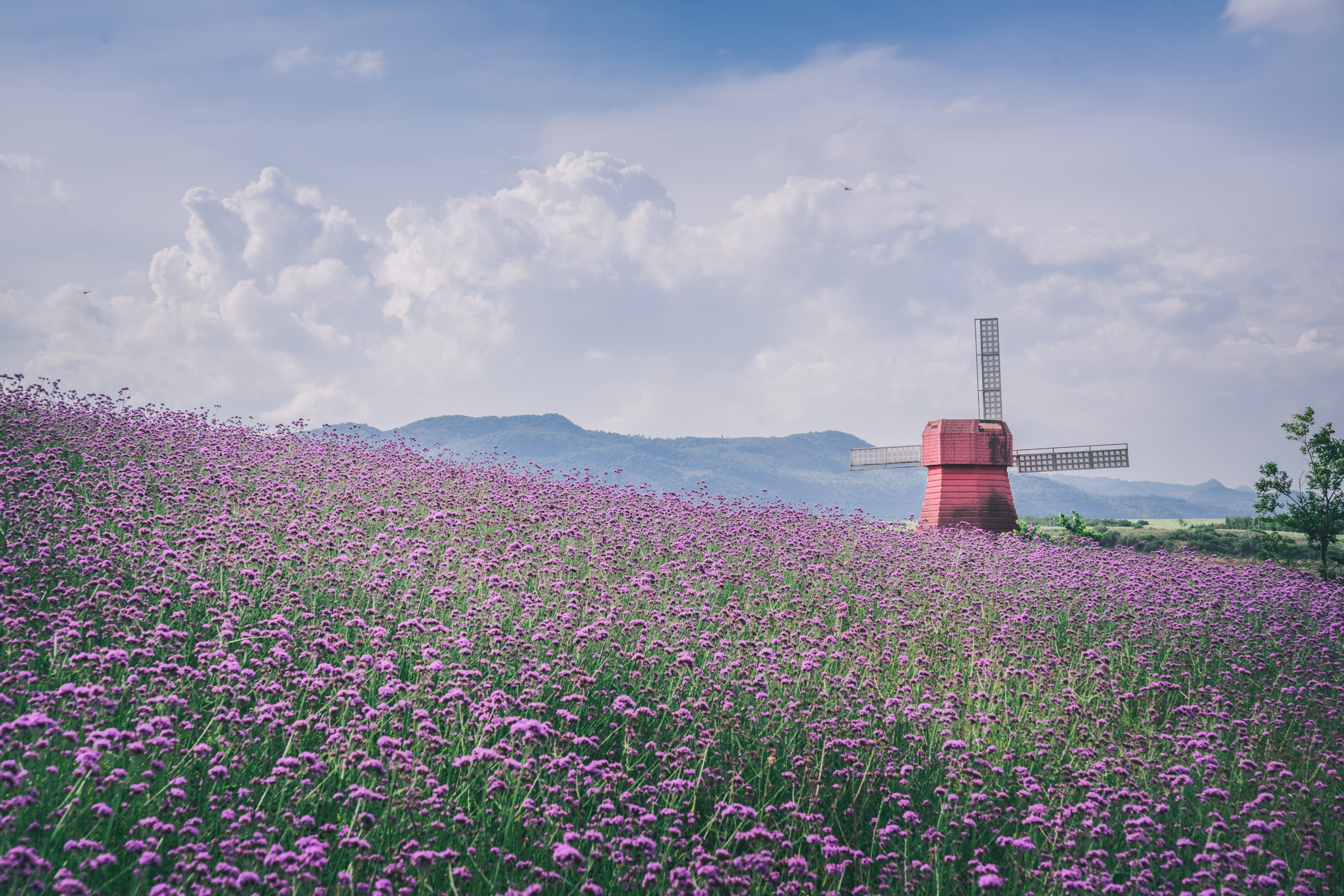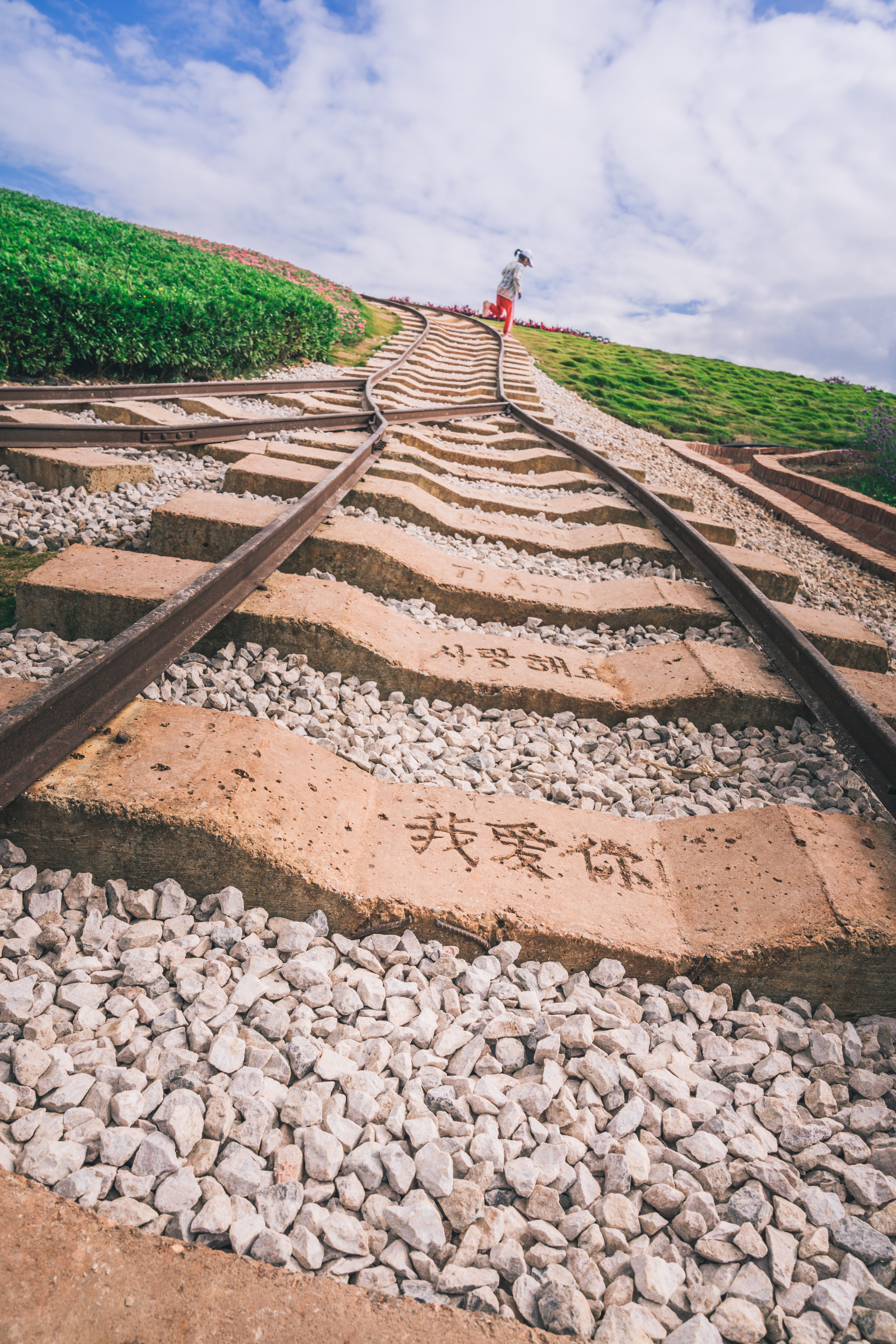 这个季节山坡上种满了薰衣草,湖畔还有风车随着风缓缓转动,薰衣草中央有着景区特意打造的网红铁轨,中央的石板上印刻着中韩两国的文字。