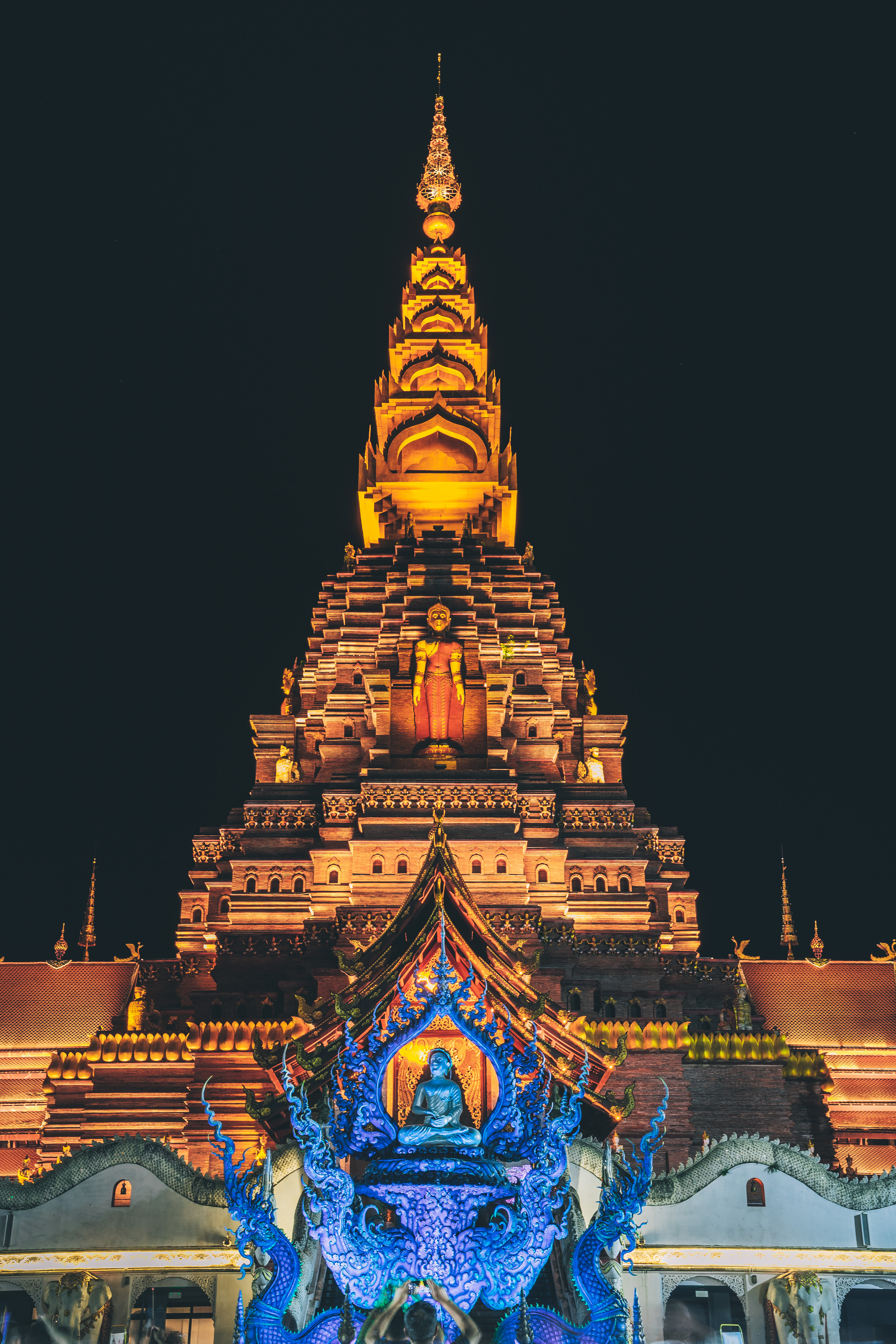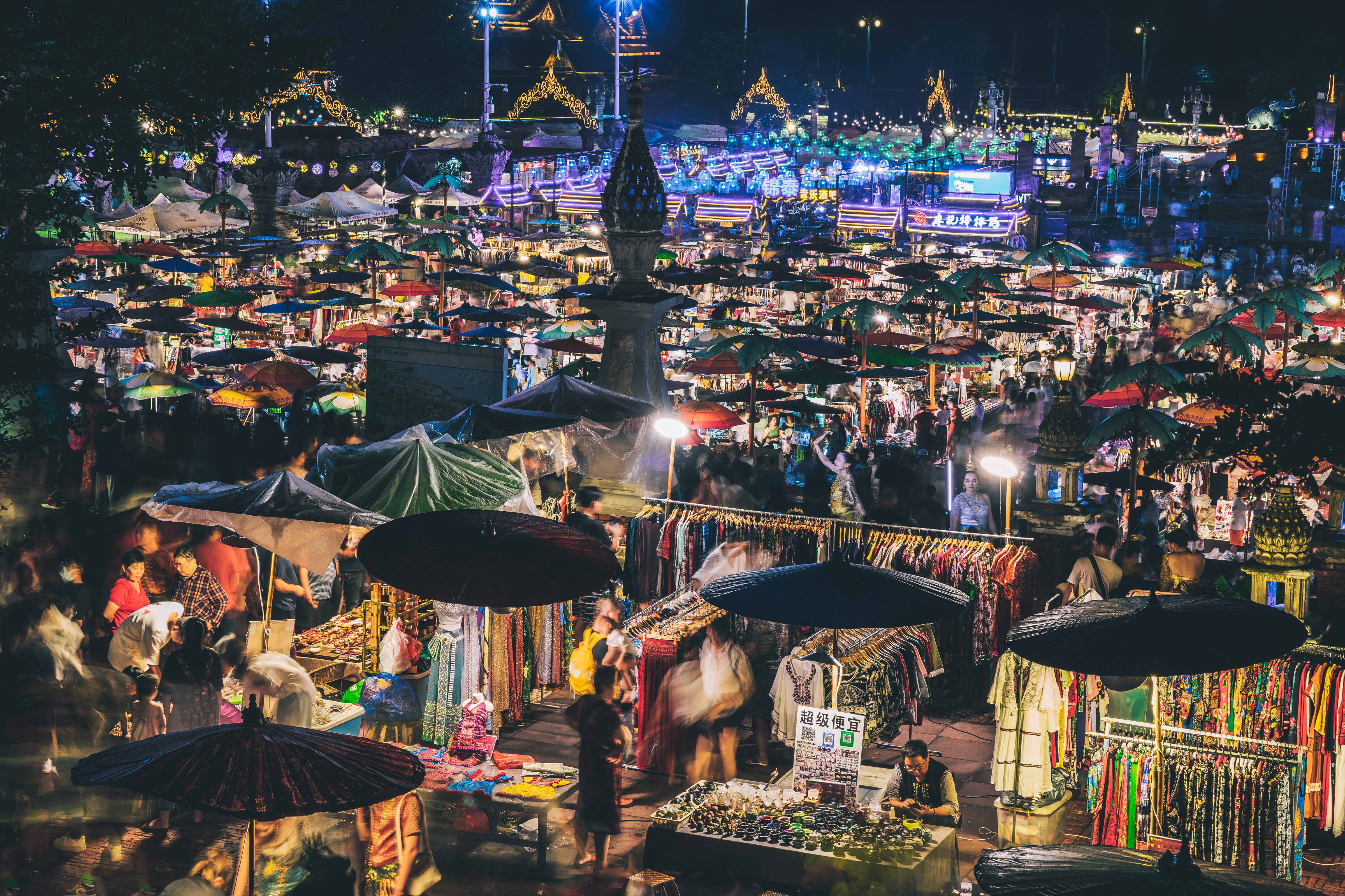 转到大金塔的背面,忽然会被眼前的景色震撼,这是一个巨大的夜市广场,广场上支起了五颜六色的伞,灯火通明,人声鼎沸,人群已经到了摩肩接踵的程度,一点不像受疫情影响的季节。