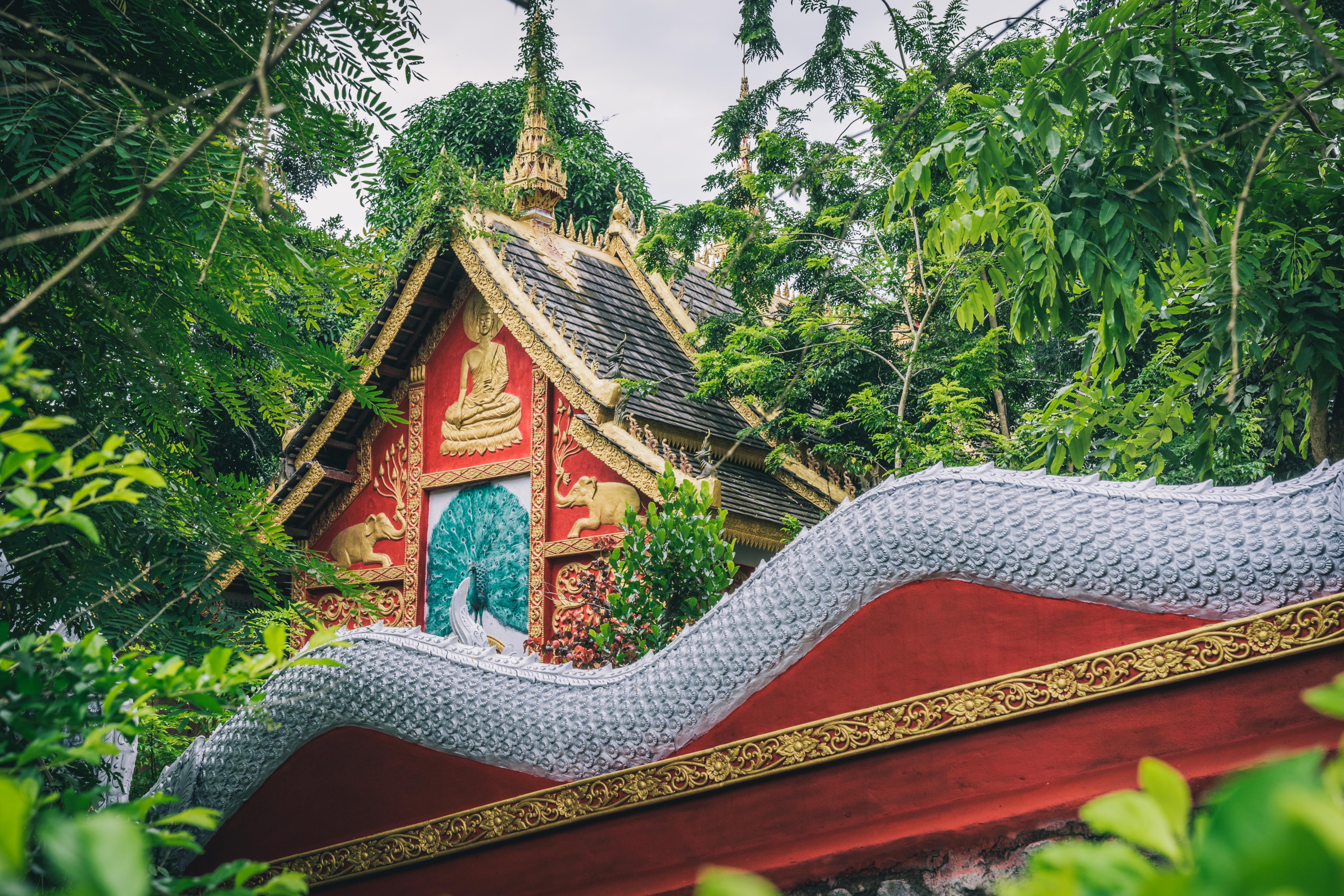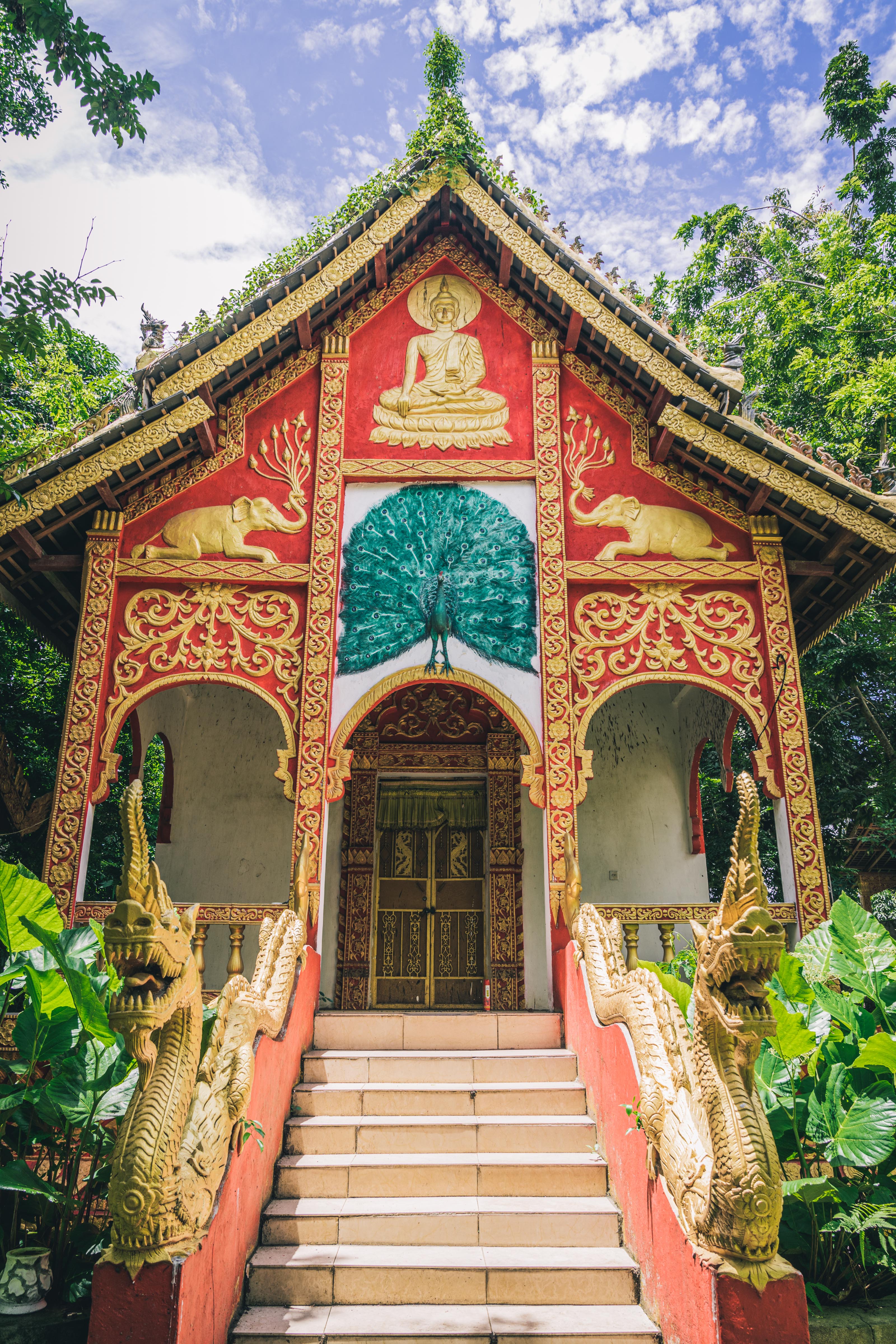 “勐景来”是傣语,“勐”是村寨,“景来”是龙的影子。传说当年天子为追赶一只金鹿,来到此地。后来人们发现这里隐约可以看到一条龙的影子。所以村里建起了寺庙,孔雀,大象,还有龙都成了神圣的元素融合在一起,尖尖的屋顶,金碧辉煌的外墙,很适合拍照。