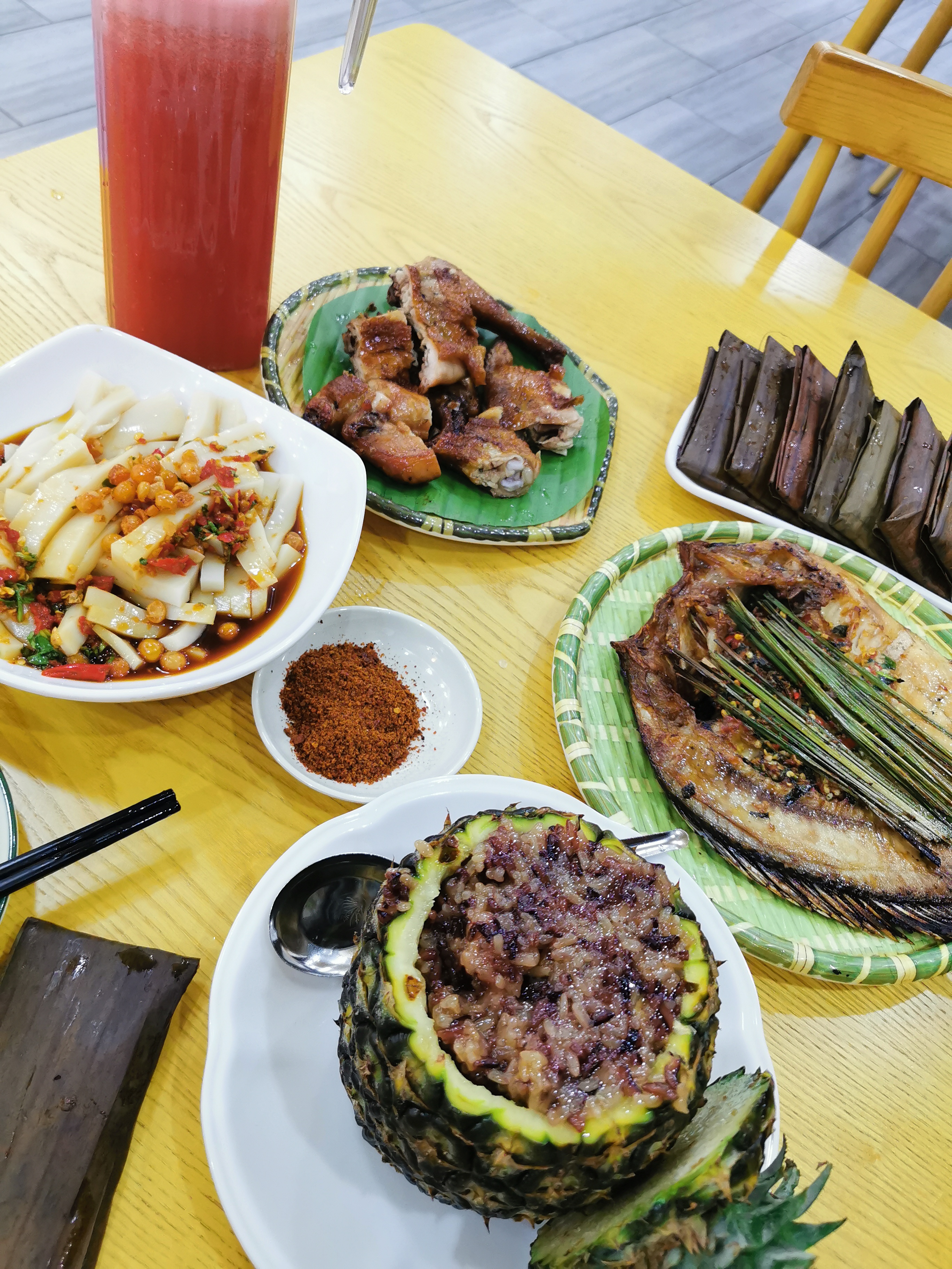 除了夜市上的各种烧烤小吃,也可以选择去店里吃一些正宗的版纳菜,傣族菜。万能的大众点评上都可以看到店铺评分,也有一些划算的团购。一个人吃饭贵且菜少的难题,都在点评上完美解决。下图是我第一晚,第三晚选的团购套餐,价值65元,没错,包含整整一大罐不兑水的西瓜汁,香茅草烤鸡,香茅草烤鱼,菠萝紫米饭等等,我还退掉了一个菜避免浪费,最后扶着墙回的酒店。
