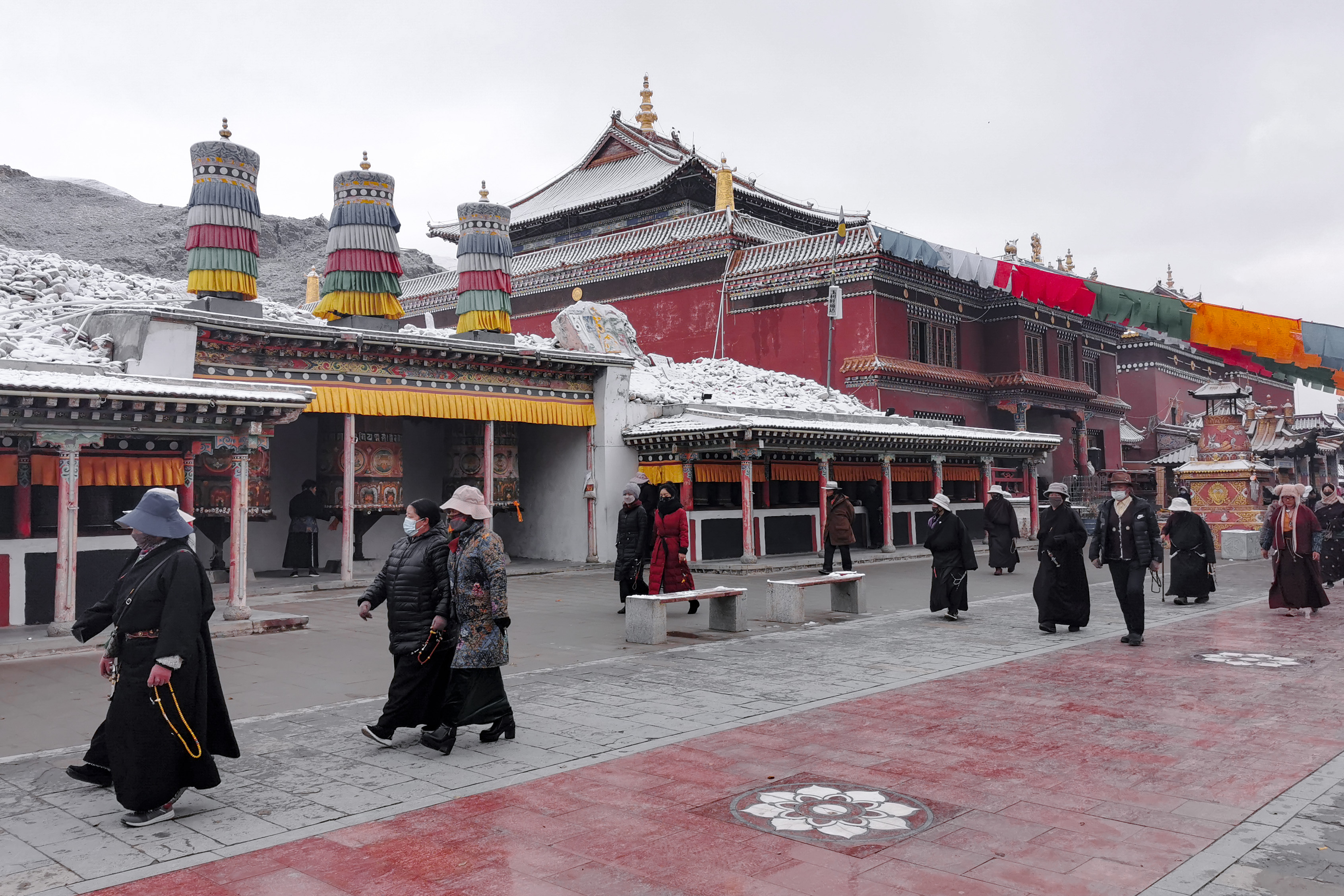 又是巧合,碰上了正前往大殿去用斋的喇嘛们,