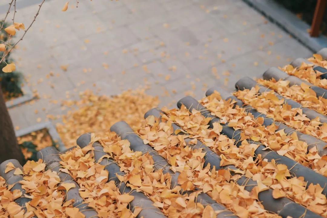 黄灵官殿的屋檐上,银杏叶铺满整个瓦片,一种历史的厚重感扑面而来。铜黄色的香炉斑驳出岁月的痕迹。连廊环绕,曲径通幽。抬眼处,偶遇一抹黄色,整趟旅程都变得温柔起来。