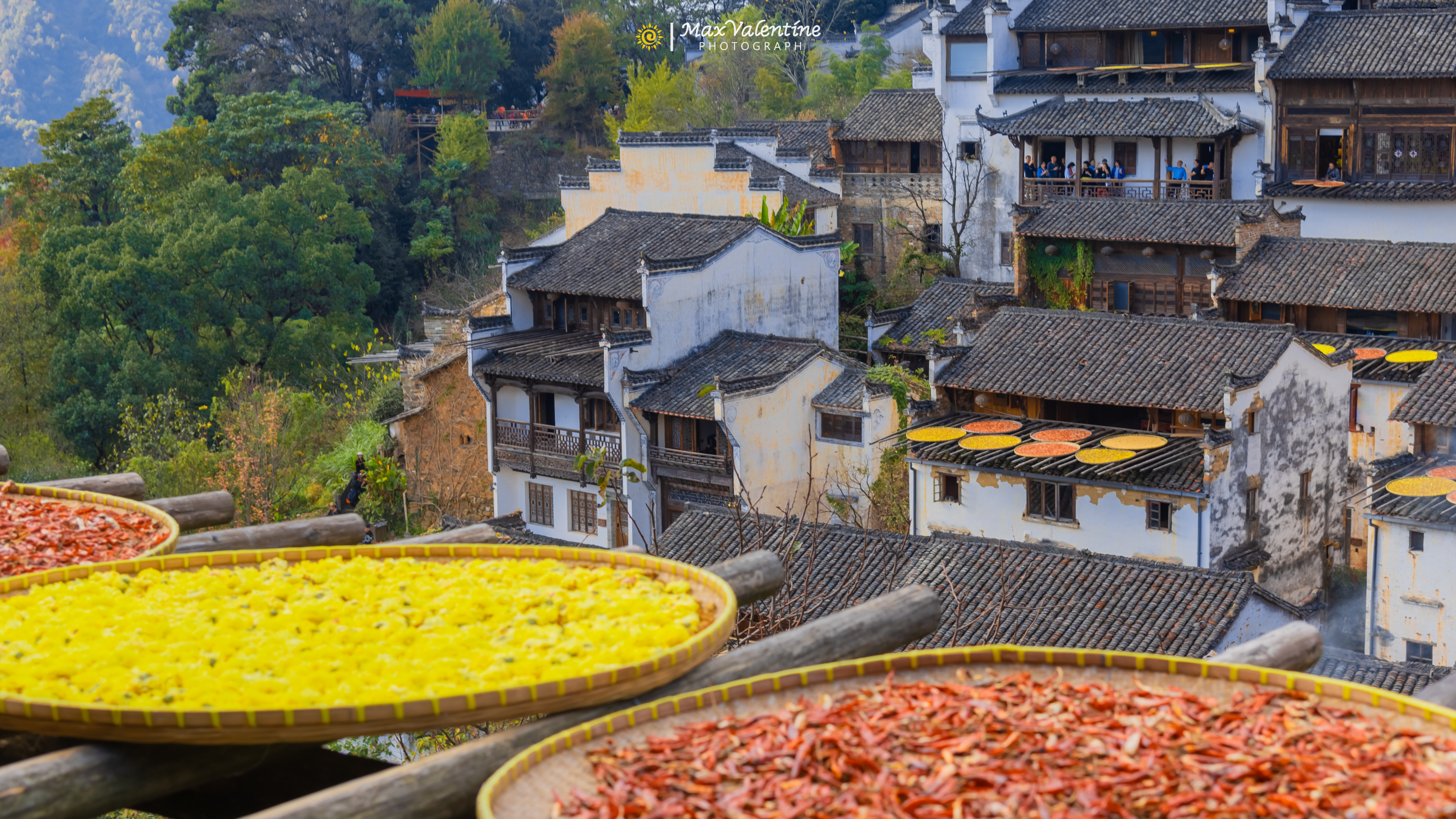 篁岭晒秋,本来是为了解决土地不足问题,在屋檐上开始晾晒农作物,但现在似乎已经成了不分季节的观赏活动。秋天最是应景,想要拍摄篁岭的晒求是要到那些小窗口去,比较推荐的就是晒工坊,这里是一座三层的民居,也是鸟瞰村庄秋色的绝佳观景台,第三层也被称为最佳摄影点之一,第一层更适合人像的拍摄