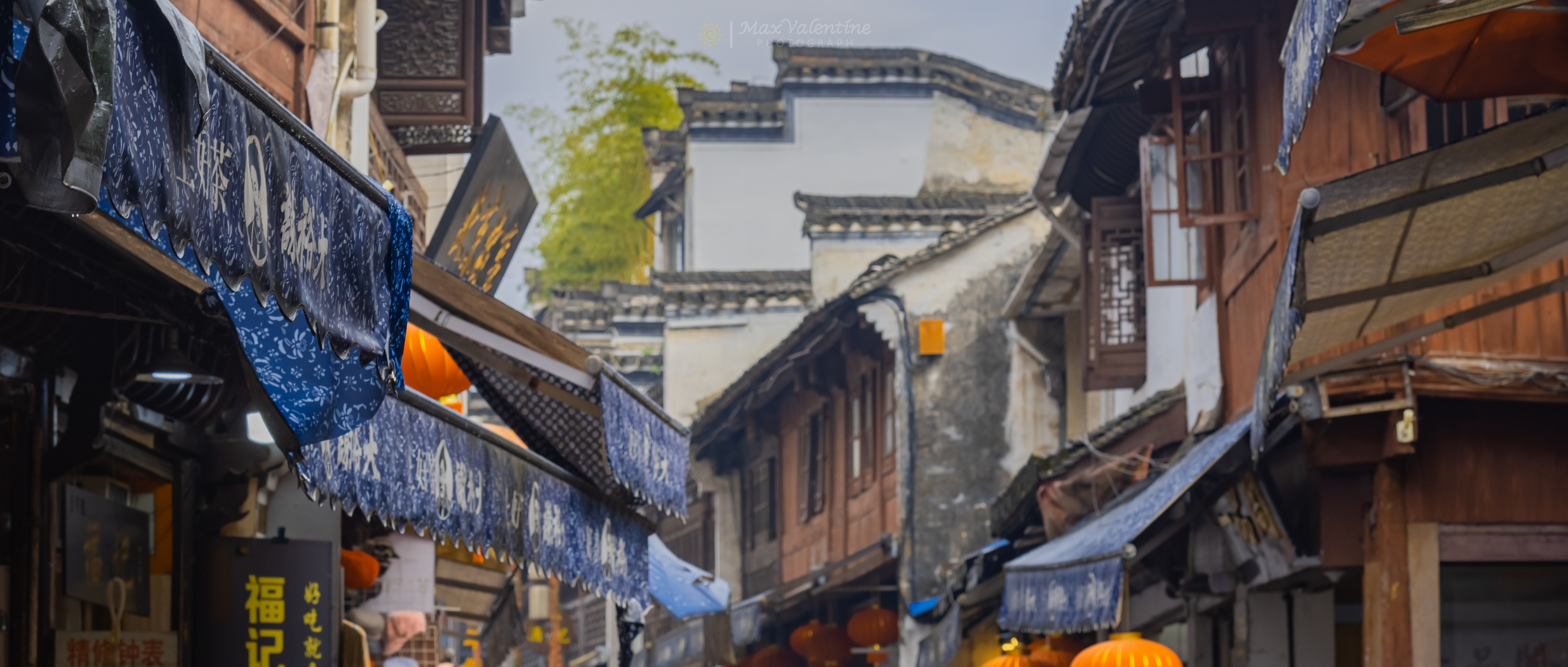 老街最吸引人的就是保留南宋来的300间徽派建筑,颜色淡雅,青石板铺路,门楣上是徽派的木雕,屋脊上是灵动的山墙。站在古街上,两侧的山墙就是手臂环绕了。