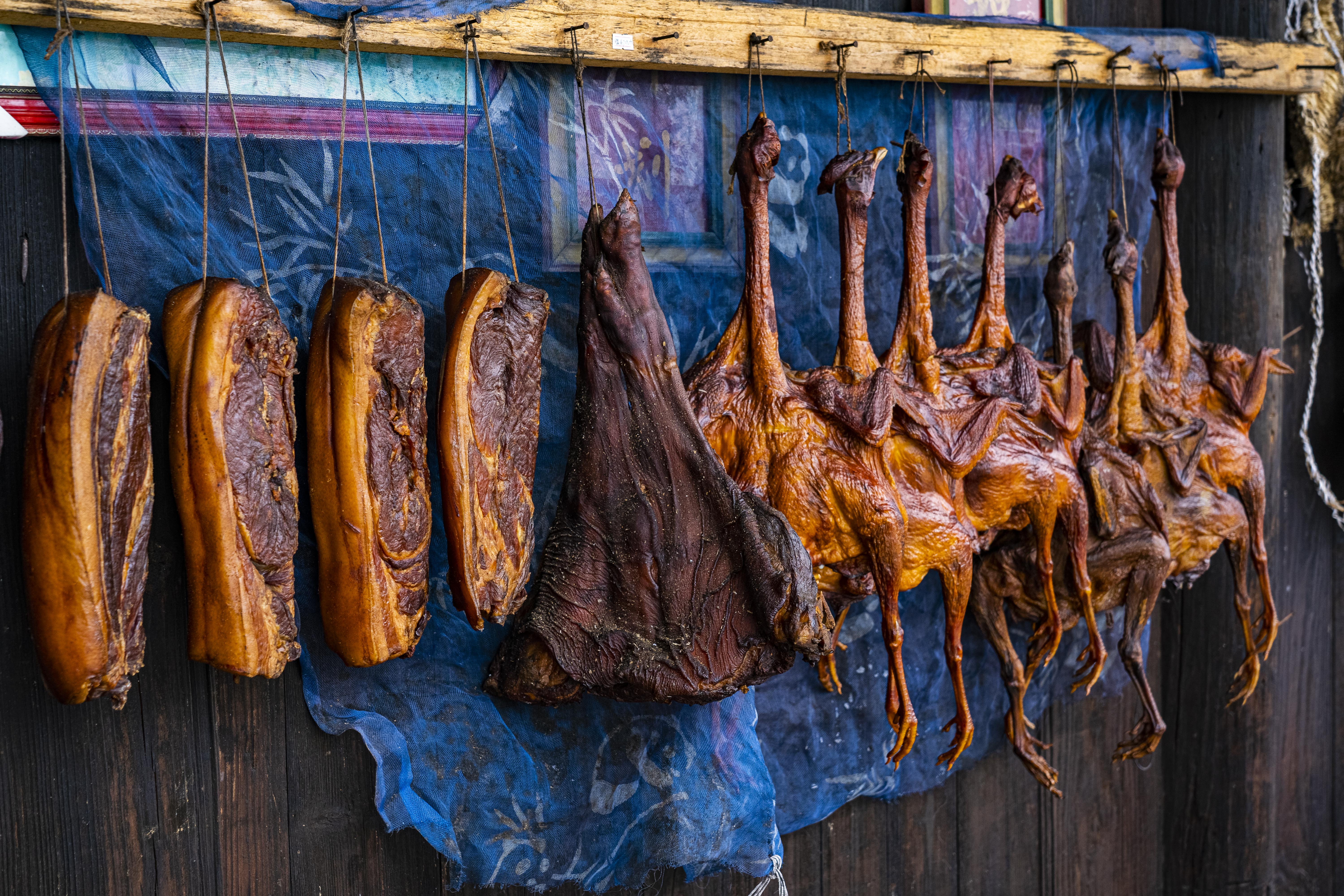 他们每家每户都有熏腊肉,一块块腊肉挂在屋檐下,暗红色冒着油光,看着口水直咽。