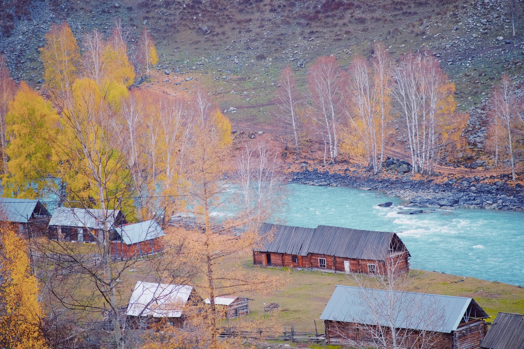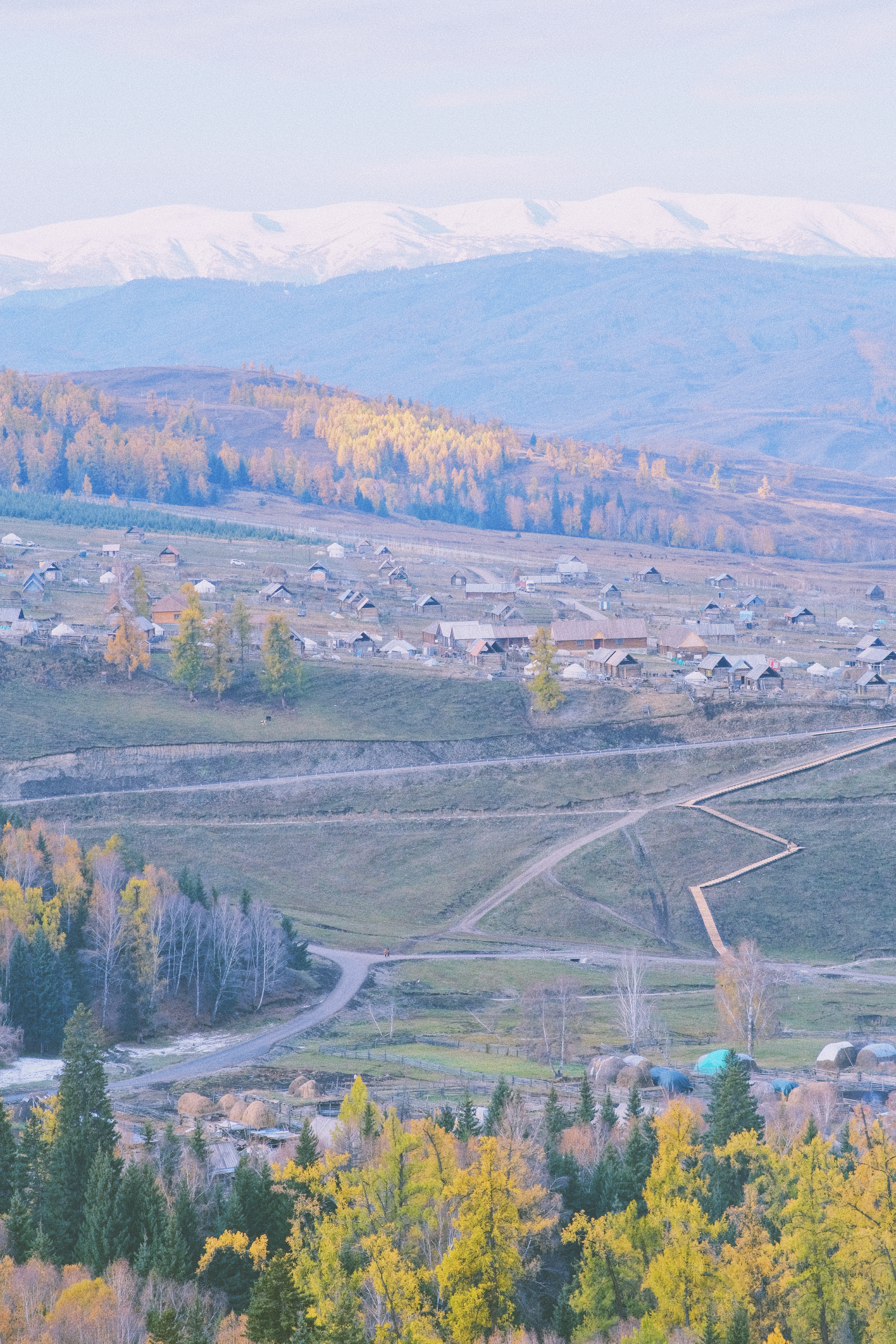 在群山环抱的开阔地上,禾木村静静地躺着,图瓦人的尖顶小木屋、牲口围栏随意地散落在村子的各个角落。