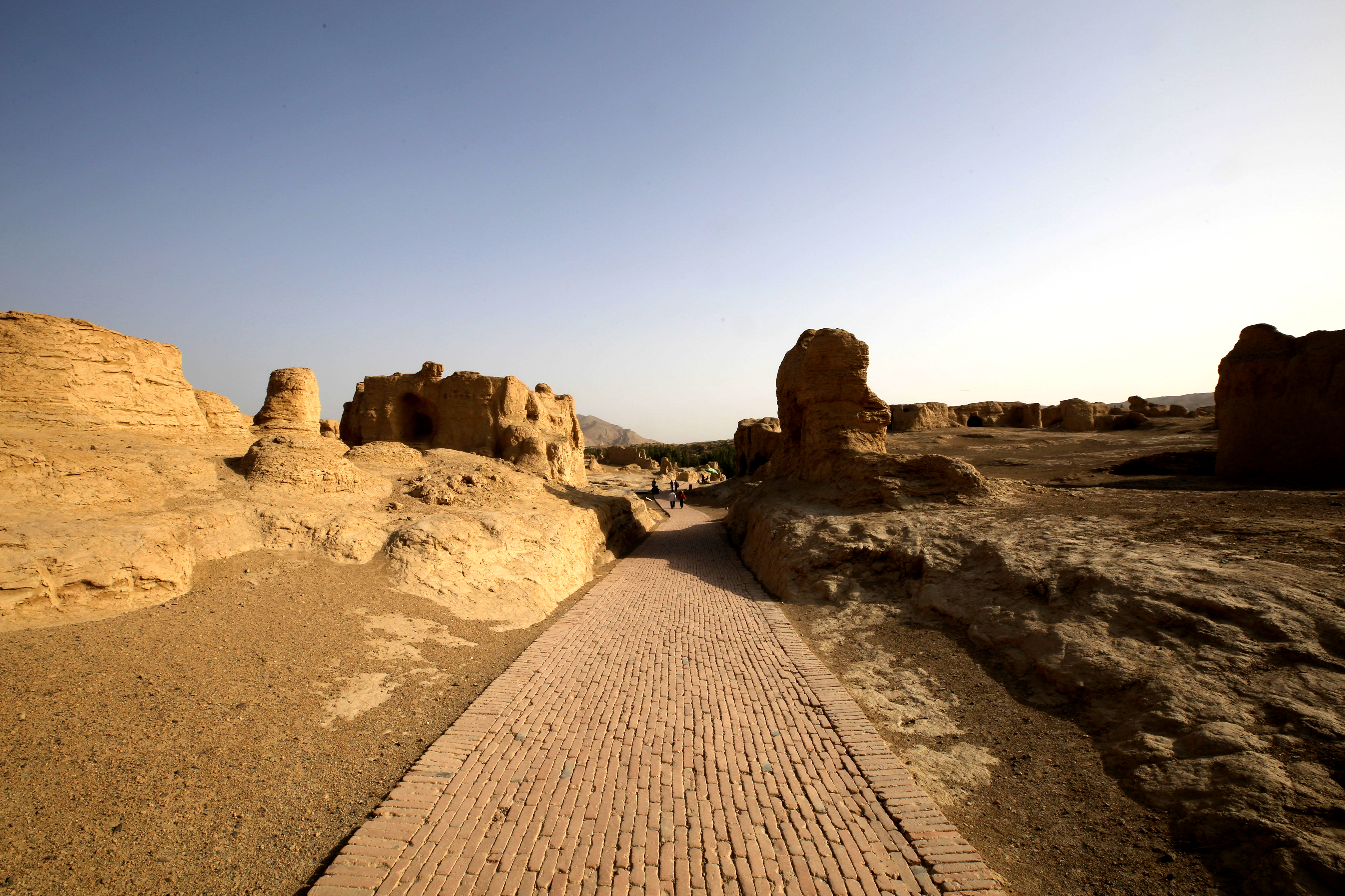 交河故城形如柳叶,一片断壁颓垣,但却是世界上最大、最古老,保存地最完好的生土建筑遗址。当初唐安西都护府的所在地。从依稀可辨的寺庙、衙署、民居的残垣断壁中,可以想见当时的繁华与热闹。47万平方米中坐落着四五座寺庙,百多座佛塔,也可以想象出当时佛教的繁盛。