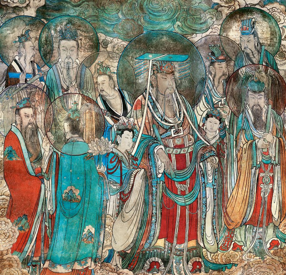 永乐宫的壁画满布在四座大殿内,壁画总面积达960平方米。《朝元图》描绘的是群仙朝谒元始天尊的情景:青龙、白虎两神为前导,南极长寿仙翁和西王母等八个主神的四周,簇拥了雷公、电母、各方星宿神及龙、蛇、猴等多位神君,另有武将、力士、玉女在旁侍奉,全图近300个神仙朝着同一个方向行进,形成了一道朝圣的洪流。在用色上,采用了传统的重彩勾填方法。