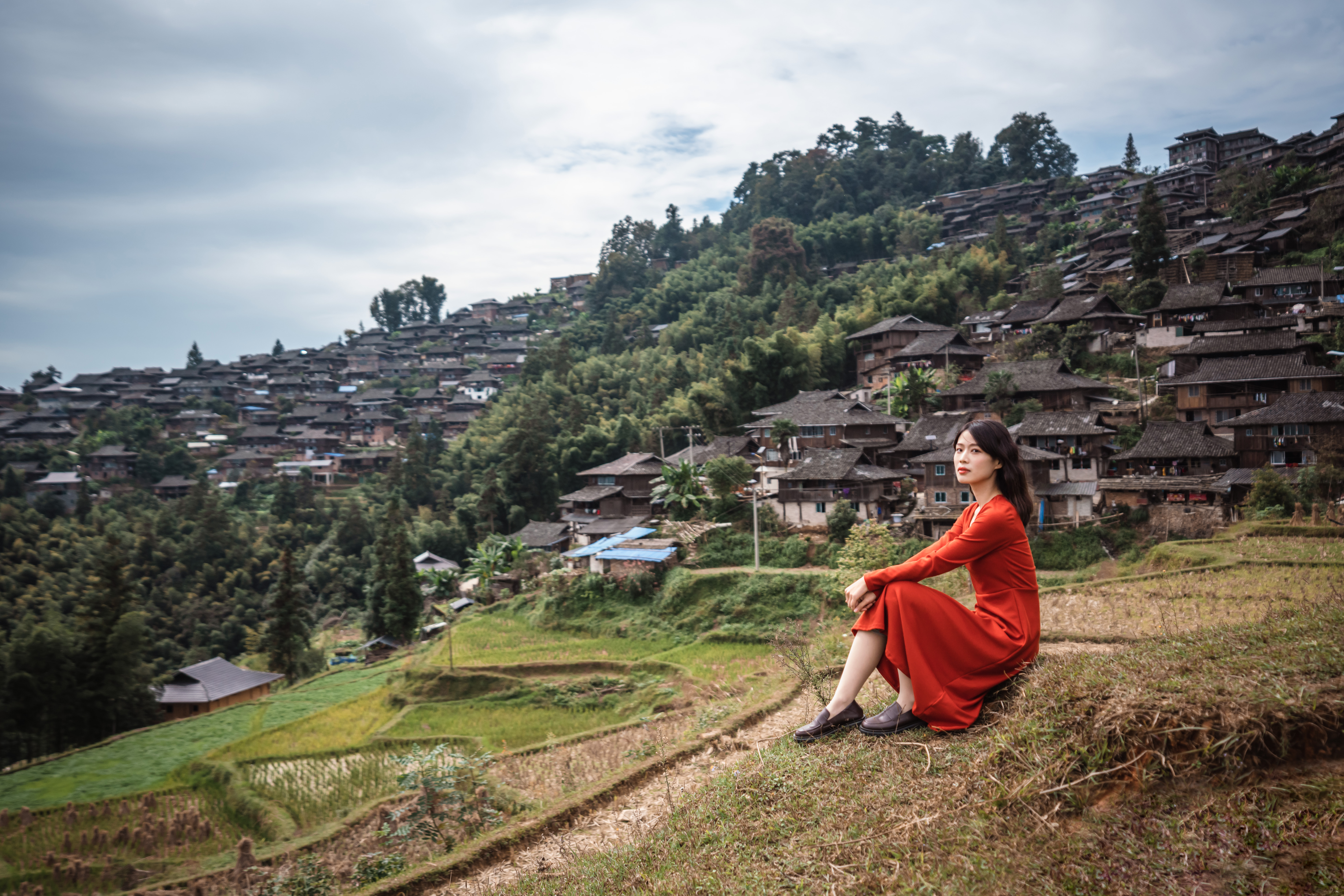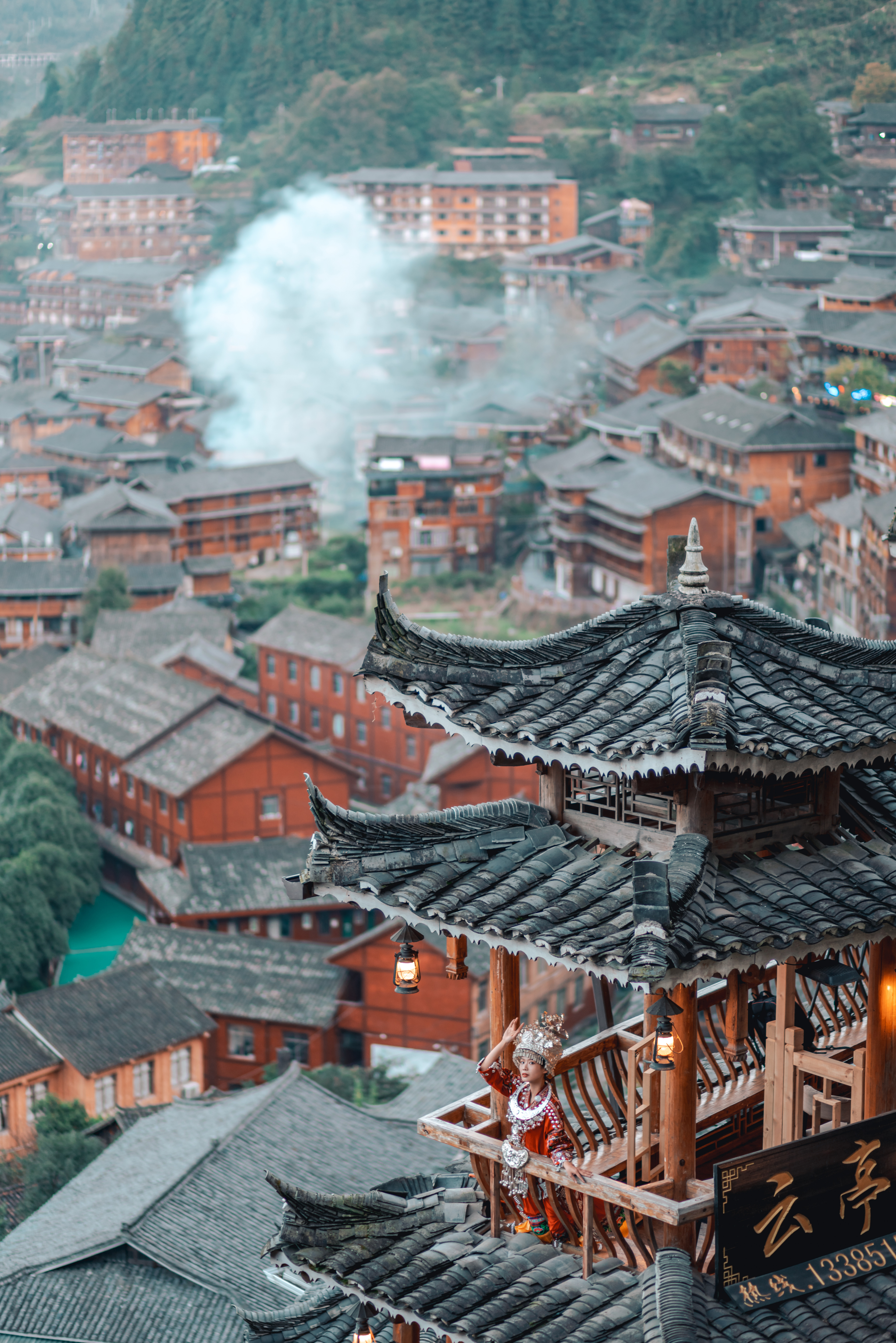 拍了几张后,张力觉得我还要穿苗服,于是我去观景台租了一套红色的。张力趁我换衣服的时间,又飞起无人机拍摄,此时寨中升起一缕青烟,正好为苗寨营造了炊烟袅袅,岁月静好的感觉。