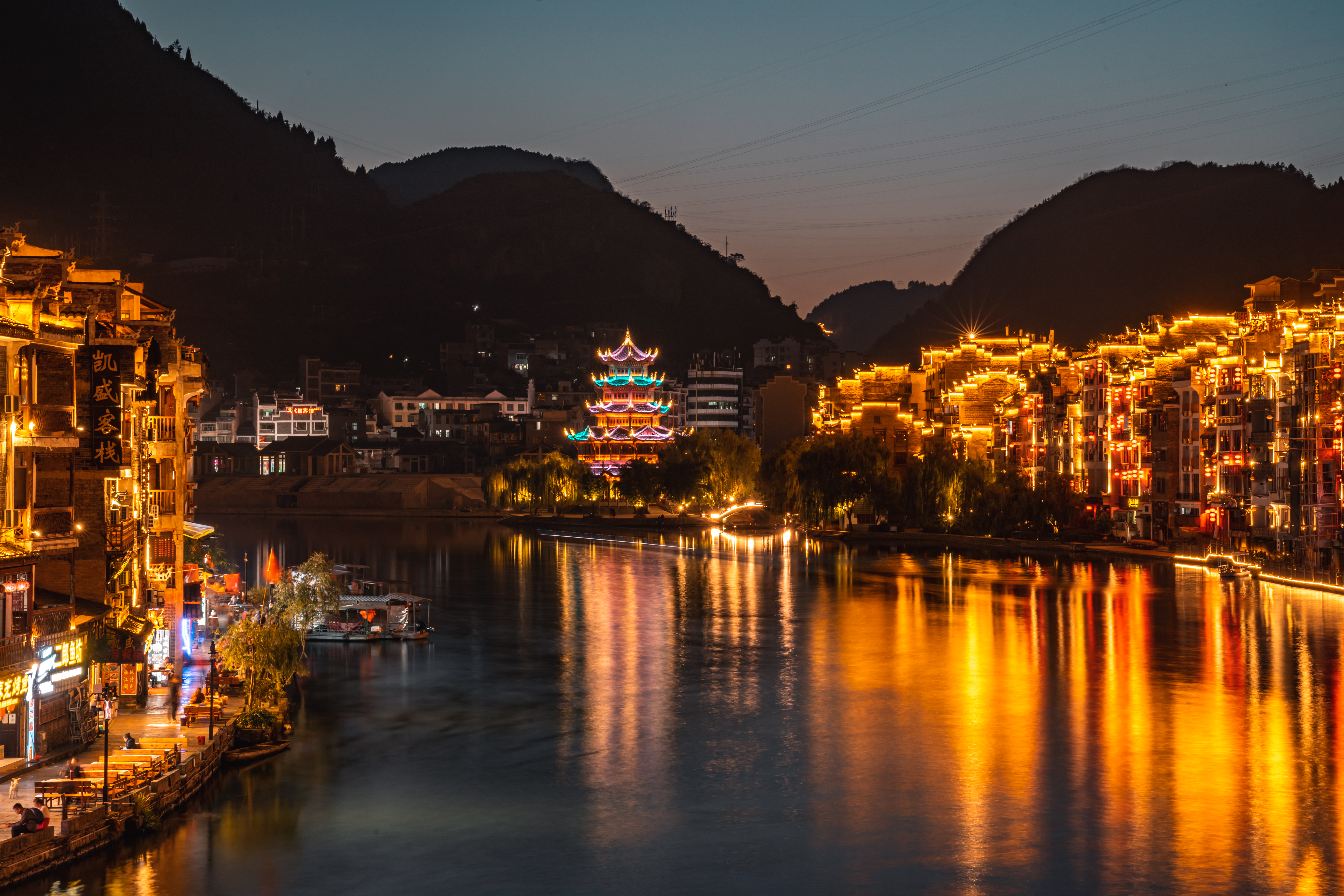 一座城,是镇远古城。远观古城,一半在山坡,一半入水中,舞阳河呈S型蜿蜒贯通全城,颇似一幅太极图。晚上河两边华灯初上,流光溢彩,古城夜空光辉而明亮。
