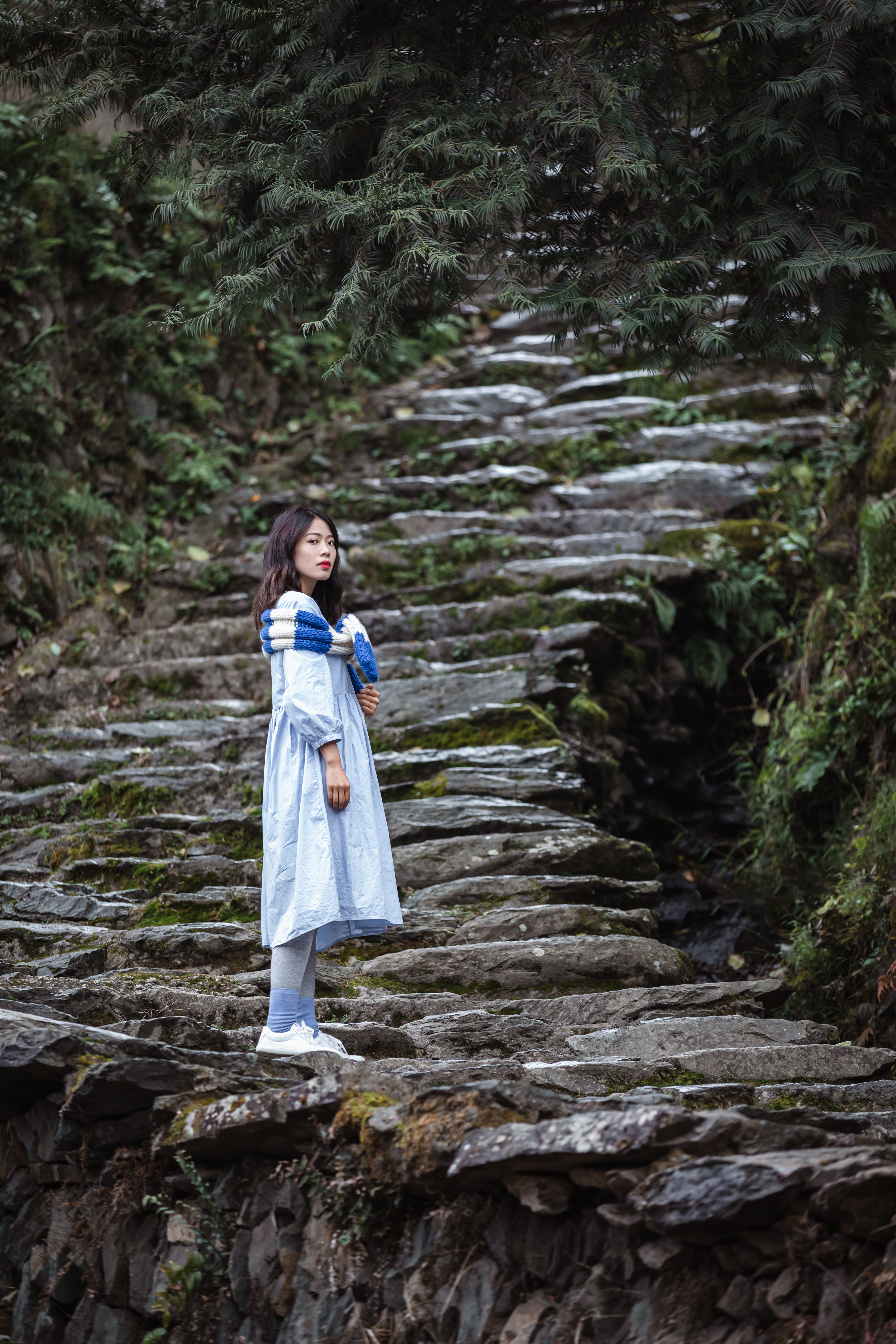 一开始我穿了自己的裙子,后来张力觉得还是要穿上苗族服饰更有味道,所以换上了一套蓝色的苗服后我们又去拍了一遍。其实我觉得我的裙子也很好看,大家都穿苗服也没有特色了。