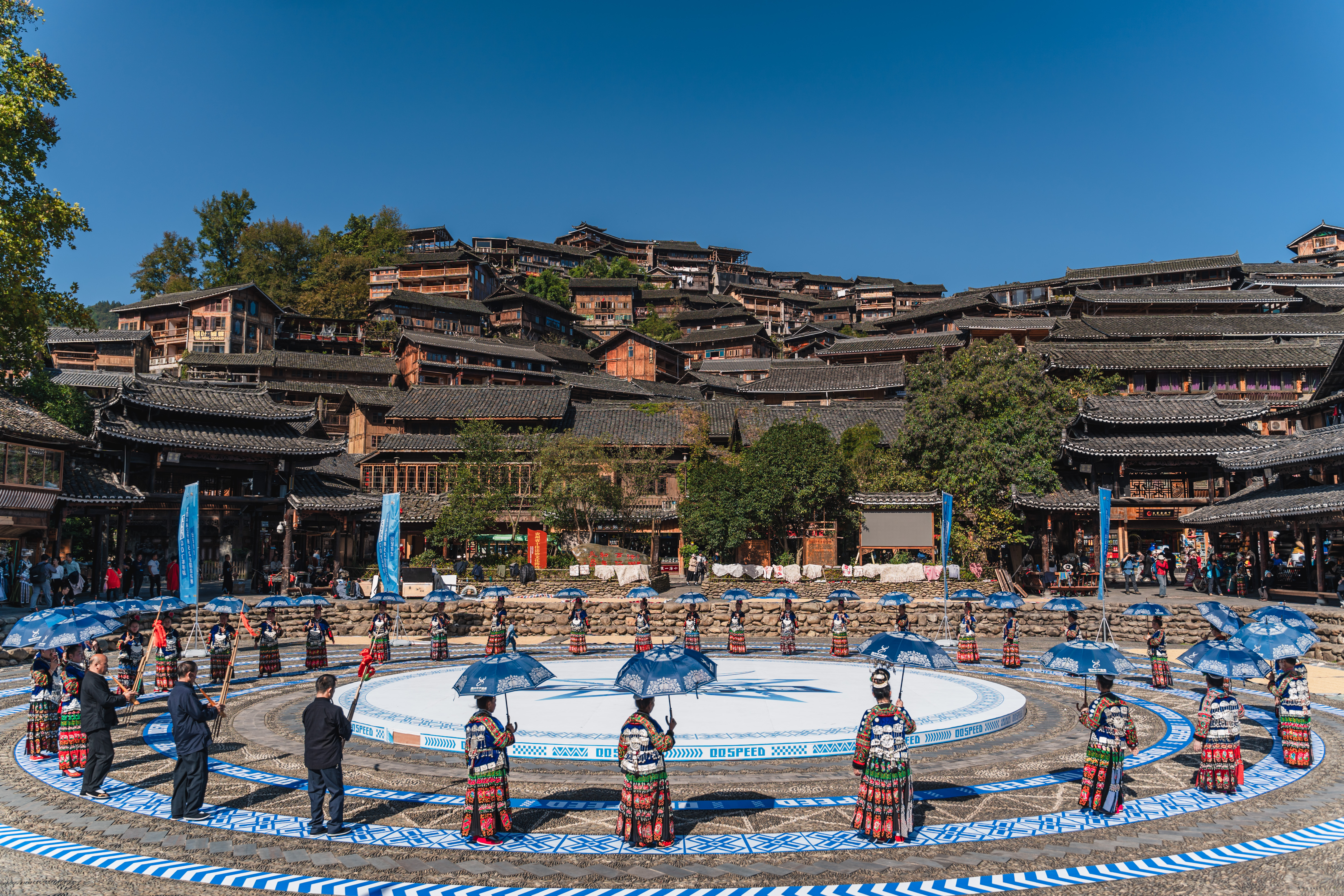经过拦门酒后,跟着表演的人沿着石板小路走进寨子中央的芦笙场。在这里可以欣赏到敬酒歌、芦笙舞、铜鼓舞、集体舞等丰富多彩的苗族歌舞。