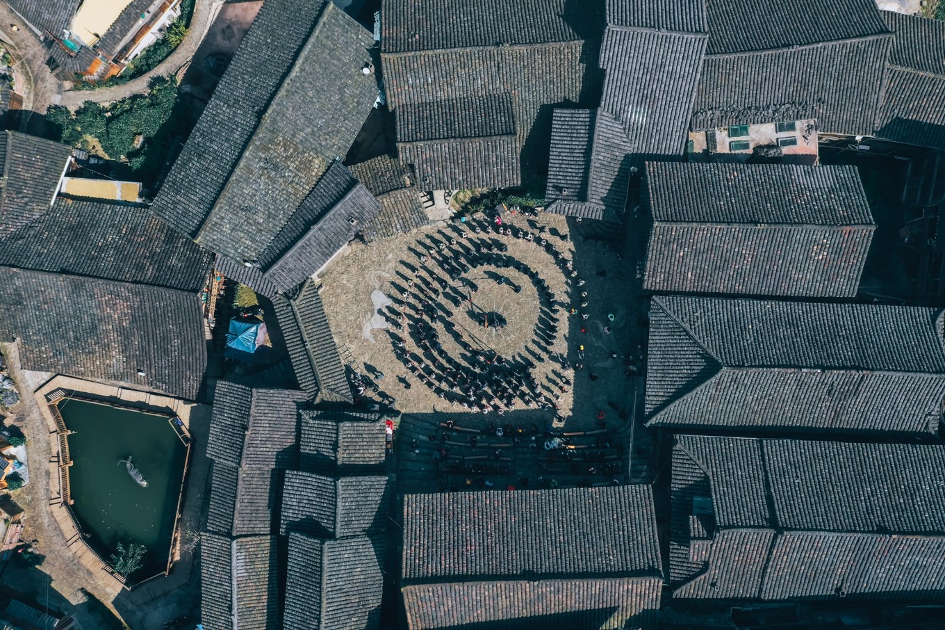 怎雷水寨分为3个寨子,上、中、下寨,以坐落于山间从上到下的位置区分。用航拍可以把三个寨子拍在一起。在水族人的眼里,最好的土地都应该用于耕种,所以他们的住房都修建在山顶上,而相对平坦的地方,用于修筑梯田,仿佛大地的调色盘。我们去的季节水稻已经收割了,所以景色没那么美了,再早些日子如果能看到金色的稻田,那一定是绝美的。