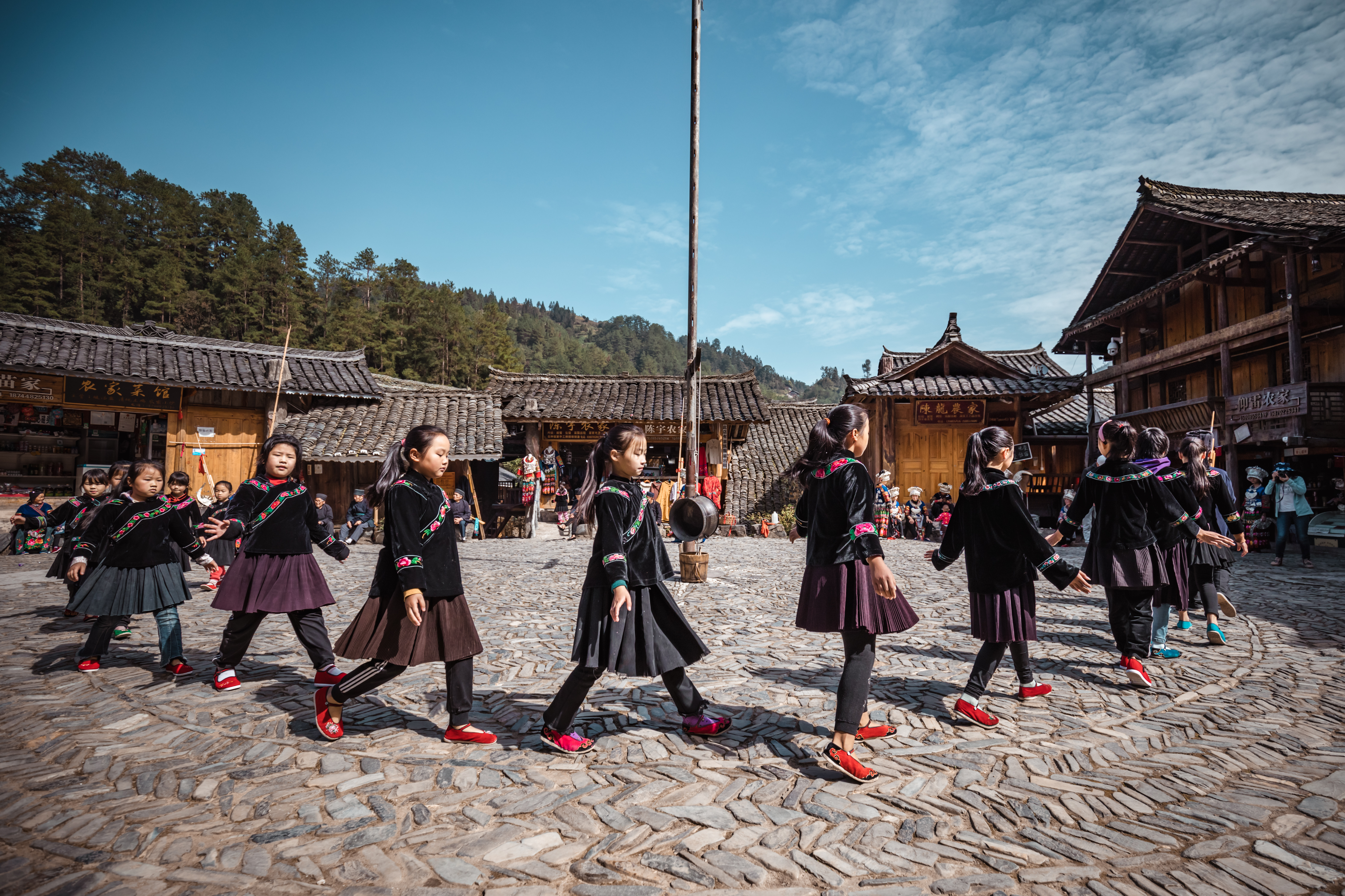 郎德上寨的小朋友们也会出来表演,围着圈跳舞。