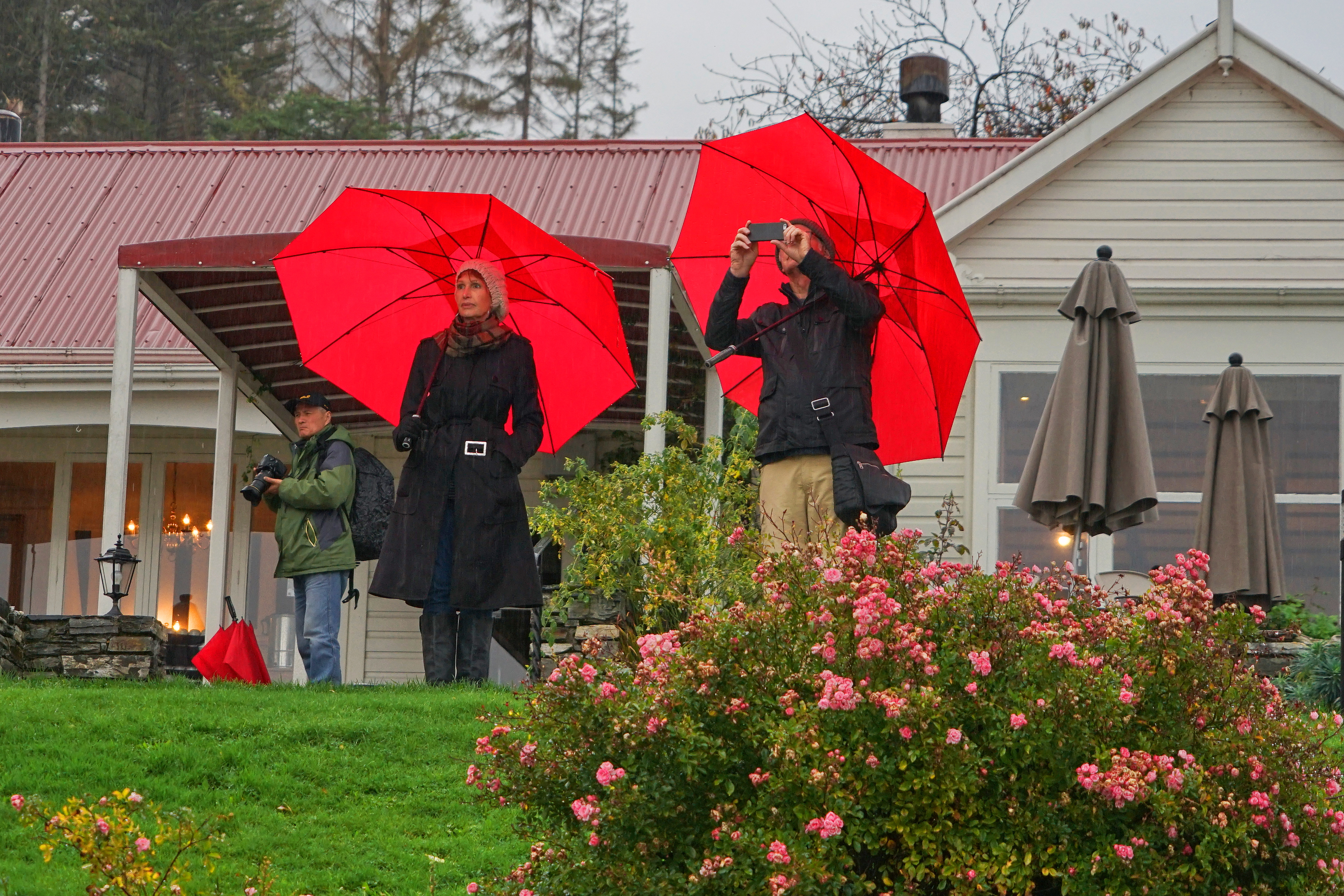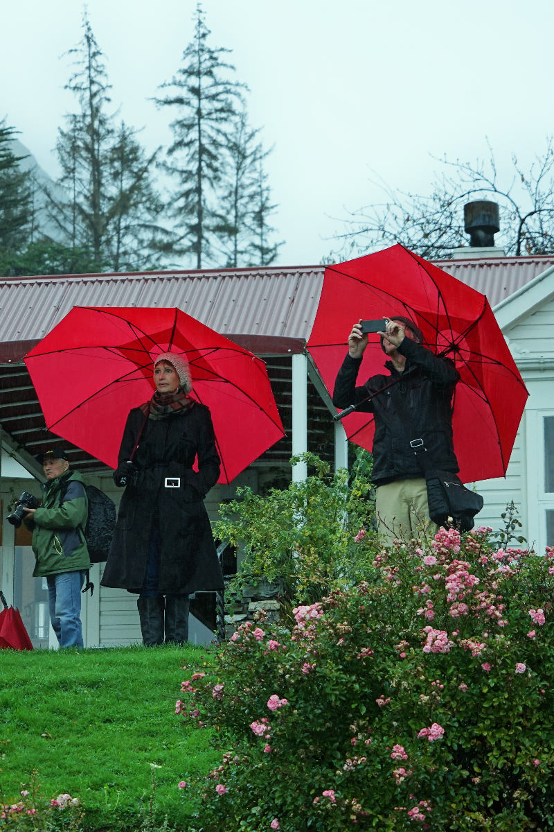 可惜下午起,一直阴雨绵绵,烟雨蒙蒙。大家纷纷撑起了牧场准备的红雨伞。