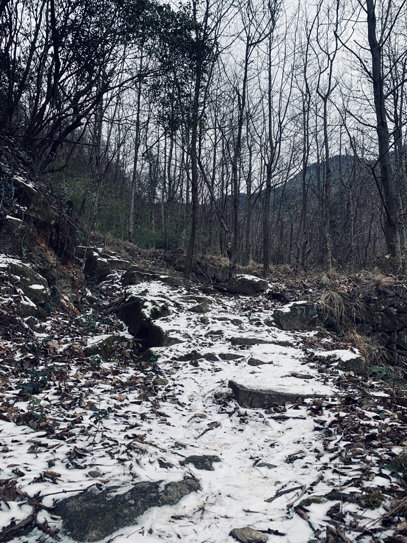 中午十二点就到了衡山西了,接着大家就在出站口集合,人齐了后就坐上我们的旅游车前往衡山啦~天气一般,阴冷冷的,也许广州的气温比较湿冷,刚到衡山就没感受到湖南冬天的严寒的…从康家垅一路向上走,沿着梵音古道一路上山,一路的景色随着海拔的升高也在变换着。初到山脚时有种似曾相识的感觉,仿佛置身于广州的白云山,周遭都是一片绿植的世界,没有严寒也没有白雪。气温随海拔每升高一百米而升零点六度,往上走,寒气扑面而来。我们一路沿着梵音古道走,然后转进衡山村里后走山间野路,没有踏足景区的大路,这也是我们游侠客不一样的走法,更能体验到原生态的衡山之旅。