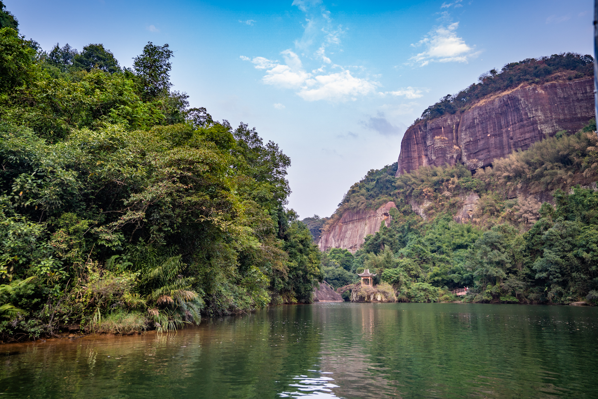 周围群山高崖与湖水组合成碧水丹山卷轴,美不胜收,沿途自然景观有三涧、六峡、九洞、十八峰。