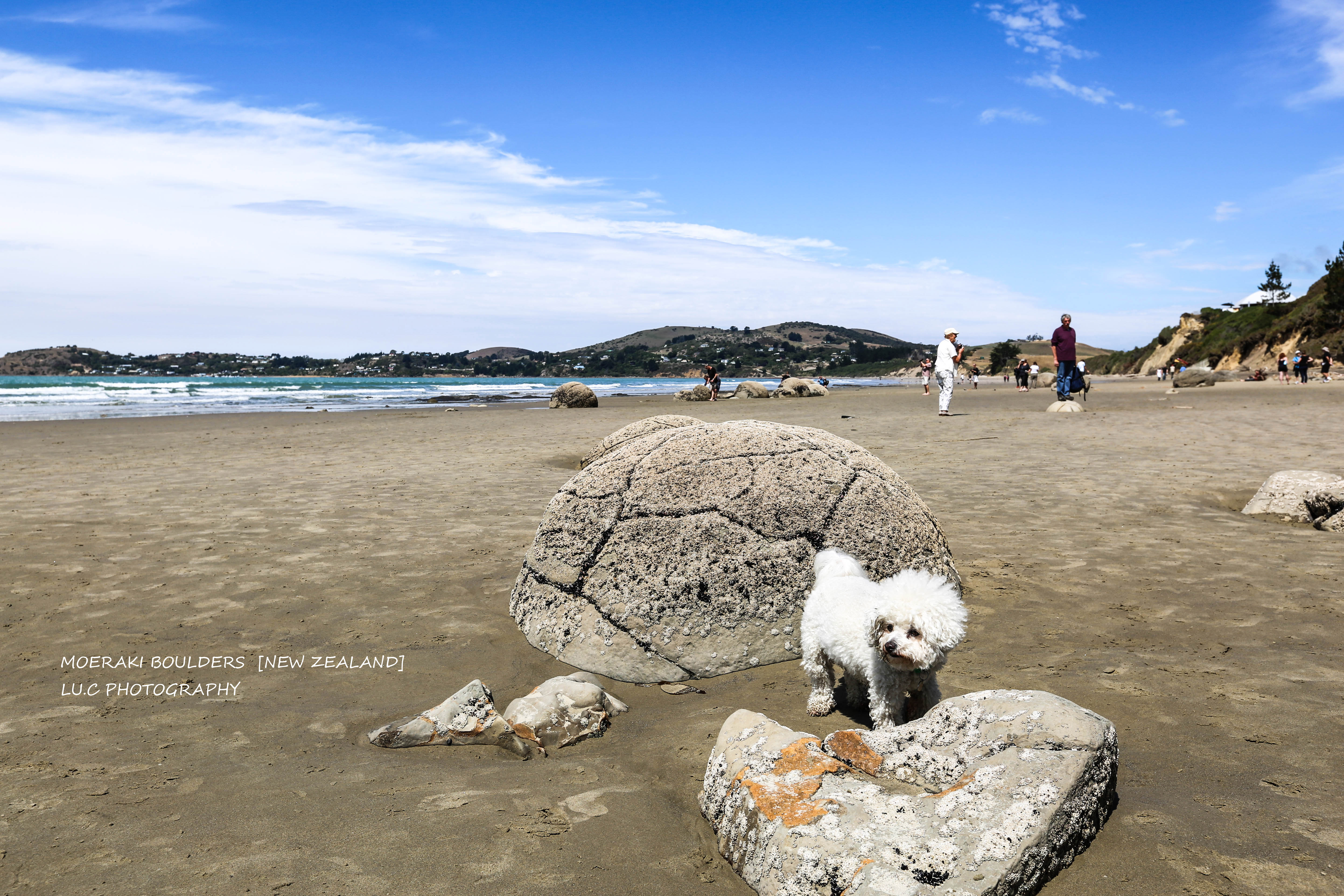 从蒂卡波湖到但尼丁会路过一个值得一去的景点——毛利基石圆石海滩(Moeraki Boulders),海滩上有好几颗巧克力球一样的圆形石头,涨潮的时候海水会淹没一部分石头,看那个时候的照片很有意思,可惜现在没有涨潮于是石头就这样赤裸裸地戳在沙滩上= =