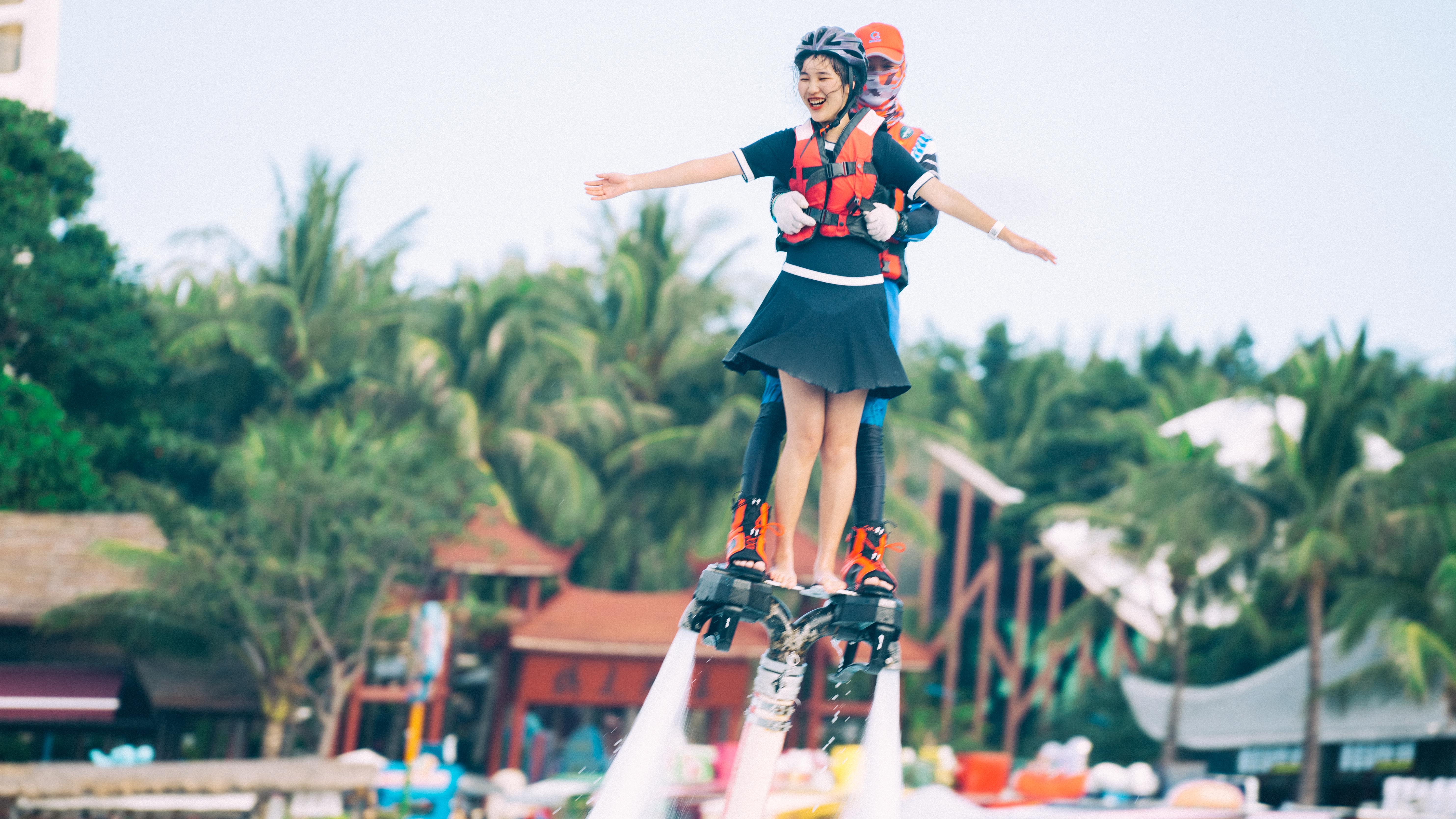 工作人员叫着我过去,踩着甲板一大阔步便走到带我空中飞翔的大哥身边。没有多余的想法,一切听大哥的指挥,一边嘱咐我“穿好救生衣,带好头盔,就算掉下去也很浮起来的”,一边安抚我紧张的情绪“小妹妹,不用紧张,这个平衡是我控制的,你可以放心踩着下面的板子就可以!”