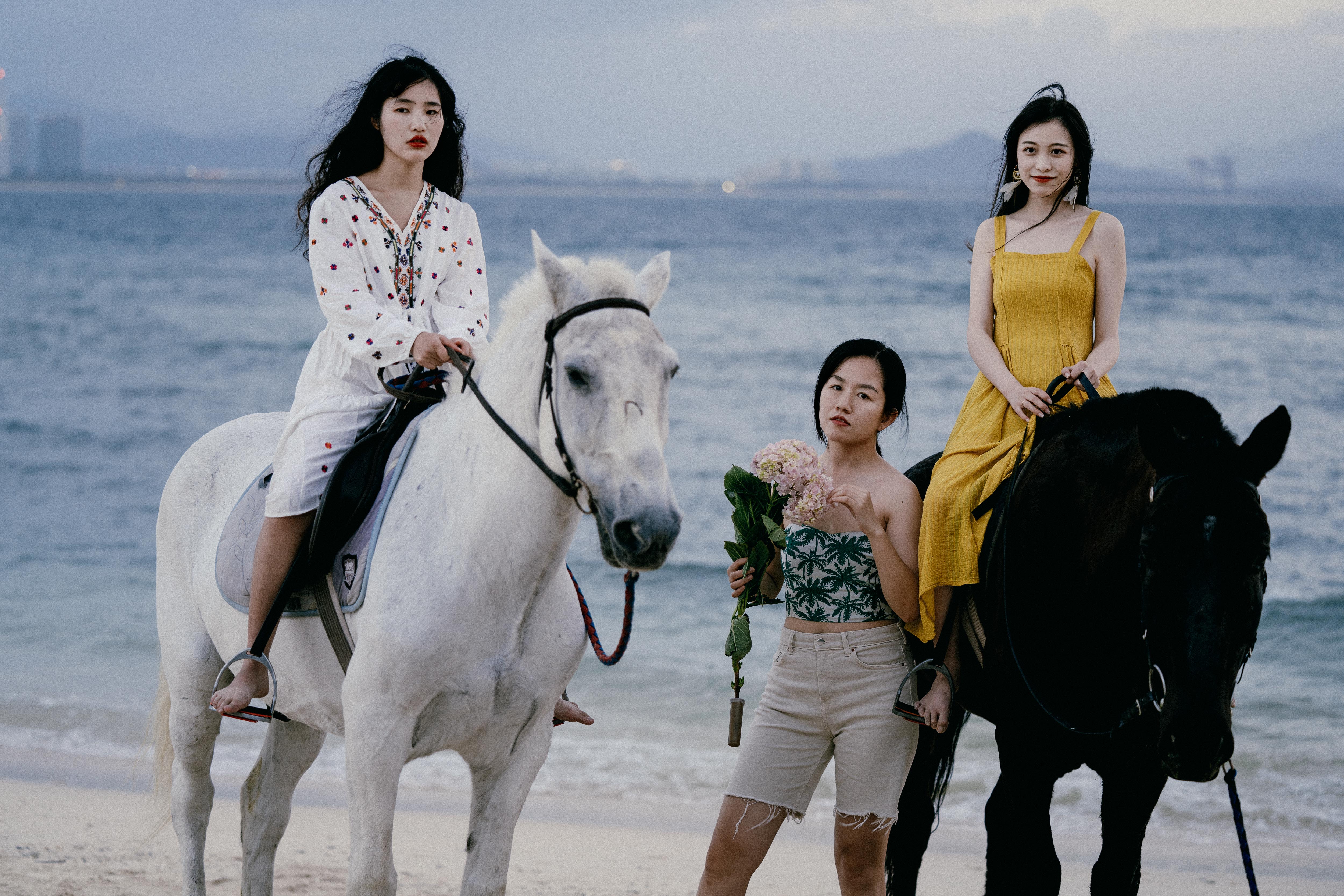 工作人员牵来一匹棕马,在心着一身黄裙骑上马。又牵来一匹白马,扔下手中的东西,我也骑上马,小白马很乖,载着我在海边慢步走。而后又来一匹棕马,潘太太也上了马。三个女生在马背上凹凸着造型,辛苦大菊、砸缸、young哥、包子在下面拍照了。