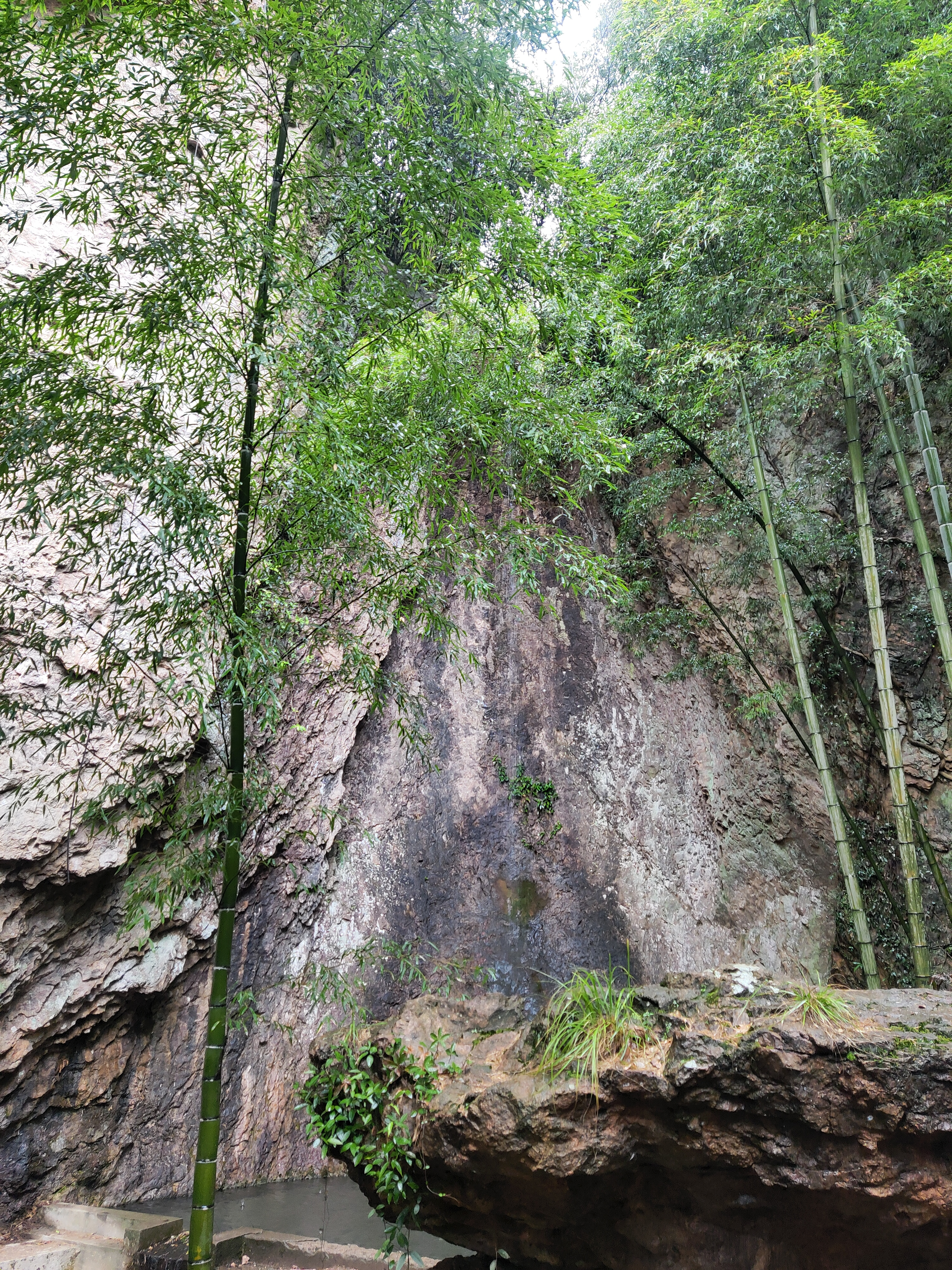 此地山色青翠云雾清奇竹林幽深潭水如碧,是一处休闲徒步的好去处