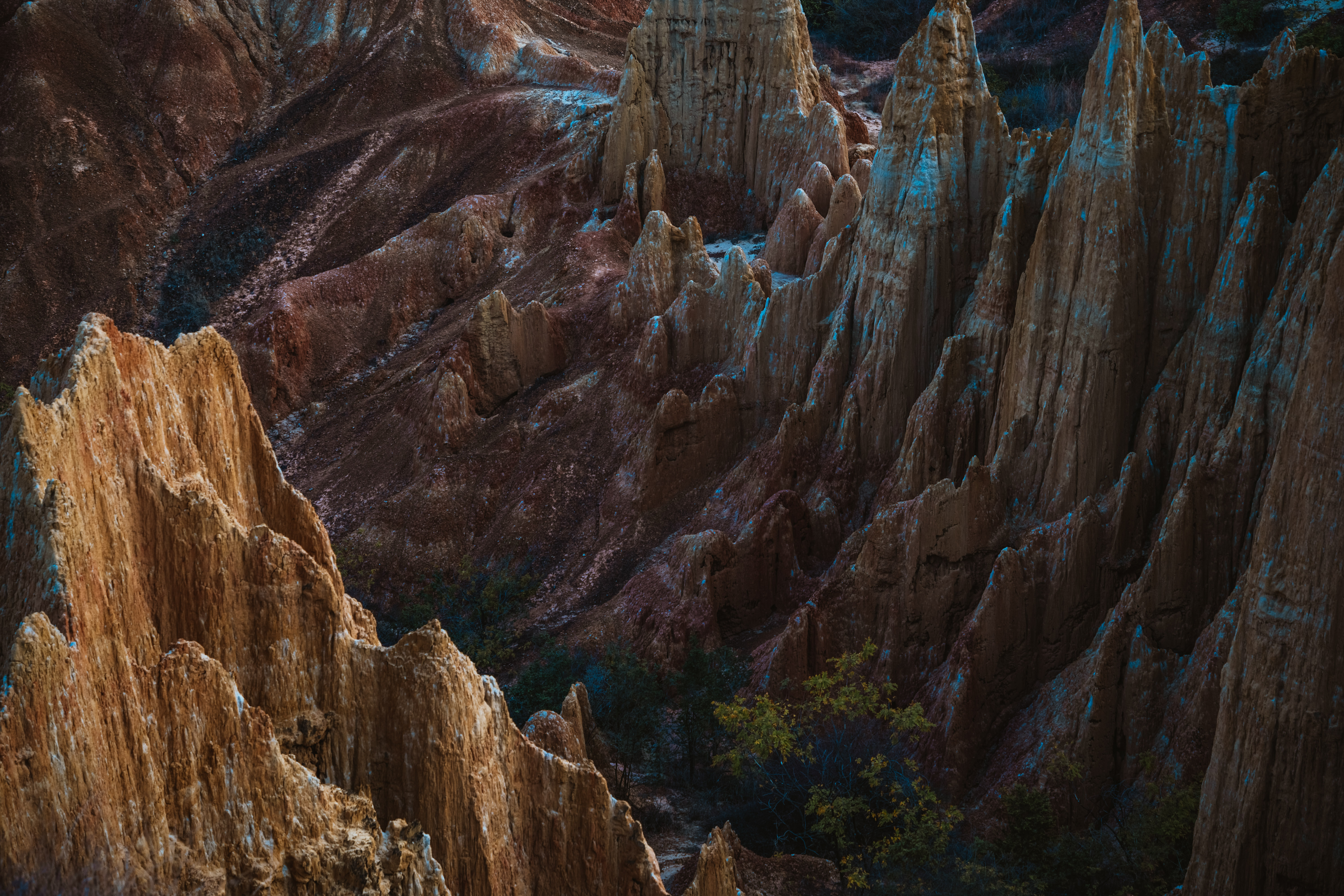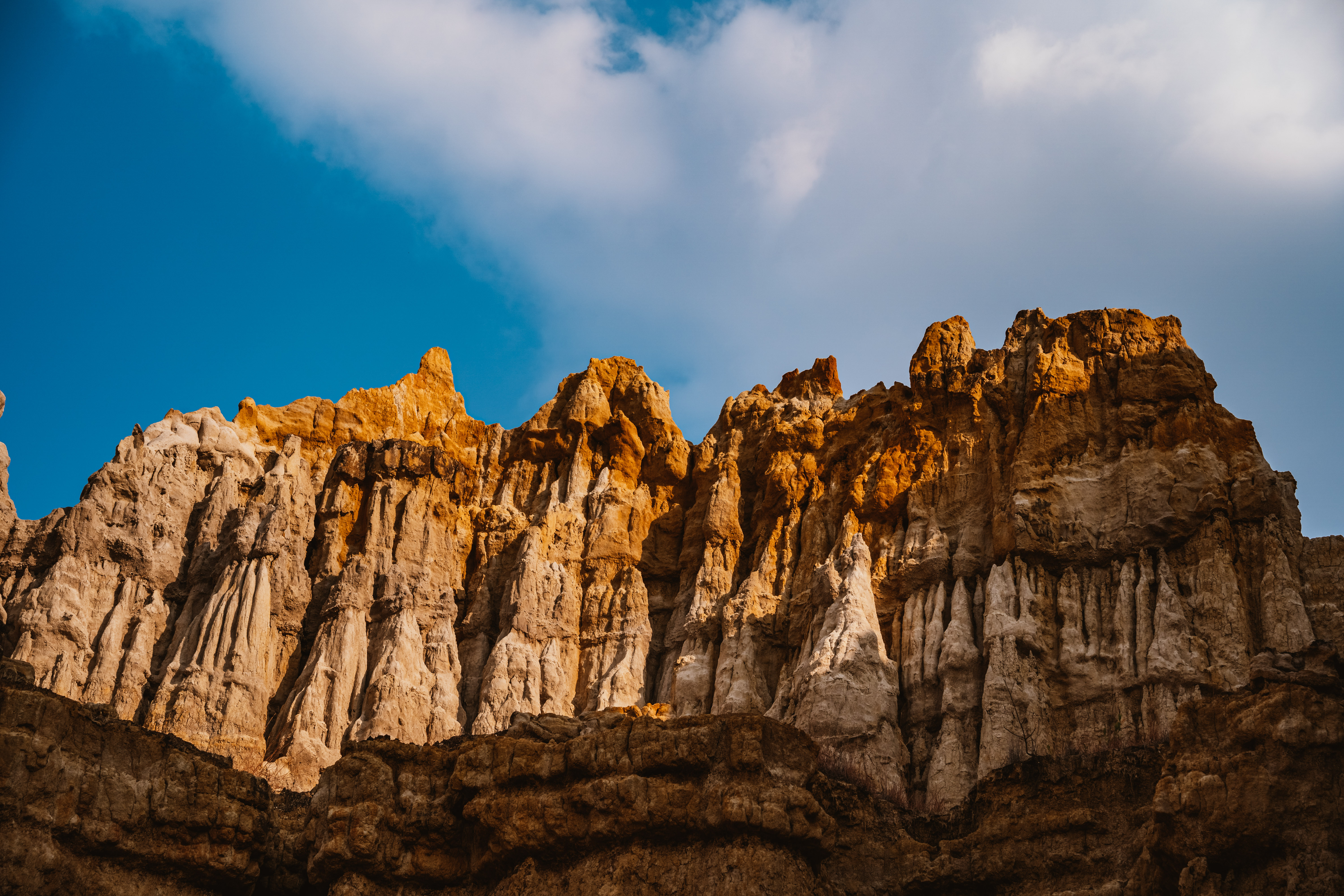 有的如锥似剑,直指蓝天;有的像威严武士,整装待发;有的如亭亭少女,凝视远方;有的土柱顶上杂草丛生,间或长有野花;有的砂石垒垒,裸露身躯……这些土林多由沙粒、粘土组成,在阳光的照耀下,光彩夺目。那是古城堡,那是殿宇,那是宝塔,那是巨剑冲天,那是刀脊横地,那是展翅欲飞的雄鹰,那是奔驰的骏马,那是戴头盔的纠纠卫士,还有"玉女观云"、"母子偕游"的立体群像,真可谓鬼斧神工,令人叹为观止。