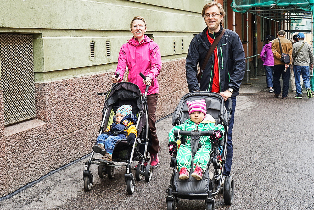 父母推着他们的孩子,悠闲的逛着街。芬兰的奶爸不少呦!