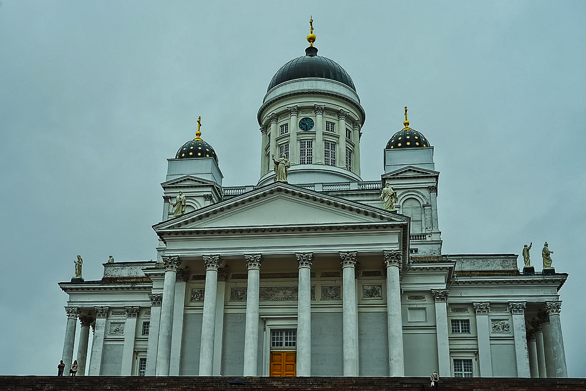 芬兰 的 赫尔辛基 大教堂建于1828—1832年,原名为路德大教堂,又称尼古拉斯大教堂。现今成为 赫尔辛基 的标志性建筑。新古典式的绿色圆顶大穹顶,优雅地立在高地上,高大的塔楼四周环绕 科林斯 式白色 大理 石立柱,屋顶上有12使徒像。十分醒目。教堂位于 芬兰 议会广场上。议会广场是 赫尔辛基 老城中心,大教堂是当地福音路德教会做礼拜的场所。 芬兰 人中90%的人信奉基督教路德派新教。