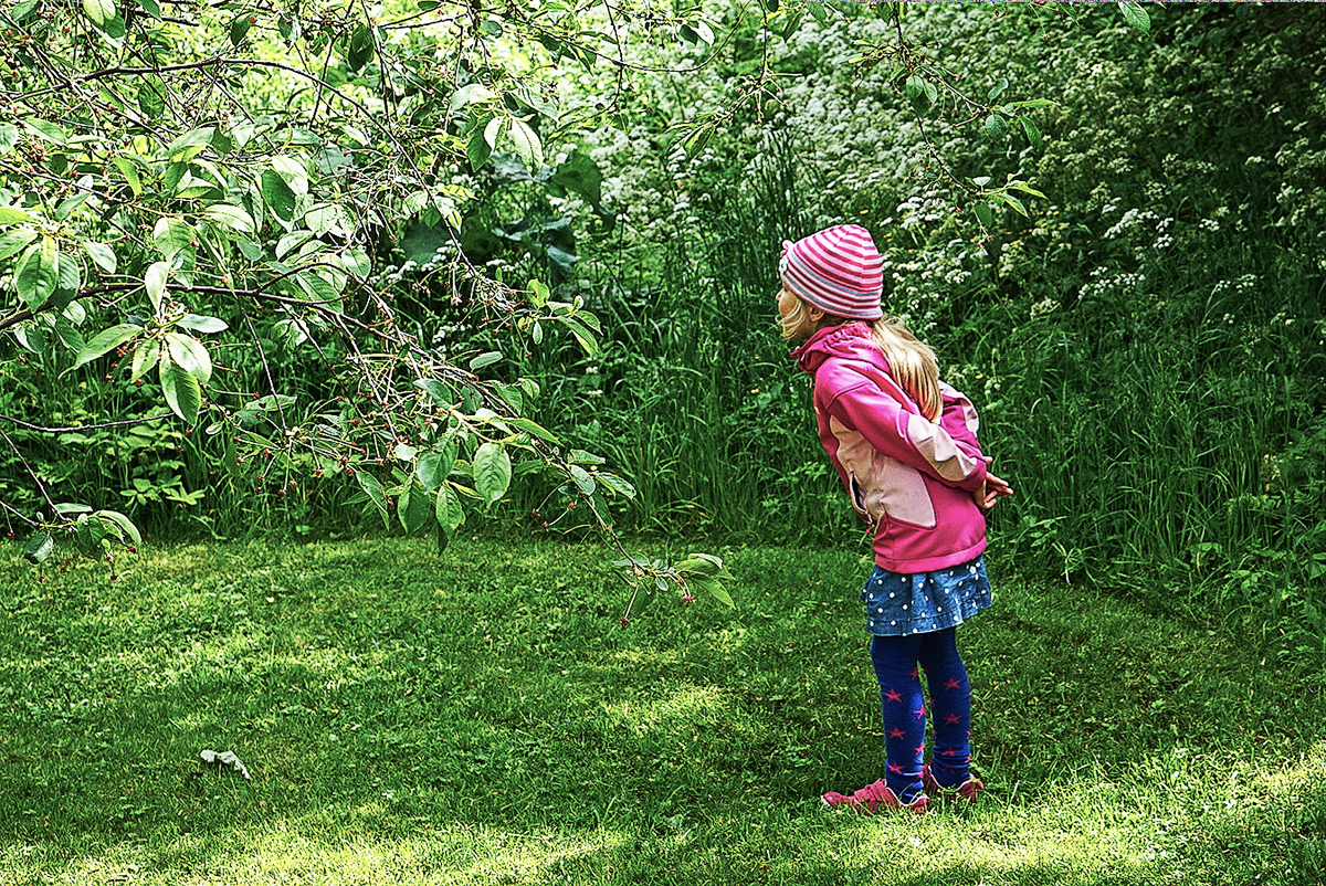 可以想象,椅子上坐着父母或老人,秋千上孩子们在玩耍的情景。