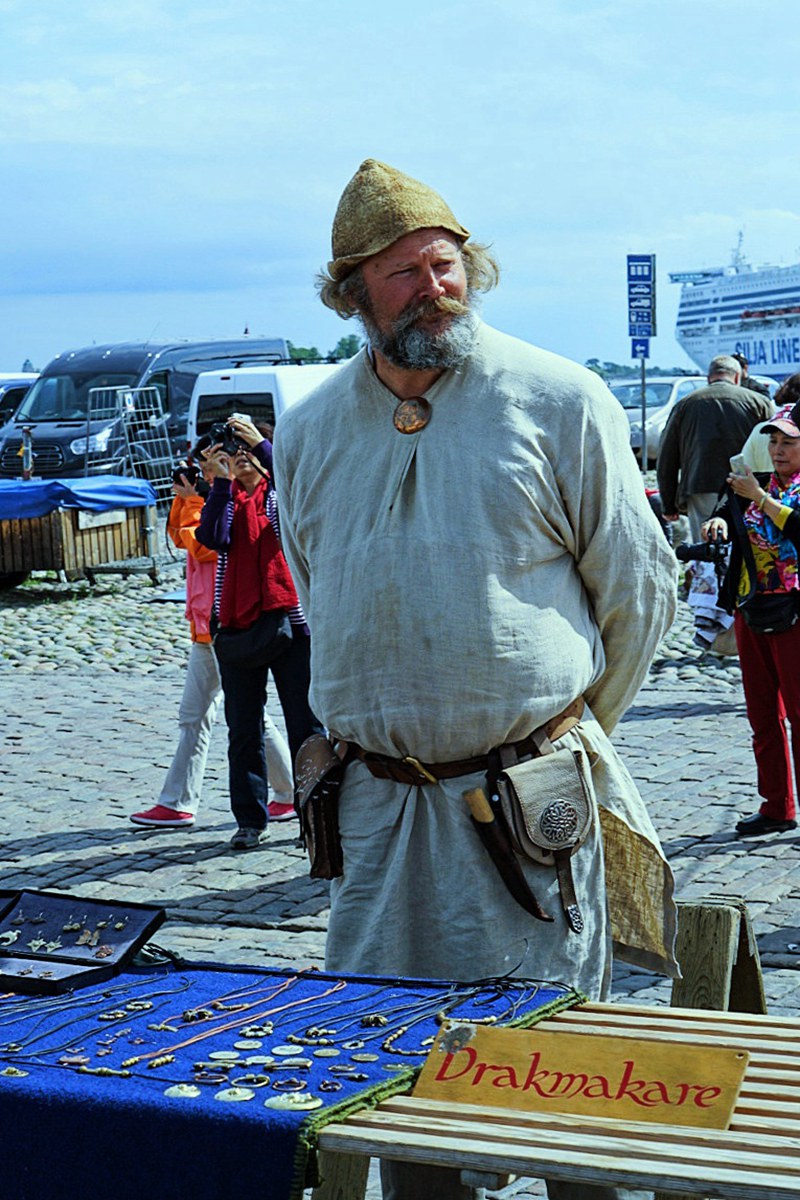 人高马大的 芬兰 大叔,在露天市场上出售他的小小饰品。。。