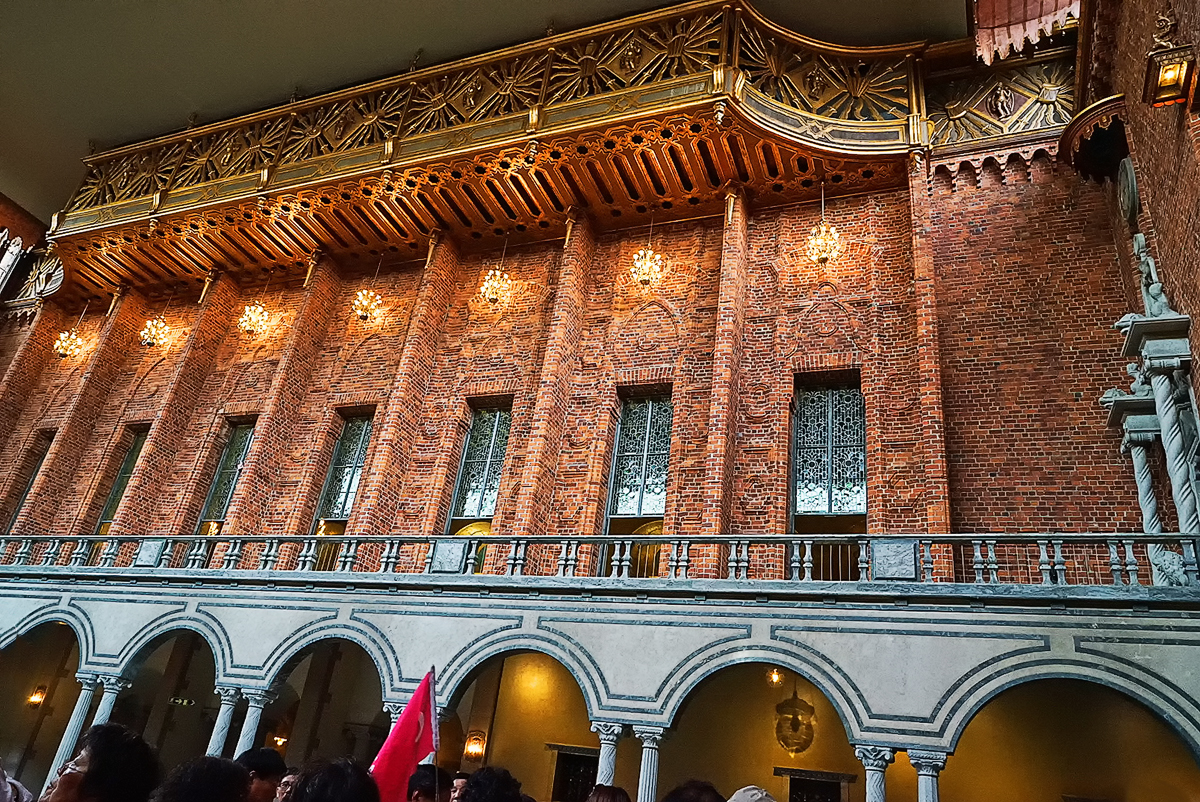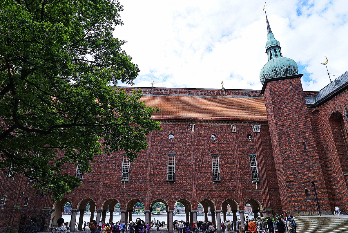 斯德哥尔摩 市政厅-------建于1911年,历时12年才完成,是 瑞典 建筑中最重要的作品。俯瞰蓝色大厅市政厅内有巨大的宴会厅。宴会厅也有“蓝厅”的誉称。每年的12月10日诺贝尔逝世日。这一天,诺贝尔奖金颁发后, 瑞典 国王和王后都要在宴会厅,为诺贝尔奖获得者举行隆重盛大的宴会,表示热烈的祝贺。